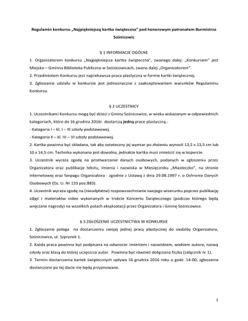 Regulamin konkursu „Najpiękniejszą kartka świąteczna” pod honorowym patronatem Burmistrza Sośnicowic § 1 INFORMACJE OGÓLNE 1. Organizatorem konkursu „Najpiękniejsza kartka świąteczna”, zwanego dalej: „Konkursem” jest Miejsko – Gminna Biblioteka Publiczna w Sośnicowicach, zwana dalej „Organizatorem”. 2. Przedmiotem Konkursu jest najciekawsza praca plastyczna w formie kartki świątecznej. 3. Zgłoszenie udziału w konkursie jest jednoznaczne z zaakceptowaniem warunków Regulaminu Konkursu. § 2 UCZESTNICY 1. Uczestnikami Konkursu mogą być dzieci z Gminy Sośnicowice, w wieku wskazanym w odpowiednich kategoriach, które do 16 grudnia 2016r. dostarczą jedną prace plastyczną.: - Kategoria I – kl. I – III szkoły podstawowej. - Kategoria II – kl. IV – VI szkoły podstawowej. 2. Kartka powinna być składana, tak aby ostateczny jej wymiar po złożeniu wynosił 13,5 x 13,5 cm lub 10 x 14,5 cm. Technika wykonana jest dowolna, jednakże kartka musi zmieścić się w kopercie. 3. Uczestnik wyraża zgodę na przetwarzanie danych osobowych, podanych w zgłoszeniu przez Organizatora oraz publikacje tekstu, imienia i nazwiska w Miesięczniku „Miasteczko”, na stronie internetowej oraz fanpagu Organizatora - zgodnie z Ustawą z dnia 29.08.1997 r. o Ochronie Danych Osobowych (Dz. U. Nr 133 poz.883). 4. Uczestnik wyraża zgodę na (nieodpłatne) rozpowszechnianie swojego wizerunku poprzez publikację zdjęć i materiałów video wykonanych w trakcie Koncertu Świątecznego (podczas którego będą wręczane nagrody) na wszelkich polach eksploatacji przez Organizatora i Gminę Sośnicowice. § 3 ZGŁOSZENIE UCZESTNICTWA W KONKURSIE 1. Zgłoszenie polega na dostarczeniu swojej jednej pracy plastycznej do siedziby Organizatora, Sośnicowice, ul. Szprynek 1. 2. Każda praca powinna być podpisana na odwrocie: imieniem i nazwiskiem, wiekiem autora, nazwą szkoły oraz klasą do której uczęszcza autor. Powinna być również dołączona fiszka (załącznik nr 1). 3. Termin dostarczenia kartek świątecznych upływa 16 grudnia 2016 roku o godz. 14:00, zgłoszenia dostarczone po tej dacie nie będą przyjmowane. 1 § 4 WYŁONIENIE LAUREATÓW 1. Celem zapewnienia prawidłowej organizacji i przebiegu Konkursu, a w szczególności w celu dokonania oceny prawidłowości zgłoszeń do Konkursu, Organizator powoła trzyosobową Komisję Konkursową, zwaną dalej „Komisją Konkursową”. 2. Zwycięzcą Konkursu, zwanym dalej: „Zwycięzcą” jest ten z Laureatów, którego praca została przez Komisje Konkursową uznana za najlepszą. § 5 NAGRODY 1. Nagrodą w Konkursie jest: a) laureaci trzech pierwszych miejsc, dwóch kategorii wiekowych, otrzymają nagrody książkowe oraz dyplomy. 2. Ogłoszenie wyników i wręczenie nagród laureatom odbędzie się podczas „Koncertu Świątecznego”, 7 stycznia 2017r., w Sali Konferencyjnej przy Bibliotece w Sośnicowicach, ul. Szprynek 1. 3. Najciekawsze prace będą opublikowane na stronach Organizatora oraz wystawione w patio Organizatora. § 6 UWAGI KOŃCOWE 1. Nagrodzone w konkursie prace przechodzą na własność organizatorów. 2. Prace nienagrodzone można odebrać w siedzibie Biblioteki po zakończeniu wystawy (styczeń 2017). 3. Organizatorzy zastrzegają sobie prawo do reprodukowania prac w celach popularyzatorskich. Załącznik nr 1: Imię i nazwisko autora pracy Wiek Nazwa szkoły Klasa Imię i nazwisko opiekuna z ramienia szkoły 2