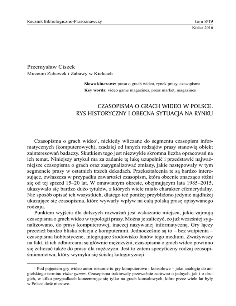 Rocznik Bibliologiczno-Prasoznawczy tom 8/19 Kielce 2016 Przemysław Ciszek Muzeum Zabawek i Zabawy w Kielcach Słowa kluczowe: prasa o grach wideo, rynek prasy, czasopisma Key words: video game magazines, press market, magazines CZASOPISMA O GRACH WIDEO W POLSCE. RYS HISTORYCZNY I OBECNA SYTUACJA NA RYNKU Czasopisma o grach wideo1, niekiedy wliczane do segmentu czasopism informatycznych (komputerowych), rzadziej od innych rodzajów prasy stanowią obiekt zainteresowań badaczy. Skutkiem tego jest niezwykle skromna liczba opracowań na ich temat. Niniejszy artykuł ma za zadanie tę lukę uzupełnić i przedstawić najważniejsze czasopisma o grach oraz zasygnalizować zmiany, jakie następowały w tym segmencie prasy w ostatnich trzech dekadach. Przekształcenia te są bardzo interesujące, zwłaszcza w przypadku zawartości czasopism, która obecnie znacząco różni się od tej sprzed 15–20 lat. W omawianym okresie, obejmującym lata 1985–2015, ukazywało się bardzo dużo tytułów, z których wiele miało charakter efemerydalny. Nie sposób opisać ich wszystkich, dlatego też poniżej przybliżono jedynie najdłużej ukazujące się czasopisma, które wywarły wpływ na całą polską prasę opisywanego rodzaju. Punktem wyjścia dla dalszych rozważań jest wskazanie miejsca, jakie zajmują czasopisma o grach wideo w typologii prasy. Można je zaliczyć, co już wcześniej sygnalizowano, do prasy komputerowej, inaczej nazywanej informatyczną. Gry łączy przecież bardzo bliska relacja z komputerami. Jednocześnie są to – bez wątpienia – czasopisma hobbistyczne, integrujące środowisko fanów tego medium. Zważywszy na fakt, iż ich odbiorcami są głównie mężczyźni, czasopisma o grach wideo powinno się zaliczać także do prasy dla mężczyzn. Jest to zatem specyficzny rodzaj czasopiśmiennictwa, który wymyka się ścisłej kategoryzacji. 1 Pod pojęciem gry wideo autor rozumie tu gry komputerowe i konsolowe – jako analogię do angielskiego terminu video games. Czasopisma traktowały przeważnie zarówno o jednych, jak i o drugich, w kilku przypadkach koncentrując się tylko na grach konsolowych, które przez wiele lat były w Polsce dość niszowe. 84 Przemysław Ciszek Czasopisma dotyczące gier wideo ukazywały się w USA i Europie Zachodniej już na początku lat osiemdziesiątych XX w. Z uwagi na specyfikę epoki PRL, komputery (a zarazem i gry) rozpowszechniły się w Polsce później. Przełożyło się to na rynek prasy poświęconej temu tematowi. Cechą charakterystyczną polskiego rynku gier wideo jest dominacja komputerów PC jako głównej platformy służącej do grania. Według badań aż 98% graczy używa tego sprzętu2. Warto jednak zaznaczyć, że nie wyklucza to jednoczesnego wykorzystywania przez nich innych platform. Konsole do gier – rozpowszechnione w USA i Europie Zachodniej już w połowie lat osiemdziesiątych XX w. – w naszym kraju długo walczyły o należne miejsce na rynku i w świadomości graczy. Wynikało to z wysokiej ceny samego sprzętu oraz gier, a także ich trudniejszej dostępności. Pierwsze czasopisma tylko o grach konsolowych pojawiły się dopiero w 1997 r., a były to „Oficjalny Polski PlayStation Magazyn”, „PSX Extreme” oraz „NEO”. Począwszy od 1985 r. rozwój tych czasopism w Polsce można podzielić na kilka etapów: – początki (1985–1990), – gwałtowny rozwój (1990–2002), – powolny regres (2002–2012), – stabilizacja (2012–dziś). Granice nie są jednak sztywne i można zastosować także inne podziały. Poniżej przedstawione zostaną informacje o najważniejszych polskich periodykach dotyczących gier wideo. Analiza bazować będzie na przedstawionej wyżej periodyzacji. Początki Pionierem, jeśli chodzi o pisanie o grach wideo w ogóle, był „Bajtek”. Pismo pojawiło się na rynku we wrześniu 1985 r. jako dodatek do dziennika „Sztandar Młodych” oraz tygodnika „Odrodzenie”, pierwszego popularnego magazynu poświęconego informatyce. Jego celem było, jak napisali redaktorzy naczelni, „zwalczanie analfabetyzmu mikrokomputerowego w Polsce”3. Magazyn skierowano, podobnie jak czasopisma macierzyste, do młodzieży. Mimo iż „Bajtek” poruszał głównie tematy dalece bardziej skomplikowane niż gry, znajdowała się w nim rubryka Co jest grane4, w której opisywano najnowsze produkcje oraz zamieszczano rysowane poradniki ułatwiające przejście poszczególnych gier. Cechą charakterystyczną „Bajtka” był podział treści na „klany” użytkowników różnych, popularnych wówczas komputerów (C64, Atari, Amstrad). W 1987 r. ukazał się numer specjalny o podtytule 7 wspaniałych gier, liczył 16 stron i zawierał krótkie opisy gier oraz kolorowe mapy. http://www.newzoo.com/infographics/infographic-polish-games-market/ [dostęp: 17.11.2015]. Z. Siedlecki, W. Siwiński, RUN czyli zaczynamy, „Bajtek” 1985, nr 1, s. 2. 4 http://zapach-papieru.strefa.pl/pisma-o-grach/bajtek.html [dostęp: 25.10.2015]. 2 3 Czasopisma o grach wideo w Polsce 85 Było to pierwsze w Polsce wydanie jakiegokolwiek pisma dotyczącego tylko i wyłącznie gier. W 1990 r. tytuł stał się odrębnym miesięcznikiem wydawanym przez Spółdzielnię Wydawniczą Bajtek. W kwietniu tego samego roku wyszedł natomiast „Numer Specjalny Bajtka” z podtytułem „Top Secret”. Można go traktować jako nieoficjalny, zerowy numer pisma „Top Secret”. W 1996 r. tytuł został zamknięty z powodu nierentowności oraz problemów finansowych wydawnictwa, związanych z upadkiem Agrobanku. Ostatnim wydaniem był podwójny numer 9–10 z 1996 r. „Top Secret” to pierwsze polskie czasopismo poświęcone tylko grom komputerowym. Jego pierwsza „generacja” wydawana była przez Spółdzielnię Wydawniczą Bajtek w latach 1990–1996. Początkowo ukazywał się jako dwumiesięcznik, później jako miesięcznik. Każdy z redaktorów „Top Secret” miał swój pseudonim, którym podpisyw