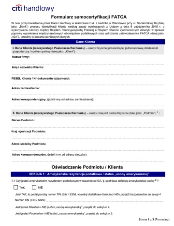 Formularz samocertyfikacji FATCA W celu przeprowadzenia przez Bank Handlowy w Warszawie S.A. z siedzibą w Warszawie przy ul. Senatorskiej 16 (dalej jako: „Bank”) procesu identyfikacji klienta według zasad wynikających z Ustawy z dnia 9 października 2015 r. o wykonywaniu Umowy między Rządem Rzeczypospolitej Polskiej a Rządem Stanów Zjednoczonych Ameryki w sprawie poprawy wypełniania międzynarodowych obowiązków podatkowych oraz wdrożenia ustawodawstwa FATCA (dalej jako: „IGA”), prosimy o podanie poniższych danych: Dane Klienta I. Dane Klienta (rzeczywistego Posiadacza Rachunku) – osoby fizycznej prowadzącej jednoosobową działalność gospodarczą / spółkę cywilną (dalej jako: „Klient”): Nazwa firmy: …………………………………………………………………………………………………………………………………………………………………………… Imię i nazwisko Klienta: …………………………………………………………………………………………………………………………………………………………………………… PESEL Klienta / Nr dokumentu tożsamości: …………………………………………………………………………………………………………………………………………………………………………… Adres zamieszkania: …………………………………………………………………………………………………………………………………………………………………………… Adres korespondencyjny, (jeżeli inny od adresu zamieszkania): …………………………………………………………………………………………………………………………………………………………………………… II. Dane Klienta (rzeczywistego Posiadacza Rachunku) – osoby innej niż osoba fizyczna (dalej jako: „Podmiot”) 1 : Nazwa Podmiotu: …………………………………………………………………………………………………………………………………………………………………………… Kraj rejestracji Podmiotu: …………………………………………………………………………………………………………………………………………………………………………… Adres siedziby Podmiotu: …………………………………………………………………………………………………………………………………………………………………………… Adres korespondencyjny, (jeżeli inny od adresu siedziby): …………………………………………………………………………………………………………………………………………………………………………… Oświadczenie Podmiotu / Klienta SEKCJA 1: Amerykańska rezydencja podatkowa / status „osoby amerykańskiej” 1.1 Czy jesteś amerykańskim rezydentem podatkowym w rozumieniu IGA, tj. spełniasz definicję amerykańskiej osoby 2 ? TAK NIE Jeśli TAK, to podaj poniżej numer TIN (EIN / SSN), wypełnij dodatkowo formularz W9 i przejdź bezpośrednio do sekcji 4 Numer TIN (EIN / SSN): ………………………………………………………………………………………………………………………..………..… Jeśli jesteś Klientem i NIE jesteś „osobą amerykańską”, przejdź do sekcji nr 4. Jeśli jesteś Podmiotem i NIE jesteś „osobą amerykańską”, przejdź do sekcji nr 2. Strona 1 z 3 (Formularz) SEKCJA 2: Klasyfikacja Podmiotu Oświadczam, że zgodnie z postanowieniami IGA jestem (należy wybrać jedno z poniższych): 3 Zwolnionym Uprawionym Odbiorcą (proszę przejść do sekcji 4). 4 Instytucją finansową (proszę przejść do sekcji 2.1) Podmiotem niefinansowym (proszę przejść do sekcji 2.2.) gdy żadne z powyższych proszę przejść do sekcji 3 2.1 Instytucją finansową (należy wybrać jedno z poniższych): Uczestniczącą instytucją finansową Własny numer GIIN 5 6 : …………………………………………………………………………………………………………..…………...… W przypadku braku własnego numeru GIIN, proszę podać powody jego braku (np. instytucja złożyła wniosek, ale nie uzyskała jeszcze numeru GIIN): ……………………………………………………………………………………………………………………………………………………………………...…… …………………………………………………………………………………………………………………………………………………………………………… Wyłączoną instytucją finansową 7 Współpracującą zagraniczną instytucją finansową 8 - z zastrzeżeniem iż w przypadku statusu Finansowanego podmiotu inwestycyjnego lub kontrolowanej spółki zagranicznej albo finansowanego zamkniętego funduszu inwestycyjnego (ang. Sponsored Investment Entity and Controlled Foreign Corporation or Sponsored, closely held investment vehicles) należy dodatkowo podać numer GIIN oraz nazwę podmiotu finansującego (ang. Sponsoring FFI). Nazwa oraz numer GIIN podmiotu finansującego: …………………………………………………………………………………………………………..…………...………………………………..…… 2.2 Podmiotem niefinansowym (należy wybrać jedno z poniższych): 9 Aktywnym niefinansowym podmiotem 10 Pasywnym niefinansowym podmiotem 11 Czy Osoby Kontrolujące TAK Pasywny niefinansowy podmiot są osobami amerykańskimi: NIE Jeżeli TAK proszę wypełnić tabelę poniżej: Imię, Nazwisko Adres Amerykański numer identyfikacji podatkowej TIN / SSN 1 2 3 4 Oświadczam, że dostarczyłem Osobom Kontrolującym informacje o fakcie przekazania ich dan