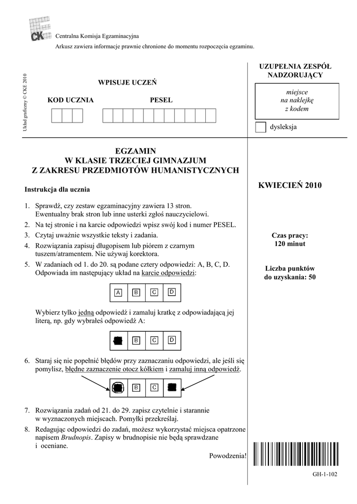 Centralna Komisja Egzaminacyjna Układ graficzny © CKE 2010 Arkusz zawiera informacje prawnie chronione do momentu rozpoczęcia egzaminu. WPISUJE UCZEŃ KOD UCZNIA PESEL UZUPEŁNIA ZESPÓŁ NADZORUJĄCY miejsce na naklejkę z kodem dysleksja EGZAMIN W KLASIE TRZECIEJ GIMNAZJUM Z ZAKRESU PRZEDMIOTÓW HUMANISTYCZNYCH Instrukcja dla ucznia 1. Sprawdź, czy zestaw egzaminacyjny zawiera 13 stron. Ewentualny brak stron lub inne usterki zgłoś nauczycielowi. 2. Na tej stronie i na karcie odpowiedzi wpisz swój kod i numer PESEL. 3. Czytaj uważnie wszystkie teksty i zadania. 4. Rozwiązania zapisuj długopisem lub piórem z czarnym tuszem/atramentem. Nie używaj korektora. 5. W zadaniach od 1. do 20. są podane cztery odpowiedzi: A, B, C, D. Odpowiada im następujący układ na karcie odpowiedzi: KWIECIEŃ 2010 Czas pracy: 120 minut Liczba punktów do uzyskania: 50 Wybierz tylko jedną odpowiedź i zamaluj kratkę z odpowiadającą jej literą, np. gdy wybrałeś odpowiedź A: 6. Staraj się nie popełnić błędów przy zaznaczaniu odpowiedzi, ale jeśli się pomylisz, błędne zaznaczenie otocz kółkiem i zamaluj inną odpowiedź. 7. Rozwiązania zadań od 21. do 29. zapisz czytelnie i starannie w wyznaczonych miejscach. Pomyłki przekreślaj. 8. Redagując odpowiedzi do zadań, możesz wykorzystać miejsca opatrzone napisem Brudnopis. Zapisy w brudnopisie nie będą sprawdzane i oceniane. Powodzenia! GH-1-102 Tekst I Król Salomon był synem Dawida. Umocnił państwo izraelskie. Rozwinął handel i zreorganizował armię. Swój dwór uczynił ośrodkiem kultury. Zasłynął jako sędzia. Pewnego razu przyszły do niego dwie kobiety, aby rozsądził ich spór. Jedna z kobiet powiedziała: „Litości, panie mój! Ja i ta kobieta mieszkamy w jednym domu. Ja porodziłam, kiedy ona była w domu. A trzeciego dnia po moim porodzie ta kobieta również porodziła. Byłyśmy razem. Nikogo innego z nami w domu nie było, tylko my obydwie. Syn tej kobiety zmarł [...]. Wtedy pośród nocy wstała i zabrała mojego syna od mego boku, kiedy twoja służebnica spała, i przyłożyła go do swoich piersi, położywszy przy mnie swego zmarłego syna. Kiedy rano wstałam, aby nakarmić mojego syna, patrzę, a oto on martwy! Gdy mu się przyjrzałam przy świetle, rozpoznałam, że to nie był mój syn, którego urodziłam”. Na to odparła druga kobieta: „Wcale nie, bo mój syn żyje, a twój syn zmarł”. Tamta zaś mówi: „Właśnie, że nie, bo twój syn zmarł, a mój syn żyje”. I tak wykrzykiwały wobec króla. Wówczas król powiedział: „Ta mówi: To mój syn żyje, a twój zmarł; tamta zaś mówi: Nie, bo twój syn zmarł, a mój syn żyje”. Następnie król rzekł: „Przynieście mi miecz!”. Niebawem przyniesiono miecz królowi. A wtedy król rozkazał: „Rozetnijcie to żywe dziecko na dwoje i dajcie połowę jednej i połowę drugiej!”. Wówczas kobietę, której syn był żywy, zdjęła litość nad swoim synem i zawołała: „Litości, panie mój! Niech dadzą jej dziecko żywe, abyście go tylko nie zabijali!”. Tamta zaś mówiła: „Niech nie będzie ani moje, ani twoje! Rozetnijcie!”. Na to król zabrał głos i powiedział: „Dajcie tamtej to żywe dziecko i nie zabijajcie go! Ona jest jego matką”. Kiedy o tym wyroku sądowym króla dowiedział się cały Izrael, czcił króla, bo przekonał się, że jest obdarzony mądrością Bożą do sprawowania sądów. Pismo Święte Starego i Nowego Testamentu, Wydawnictwo Pallottinum, Poznań-Warszawa 1990. Zadanie 1. (0-1) Stary Testament jest świętą księgą A. żydów i muzułmanów. B. chrześcijan i żydów. C. muzułmanów i chrześcijan. D. żydów i buddystów. Zadanie 2. (0-1) Z tekstu I wynika, że król Salomon był człowiekiem A. gwałtownym. B. okrutnym. C. roztropnym. D. wyrozumiałym. Zadanie 3. (0-1) Matka, którą król uznał za prawdziwą, zdecydowała się oddać swoje dziecko, ponieważ A. bała się o życie syna. B. lękała się gniewu króla. C. obawiała się zemsty fałszywej matki. D. nie wierzyła w korzystny dla siebie wyrok. Strona 2 z 13 Zadanie 4. (0-1) Dlaczego wydanie wyroku było dla Salomona trudne? A. Miał dwie sprzeczne wersje zdarzeń. B. Obie matki mówiły nieprawdę. C. Jedno z zeznań było dokładniejsze. D. Obie matki mówiły prawdę. Zadanie 5. (0-1) Mądrość Salomona polegała na tym, że A. respektował tradycje ludu Izraela. B. utrzymał raz wydany rozkaz. C. spełnił żądanie rzekomej matki. D. przewidział reakcję prawdziwej matki. Zadanie 6. (0-1) Wyrażenie „salomonowy wyrok” oznacza decyzję A. sprawiedliwą, choć czasem zaskakującą. B. pochopną i okrutną. C. odważną, ale niekiedy niesprawiedliwą. D. natychmiastową i nieodwołalną. Tekst II Jurand ze Spychowa był rycerzem znanym ze swej siły i męstwa. Mścił się okrutnie na Krzyżakach, którzy zabili mu żonę. W odwecie Krzyżacy porwali jego córkę Danusię. Udał się po nią do zamku krzyżackiego w Szczytnie, gdzie został upokorzony i okrutnie okaleczony przez zakonnika krzyżackiego Zygfryda. Oślepiono go, pozbawiono języka i prawej dłoni. Nie udało mu się odzyskać córki. Po wypuszczeniu z lochu spotkał przypadkiem Maćka z Bogdańca i Jagienkę, którzy odwieźli go do domu w Spychowie. Przy krześle stał stół, a na nim krucyfiks, dzban z wodą i bochen czarnego chleba z utkwioną w nim mizerykordią, czyli groźnym nożem, którego rycerze używali do dobijania rannych. – Jest tu Hlawa – ozwała się wreszcie słodkim głosem Jagienka – chcecie-li go wysłuchać? Skinął głową na znak zgody, więc Czech rozpoczął [...] opowiadanie [...]. Ponurej tej opowieści towarzyszył nie mniej posępny pomruk zapowiadającej się burzy. [...] Jurand słuchał opowiadania bez jednego drgnienia i ruchu, tak że obecnym zdawać się mogło, iż jest pogrążony we śnie. Słyszał wszystko jednak i rozumiał wszystko, bo gdy Hlawa zaczął mówić o niedoli Danusi