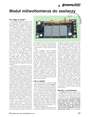 Moduł miliwoltomierza do zasilaczy 2270 Do czego to służy? A po jakiego diabła nam nowy moduł miliwoltomierza? Mamy przecież już je− den, zbudowany z wykorzystaniem wy− świetlaczy LED (AVT2004) i drugi, opisa− ny w Młodym Techniku: z wyświetla− czem LCD. Przecież nadają się one ideal− nie do monitorowania napięcia zasilania dowolnego zasilacza, więc po co mamy budować jeszcze jeden miliwoltomierz? Tylko że właśnie nie za bardzo nadają się one do wbudowania w typowy zasilacz laboratoryjny. Obydwa wymienione mo− duły zbudowane są z wykorzystaniem po− pularnej ICL7107 i wyświetlają wynik po− miaru na wyświetlaczu 3,5−cyfrowych. A zatem w zależności od wersji wykona− nia i stosowanego dzielnika napięcia za− kres pomiarowy tych miliwoltomierzy może wynosić: 0...1,999V, 0...19,99, 0...199,9V itd. Typowy zasilacz warszta− towy dostarcza najczęściej napięć z za− kresu od 1...2V do kilkudziesięciu wol− tów. Tak więc zakres pomiarowy 0...19,99V będzie dla takiego zasilacza zdecydowanie za mały, a 0...199,9V – za duży. Oczywiście, można zastosować przełącznik zakresów, ale takie rozwiąza− nie niepotrzebnie komplikuje konstrukcję zasilacza. Do niedawna w ofercie kitów AVT zna− jdował się miernik rzeczywiście idealnie nadający się do monitorowania napięcia wyjściowego zasilaczy warsztatowych. Miał on zakres 0...99,9V, co w większoś− ci przypadków zaspokajało potrzeby kon− struktorów. Niestety, kit ten nie jest już produkowany, ponieważ sercem układu był scalony przetwornik analogowo−cyfro− wy typu C520 produkcji byłego NRD, któ− ry obecnie jest praktycznie niemożliwy do nabycia. Autor przejrzał wszystkie do− stępne katalogi w nadziei znalezienia ja− kiegoś taniego zamiennika, ale niestety bez rezultatu. Ze względu na przygotowy− wany w Pracowni Konstrukcyjnej AVT no− wy model zasilacza, zbudowanie proste− go i taniego modułu pomiarowego dedy− kowanego specjalnie do zasilaczy labora− toryjnych stało się palącą koniecznością. Wspomniany zasilacz będzie w wersji podstawowej wyposażony w cztery wol− tomierze, a w wersji rozwojowej aż w osiem modułów pomiarowych! Zasto− sowanie dość dużych i kosztownych układów AVT−2004 w drastyczny sposób zwiększyłoby wymiary płyty czołowej za− silacza oraz niezbyt korzystnie wpłynęło− by na koszt jego wykonania. Tak więc au− tor zdecydował się wykonać jeszcze je− den moduł pomiarowy wykorzystujący ICL7107! Tak, ta kostka rzeczywiście jest „nieśmiertelna” i bardzo trudna do zastą− pienia! Jakie występują różnice pomiędzy modułem AVT−2004 i obecnie propono− wanym woltomierzem AVT−2270? Po pierwsze „amputowana” została pierw− sza, najbardziej znacząca cyfra, co umoż− liwia zbudowanie miernika o zakresie 0...99,9, czyli właśnie idealnie nadające− go się do monitorowania napięcia wy− jściowego zasilacza warsztatowego. Po drugie, w celu zmniejszenia gabarytów układu i kosztów wykonania cały układ został „upakowany” na jednej, dwustron− nej płytce drukowanej o wymiarach znacznie mniejszych od płytek modułu AVT−2004. Wyjątkowo gęste rozmiesz− czenie elementów zostało wprawdzie okupione dość trudnym montażem ukła− du, ale nie z takimi problemami radzili już sobie czytelnicy EdW! Jak to działa? Schemat elektryczny proponowanego układu przedstawiony został na rysunku 1. sercem układu jest, oczywiście „ajsielka” – ICL7107. Nie obawiajcie się, drodzy czy− telnicy, autor nie ma najmniejszego zamia− ru po raz kolejny opisywać zasady działa− nia tej popularnej kostki. Wystarczy stwierdzić, że ICL7107 pracuje w typowej dla siebie i wielokrotnie omawianej aplika− cji. Wszystkich, którzy chcą dowiedzieć się czegoś więcej o działaniu tego legen− darnego już układu odsyłamy do lektury EdW oraz do biuletynu USKA. Jedyną róż− nicą pomiędzy naszym układem a typową aplikacją fabryczną jest rezygnacja z wy− świetlania pierwszej cyfry. Kolejnym odstępstwem od powszech− nie znanych aplikacji ICL7107 jest nieco ELEKTRONIKA DLA WSZYSTKICH 3/98 nietypowe rozwiązanie problemu zasila− nia układu napięciem ujemnym. Jak wia− domo, ICL7107 potrzebuje „do życia” dwóch napięć +5VDC i −3,3 5VDC. Naj− częściej napięcie ujemne uzyskuje się z wyjścia przetwornicy zbudowanej na kilku inwerterach TTL i sterowanej z jed− nego z wyjść układu ICL7107. My zasto− sowaliśmy rozwiązanie bardziej nowo− czesne i oszczędne: dodatkowy układ scalonej przetwornicy +5VDC – −5VDC, ICL7660. Jest to bardzo interesująca kos− tka redukująca do minimum kłopoty zwią− zane z koniecznością uzyskiwania napięć ujemnych w układzie zasilanym pojedyn− czym napięciem 5V. Do działania potrze− buje ona zaledwie jednego elementu ze− wnętrznego – kondensatora elektrolitycz− nego o pojemności 10µF, w naszym ukła− dzie C2. Na wyjściu OUT ICL7660 otrzy− mujemy napięcie −5VDC, dość dobrze stabilizowane, które następnie doprowa− dzone zostaje do wejścia V− IC1. W na− szej konstrukcji niezwykle istotny jest fakt, że struktura układu ICL7660 została umieszczona w obudowie typu DIL8, co w porównaniu z typowymi rozwiązaniami z inwerterami pozwoliło na znaczną oszczędność miejsca na płytce obwodu drukowanego. Montaż i uruchomienie Na rysunku 2 pokazana została mozai− ka ścieżek płytki obwodu drukowanego wykonanego na laminacie dwustronnym z metalizacją oraz rozmieszczenie ele− mentów na tej płytce. W tym momencie autor zwraca się do czytelników z prośbą: z a n i m c o k o l w i e k w l u t u j e c i e w płytkę przeczytajcie uważnie i do końca opis montażu układu. Jest on nieco nietypowy i jedynie przestrzeganie właściwej kolej− ności lutowania podzespołów może za − gwarantować sukces! Już na początku 57 warto stwierdzić, że 