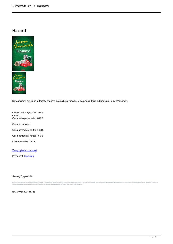 Literatura : Hazard Hazard Dowiadujemy si?, jakie automaty znale?? mo?na by?o niegdy? w kasynach, które odwiedza?a, jakie s? zasady... Ocena: Nie ma jeszcze oceny Cena Cena netto po rabacie: 3,69 € Cena po rabacie Cena sprzeda?y brutto: 4,03 € Cena sprzeda?y netto: 3,69 € Kwota podatku: 0,33 € Zadaj pytanie o produkt Producent: Olesiejuk Szczegó?y produktu Autorka ze swad? pisze o swoich hazardowych (lecz nie tylko takich…) do?wiadczeniach. Dowiadujemy si?, jakie automaty znale?? mo?na by?o niegdy? w kasynach, które odwiedza?a, jakie s? zasady równych gier popularnych w jaskiniach hazardu, jakie perypetie przydarzaj? si? graj?cym i jak pogodzi? si? ze zmiennymi humorami dobrej passy. Ruletka, blackjack, poker (ale i bingo czy ko?ci) – a do tego masa dygresji, zabawnych anegdot i obserwacji na temat ludzkiej natury. EAN: 9788327415325 1 / 1 Powered by TCPDF (www.tcpdf.org)