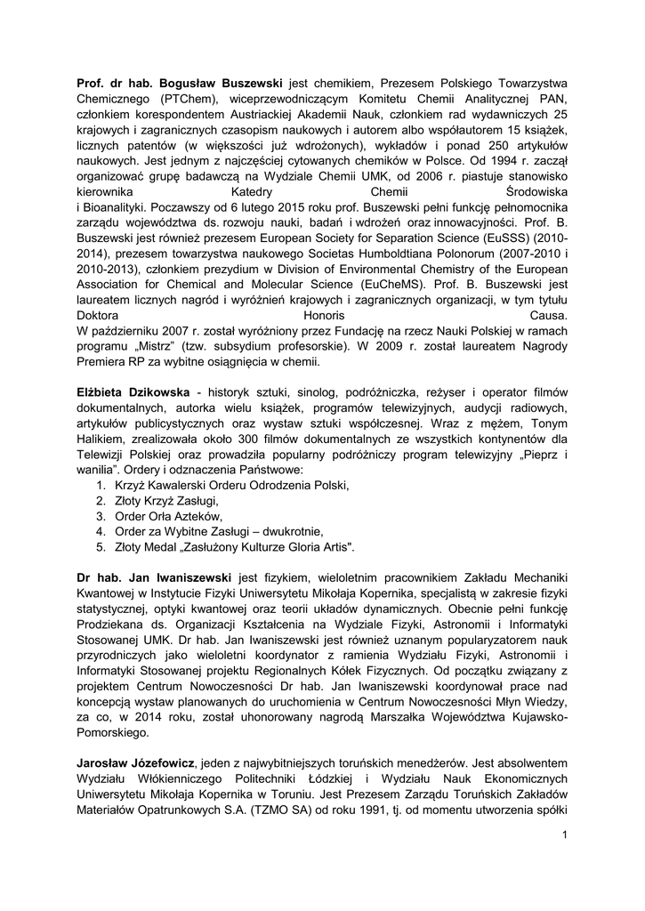Prof. dr hab. Bogusław Buszewski jest chemikiem, Prezesem Polskiego Towarzystwa Chemicznego (PTChem), wiceprzewodniczącym Komitetu Chemii Analitycznej PAN, członkiem korespondentem Austriackiej Akademii Nauk, członkiem rad wydawniczych 25 krajowych i zagranicznych czasopism naukowych i autorem albo współautorem 15 książek, licznych patentów (w większości już wdrożonych), wykładów i ponad 250 artykułów naukowych. Jest jednym z najczęściej cytowanych chemików w Polsce. Od 1994 r. zaczął organizować grupę badawczą na Wydziale Chemii UMK, od 2006 r. piastuje stanowisko kierownika Katedry Chemii Środowiska i Bioanalityki. Poczawszy od 6 lutego 2015 roku prof. Buszewski pełni funkcję pełnomocnika zarządu województwa ds. rozwoju nauki, badań i wdrożeń oraz innowacyjności. Prof. B. Buszewski jest również prezesem European Society for Separation Science (EuSSS) (20102014), prezesem towarzystwa naukowego Societas Humboldtiana Polonorum (2007-2010 i 2010-2013), członkiem prezydium w Division of Environmental Chemistry of the European Association for Chemical and Molecular Science (EuCheMS). Prof. B. Buszewski jest laureatem licznych nagród i wyróżnień krajowych i zagranicznych organizacji, w tym tytułu Doktora Honoris Causa. W październiku 2007 r. został wyróżniony przez Fundację na rzecz Nauki Polskiej w ramach programu „Mistrz” (tzw. subsydium profesorskie). W 2009 r. został laureatem Nagrody Premiera RP za wybitne osiągnięcia w chemii. Elżbieta Dzikowska - historyk sztuki, sinolog, podróżniczka, reżyser i operator filmów dokumentalnych, autorka wielu książek, programów telewizyjnych, audycji radiowych, artykułów publicystycznych oraz wystaw sztuki współczesnej. Wraz z mężem, Tonym Halikiem, zrealizowała około 300 filmów dokumentalnych ze wszystkich kontynentów dla Telewizji Polskiej oraz prowadziła popularny podróżniczy program telewizyjny „Pieprz i wanilia”. Ordery i odznaczenia Państwowe: 1. Krzyż Kawalerski Orderu Odrodzenia Polski, 2. Złoty Krzyż Zasługi, 3. Order Orła Azteków, 4. Order za Wybitne Zasługi – dwukrotnie, 5. Złoty Medal „Zasłużony Kulturze Gloria Artis". Dr hab. Jan Iwaniszewski jest fizykiem, wieloletnim pracownikiem Zakładu Mechaniki Kwantowej w Instytucie Fizyki Uniwersytetu Mikołaja Kopernika, specjalistą w zakresie fizyki statystycznej, optyki kwantowej oraz teorii układów dynamicznych. Obecnie pełni funkcję Prodziekana ds. Organizacji Kształcenia na Wydziale Fizyki, Astronomii i Informatyki Stosowanej UMK. Dr hab. Jan Iwaniszewski jest również uznanym popularyzatorem nauk przyrodniczych jako wieloletni koordynator z ramienia Wydziału Fizyki, Astronomii i Informatyki Stosowanej projektu Regionalnych Kółek Fizycznych. Od początku związany z projektem Centrum Nowoczesności Dr hab. Jan Iwaniszewski koordynował prace nad koncepcją wystaw planowanych do uruchomienia w Centrum Nowoczesności Młyn Wiedzy, za co, w 2014 roku, został uhonorowany nagrodą Marszałka Województwa KujawskoPomorskiego. Jarosław Józefowicz, jeden z najwybitniejszych toruńskich menedżerów. Jest absolwentem Wydziału Włókienniczego Politechniki Łódzkiej i Wydziału Nauk Ekonomicznych Uniwersytetu Mikołaja Kopernika w Toruniu. Jest Prezesem Zarządu Toruńskich Zakładów Materiałów Opatrunkowych S.A. (TZMO SA) od roku 1991, tj. od momentu utworzenia spółki 1 akcyjnej, która wykupiła od Skarbu Państwa majątek przedsiębiorstwa. W ciągu 16 lat z lokalnego producenta TZMO SA zbudowało firmę globalną. TZMO SA swoje wyroby – bella, happy, matopat i seni - sprzedaje w Unii Europejskiej, w Europie Środkowej i Wschodniej, w Afryce i na Dalekim Wschodzie. W 2007 roku odznaczony Medalem Honorowym "Thorunium" przez prezydenta Michała Zaleskiego. W 2011 prezydent Bronisław Komorowski odznaczył go Krzyżem Komandorskim Orderu Odrodzenia Polski. Jarosław Józefowicz był także wielokrotnie wyróżniany za swoje osiągnięcia menedżerskie, m.in. tytułem "Menedżera Roku 2001", medalem im. Tadeusza Kotarbińskiego w 2006 i tytułem "Ambasadora Regionu" w 2012 roku. Dr n. med. Marek Jurgowiak jest starszym wykładowcą w Katedrze Biochemii Klinicznej Collegium Medicum Uniwersytetu Mikołaja Kopernika w Toruniu, autorem artykułów i prezentacji popularyzujących zagadnienia biologii, biochemii i medycyny, m.in. w pismach i magazynach: „Wiedza i Życie”, „Focus”, „Primum Non Nocere”, „Wiadomościach Akademickich”, „Postępy Biochemii”, „Kosmos”, „Gerontologia Polska”, „Gazeta Wyborcza”, a także autorem książki - kompendium wiedzy dla uczniów szkół średnich "Biologia – przed egzaminem na akademie medyczne" PZWL, oraz wielu rozdziałów podręcznikowych nt. biologii i biomedycyny. Jest jednym z pomysłodawców projektu „Medyczne środy” popularyzującego wiedzę medyczna wśród mieszkańców Bydgoszczy. Dr M. Jurgowiak jest laureatem VII edycji Konkursu Popularyzator Nauki 2011 (PAP i Ministerstwo Nauki i Szkolnictwa Wyższego). Dr hab. Jerzy Łukaszewicz, prof. UMK – chemik. Kieruje Zespołem Modelowania i Syntezy Nowych Materiałów na Katedrze Chemii Materiałów Adsorpcji i Katalizy. Profesor Łukaszewicz był członkiem Rady Programowej projektu Centrum Nowoczesności poprzedniej kadencji. Jego zainteresowania związane są z detekcją par i gazów, fizykochemią zjawisk powierzchniowych oraz syntezą nowych materiałów. Jest autorem podręczników dla studentów, wielu patentów oraz kilkudziesięciu publikacji naukowych w renomowanych czasopismach. Obecnie pełni funkcję dyrektora Interdyscyplinarnego Centrum Nowoczesnych Technologii w Toruniu. Dr hab. Janusz Leon Wiśniewski jest chemikiem, informatykiem oraz pisarzem. Magister fizyki oraz ekonomii UMK, doktor informatyki na Politechnice Warszawskiej, doktor habilitowany chemii na Politechnice Łódzkiej. Janusz L. Wiśniewski w latach 1979-1987 pracował w Ogólnouczelnian