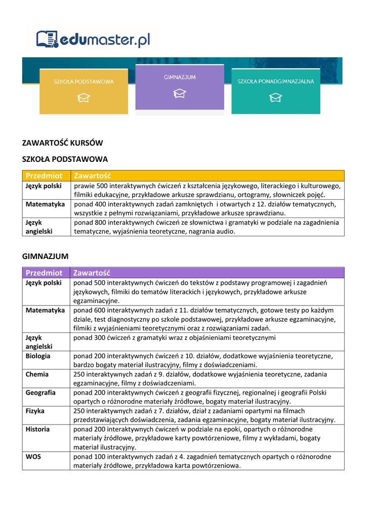 ZAWARTOŚĆ KURSÓW SZKOŁA PODSTAWOWA Przedmiot Zawartość Język polski prawie 500 interaktywnych ćwiczeń z kształcenia językowego, literackiego i kulturowego, filmiki edukacyjne, przykładowe arkusze sprawdzianu, ortogramy, słowniczek pojęć. ponad 400 interaktywnych zadań zamkniętych i otwartych z 12. działów tematycznych, wszystkie z pełnymi rozwiązaniami, przykładowe arkusze sprawdzianu. ponad 800 interaktywnych ćwiczeń ze słownictwa i gramatyki w podziale na zagadnienia tematyczne, wyjaśnienia teoretyczne, nagrania audio. Matematyka Język angielski GIMNAZJUM Przedmiot Zawartość Język polski ponad 500 interaktywnych ćwiczeń do tekstów z podstawy programowej i zagadnień językowych, filmiki do tematów literackich i językowych, przykładowe arkusze egzaminacyjne. ponad 600 interaktywnych zadań z 11. działów tematycznych, gotowe testy po każdym dziale, test diagnostyczny po szkole podstawowej, przykładowe arkusze egzaminacyjne, filmiki z wyjaśnieniami teoretycznymi oraz z rozwiązaniami zadań. ponad 300 ćwiczeń z gramatyki wraz z objaśnieniami teoretycznymi Matematyka Język angielski Biologia Chemia Geografia Fizyka Historia WOS ponad 200 interaktywnych ćwiczeń z 10. działów, dodatkowe wyjaśnienia teoretyczne, bardzo bogaty materiał ilustracyjny, filmy z doświadczeniami. 250 interaktywnych zadań z 9. działów, dodatkowe wyjaśnienia teoretyczne, zadania egzaminacyjne, filmy z doświadczeniami. ponad 200 interaktywnych ćwiczeń z geografii fizycznej, regionalnej i geografii Polski opartych o różnorodne materiały źródłowe, bogaty materiał ilustracyjny. 250 interaktywnych zadań z 7. działów, dział z zadaniami opartymi na filmach przedstawiających doświadczenia, zadania egzaminacyjne, bogaty materiał ilustracyjny. ponad 200 interaktywnych ćwiczeń w podziale na epoki, opartych o różnorodne materiały źródłowe, przykładowe karty powtórzeniowe, filmy z wykładami, bogaty materiał ilustracyjny. ponad 100 interaktywnych zadań z 4. zagadnień tematycznych opartych o różnorodne materiały źródłowe, przykładowa karta powtórzeniowa. SZKOŁA PONADGIMNAZJALNA Przedmiot Język polski Zawartość Matura - poziom podstawowy: ponad 450 interaktywnych ćwiczeń, 4 interaktywne arkusze maturalne z przykładowymi wypracowaniami, ćwiczenia powtórkowe pomocne w realizacji pytań do części ustnej egzaminu, ponad 3 godziny materiałów filmowych, inscenizacja egzaminu ustnego wraz z komentarzem egzaminatorów. Od Antyku po Współczesność – wykłady filmowe: to ponad 40 wykładów filmowych (ponad 7 godzin) poświęconych literaturze i sztuce od powstania po czasy współczesne, interpretacje tekstów literackich i ikonicznych, pytania sprawdzające, tematy do dyskusji. Repetytorium Antyk – Oświecenie: informacje o epokach, twórcach i ich dziełach, od Antyku po Oświecenie z nawiązaniem do utworów z późniejszych okresów, ponad 4 godziny wykładów filmowych, najważniejsze wiadomości z nauki o języku oraz słowniczek pojęć i terminów. Matematyka Matura - poziom podstawowy: 800 interaktywnych zadań z 12. działów, w każdym zadania zamknięte i otwarte, 5 przykładowych arkuszy egzaminacyjnych, ponad 3 godziny filmów z wykładami teoretycznymi i rozwiązaniami zadań. Język Matura poziom podstawowy: ponad 140 interaktywnych ćwiczeń ułożonych zgodnie z angielski konstrukcją arkusza maturalnego - rozumienie tekstu słuchanego, pisanego, część leksykalno-gramatyczna, wypowiedź pisemna, 5 interaktywnych arkuszy egzaminacyjnych, inscenizacja egzaminu ustnego wraz z oceną egzaminatorów, zestawy do części ustnej. Matura poziom rozszerzony: ponad 200 interaktywnych ćwiczeń ułożonych jak w arkuszu maturalnym, 5 przykładowych arkuszy egzaminacyjnych, inscenizacja egzaminu ustnego z komentarzem egzaminatorów, zestawy do części ustnej. Czasowniki złożone PHRASAL VERBS: szczegółowe objaśnienia kilkaset czasowników złożonych, ponad 200 ćwiczeń z wieloma przykładami. Young People Talk: nagrania rozmów amerykańskich studentów wraz ze skryptami oraz wyjaśnieniami używanych zwrotów. Język Matura - poziom podstawowy: ponad 160 interaktywnych ćwiczeń, 4 przykładowe niemiecki arkusze egzaminacyjne, inscenizacja egzaminu ustnego z komentarzem egzaminatorów, zestawy do części ustnej. Gramatyka niemiecka krok po kroku: obszerne wiadomości teoretyczne o częściach mowy i składni, prawie 500 interaktywnych ćwiczeń sprawdzających. Biologia Matura - poziom rozszerzony: ponad 300 interaktywnych ćwiczeń z 7 działów, 4 przykładowe arkusze egzaminacyjne, bogaty materiał ilustracyjny. Biologia - wykłady filmowe: 8 wykładów filmowych (prawie 2 godziny) obejmujących zagadnienia z zakresu ekologii, ewolucjonizmu, fizjologii roślin i chorobotwórczości drobnoustrojów, zrozumiale i ciekawie podane fakty naukowe bogata oprawa graficzna. Geografia Matura - poziom rozszerzony: ponad 500 interaktywnych zadań z geografii fizycznej i społeczno-ekonomicznej, 5 przykładowych arkuszy egzaminacyjnych. Historia Matura - poziom rozszerzony, ponad 300 interaktywnych ćwiczeń w podziale na epoki 6 godzin wykładów filmowych, 5 przykładowych arkuszy egzaminacyjnych. WOS Matura - poziom rozszerzony: ponad 600 interaktywnych ćwiczeń, najważniejsze wiadomości z teorii, wykłady filmowe, 5 przykładowych arkuszy egzaminacyjnych.