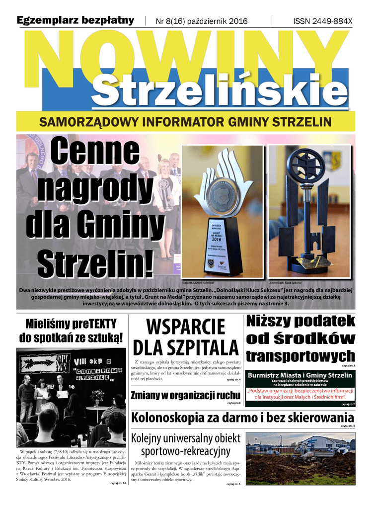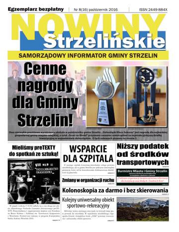 Egzemplarz bezpłatny Nr 8(16) październik 2016 Cenne nagrody dla Gminy Strzelin! Statuetka „Grunt na Medal” ISSN 2449-884X „Dolnośląski Klucz Sukcesu” Dwa niezwykle prestiżowe wyróżnienia zdobyła w październiku gmina Strzelin. „Dolnośląski Klucz Sukcesu” jest nagrodą dla najbardziej gospodarnej gminy miejsko-wiejskiej, a tytuł „Grunt na Medal” przyznano naszemu samorządowi za najatrakcyjniejszą działkę inwestycyjną w województwie dolnośląskim. O tych sukcesach piszemy na stronie 3. Mieliśmy preTEXTY do spotkań ze sztuką! WSPARCIE DLA SZPITALA Z naszego szpitala korzystają mieszkańcy całego powiatu strzelińskiego, ale to gmina Strzelin jest jedynym samorządem gminnym, który od lat konsekwentnie dofinansowuje działalność tej placówki. czytaj str. 4 Zmiany w organizacji ruchu czytaj str.8 Niższy podatek od środków transportowych czytaj str.6 Burmistrz Miasta i Gminy Strzelin zaprasza lokalnych przedsiębiorców na bezpłatne szkolenie w zakresie „Podstaw organizacji bezpieczeństwa informacji dla Instytucji oraz Małych i Średnich firm”. czytaj str.7 Kolonoskopia za darmo i bez skierowania czytaj str. 4 W piątek i sobotę (7/8.10) odbyła się u nas druga już edycja objazdowego Festiwalu Literacko-Artystycznego preTEXTY. Pomysłodawcą i organizatorem imprezy jest Fundacja na Rzecz Kultury i Edukacji im. Tymoteusza Karpowicza z Wrocławia. Festiwal jest wpisany w program Europejskiej Stolicy Kultury Wrocław 2016. czytaj str. 14 Kolejny uniwersalny obiekt sportowo-rekreacyjny Miłośnicy tenisa ziemnego oraz jazdy na łyżwach mają spore powody do satysfakcji. W sąsiedztwie strzelińskiego Aquaparku Granit i kompleksu boisk „Orlik” powstaje nowoczesny i uniwersalny obiekt sportowy. czytaj str. 5 2 Nr 8(16) październik 2016 Doczekają się remontu ULICA bitumicznej w m. Ulica wraz z wymianą zdeformowanej podbudowy już od kilku lat zabiegał strzeliński samorząd. W 2015 roku zakończyła się budowa chodnika w tej miejscowości. W ramach tego zadania wykonano również zatokę autobusową, kanalizację deszczową oraz zjazdy na posesje. Wybudowanie ponad 740-metrowego odcinka bitumicznego chodnika przy ruchliwej drodze wojewódzkiej nr 396 zrealizowano w ramach „Dolnośląskiego Programu Przebudowy i Remontów Dróg Wojewódzkich”. Na sfinan- sowanie inwestycji gmina Strzelin otrzymała pomoc finansową z budżetu Województwa Dolnośląskiego w wysokości 50% wartości zadania. Całkowita wartość inwestycji to ok. 595 tys. zł. Inwestycja w znaczny sposób przyczyniła się do poprawy bezpieczeństwa pieszych przy ruchliwej drodze wojewódzkiej nr 396, na której występuje duże natężenie ruchu samochodów ciężarowych. Warto podkreślić, że z chodnika korzystają m.in. dzieci w wieku szkolnym, które przemieszczają się na przystanek autobusowy. Zostań policjantem Prace porządkowe na cmentarzu Mamy dobrą wiadomość dla mieszkańców Ulicy. Dolnośląska Służba Dróg i Kolei we Wrocławiu wyłoniła wykonawcę remontu drogi wojewódzkiej nr 396 w miejscowości Ulica o długości ok. 950 mb. Prace rozpoczęły się w środę, 26 października. Inwestycję za kwotę 797.220,99 zł zrealizuje Przedsiębiorstwo Robót Drogowo-Mostowych Sp. z o.o. z Brzegu. Planowany termin zakończenia inwestycji to 30 listopada 2016 r. Przypomnijmy, że o wykonanie nowej nawierzchni Komenda Powiatowa Policji w Strzelinie informuje o rozpoczęciu procedury rekrutacji kandydatów do służby w policji. Zainteresowani mogą składać dokumentację o przyjęcie do służby. Kwestionariusze dla kandydatów są dostępne na stronie internetowej www.dolnoslaska. policja.gov.pl oraz w Komendzie Powiatowej Policji w Strzelinie (ul. Wolności 15). Wydawca: Strzeliński Ośrodek Kultury Adres i siedziba redakcji: ul. Mickiewicza 2, 57-100 Strzelin Tel.: 71 39 215 34, 721 095 818, E-mail: [email protected] Redaktor naczelny: Mirosława Szychowiak Redagują: Pracownicy SOK, UMiG Strzelin oraz podległych jednostek Skład, łamanie: Paula Gołuzd Druk: Polskapresse Wrocław UMiG Kapliczka cmentarna przy ul. Oławskiej Brama wjazdowa od strony ul. Oławskiej Przed świętem zmarłych pracownicy Centrum Usług Komunalnych i Technicznych w Strzelinie wykonują prace porządkowo – konserwacyjne na terenie Cmentarza Parafialnego przy ulicy Oławskiej. Wyremontowano już główną bramę wjazdową od strony ul. Oławskiej oraz przycmentarną kapliczkę. W kapliczce naprawiono drzwi dwuskrzydłowe, podest drewniany oraz drzwi do składziku podręcznego. Na cmentarzu wykonano również cięcia pielęgnacyjne dolnych części koron lip rosnących wzdłuż alejek cmentarnych i pomiędzy grobami. Mamy nadzieję, że wszyscy odwiedzający cmentarz docenią trud i starania pracowników CUKiT poprzez dbanie i uszanowanie miejsca w którym się znajdują. CUKiT Samorządowy Informator Gminy Strzelin Redakcja nie zwraca tekstów niezamówionych. Zastrzega sobie prawo do redagowania i skracania nadsyłanych tekstów oraz zmiany ich tytułów. Autobusem na cmentarz UMiG Remonty dróg w sołectwie Głęboka Gmina Strzelin przejęła od Agencji Nieruchomości Rolnych dwie drogi osiedlowe w miejscowości Głęboka. Na remont tych dróg strzeliński samorząd otrzyma bezzwrotną pomoc finansową, która wyniesie 80% kosztów brutto całego przedsięwzięcia. GŁĘBOKA 20 października ogłoszono przetarg nieograniczony, w którym samorząd wyłoni wykonawcę robót budowlanych. Termin składania ofert upłynął 3 listopada 2016 r. Zakres prac obejmuje: - dz. nr 4/2 AM-1 w m. Głęboka – przebudowa drogi o długości ok. 202 mb, która obejmuje m.in. rozbiórkę zniszczonych nawierzchni jezdni, chodników, krawężników i obrzeży, wykonanie nowych warstw podbudowy, budowę jezdni szerokości od 3,44 do 3,86 m oraz chodnika szerokości od 1,46 do 2,07 m – wykonanie nawierzchni z kostki betonowej wraz z odwodnieniem powierzchniowym w postaci cieku z ko
