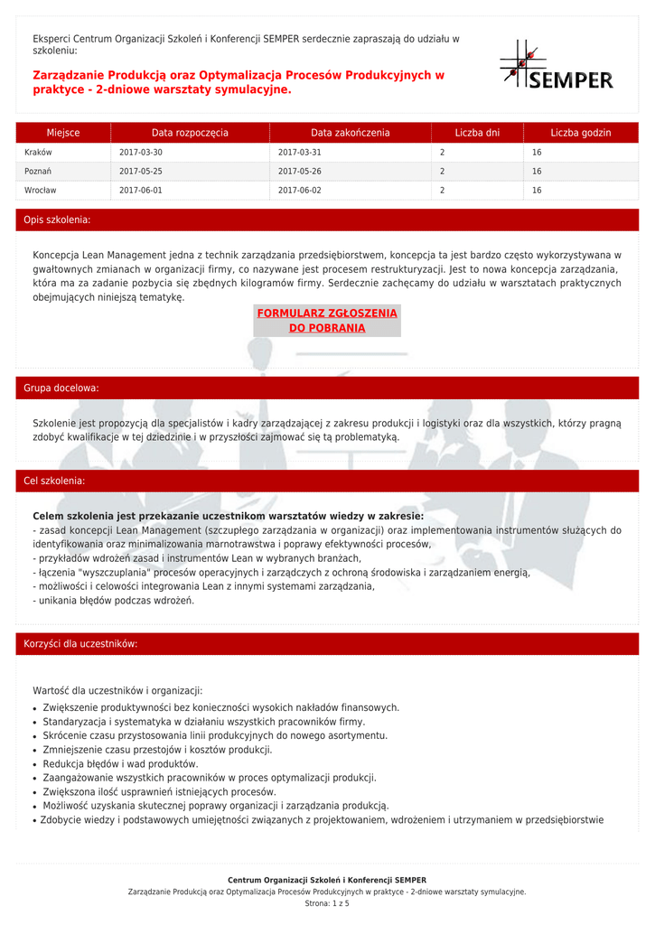 Eksperci Centrum Organizacji Szkoleń i Konferencji SEMPER serdecznie zapraszają do udziału w szkoleniu: Zarządzanie Produkcją oraz Optymalizacja Procesów Produkcyjnych w praktyce - 2-dniowe warsztaty symulacyjne. Miejsce Data rozpoczęcia Data zakończenia Liczba dni Liczba godzin Kraków 2017-03-30 2017-03-31 2 16 Poznań 2017-05-25 2017-05-26 2 16 Wrocław 2017-06-01 2017-06-02 2 16 Opis szkolenia: Koncepcja Lean Management jedna z technik zarządzania przedsiębiorstwem, koncepcja ta jest bardzo często wykorzystywana w gwałtownych zmianach w organizacji firmy, co nazywane jest procesem restrukturyzacji. Jest to nowa koncepcja zarządzania, która ma za zadanie pozbycia się zbędnych kilogramów firmy. Serdecznie zachęcamy do udziału w warsztatach praktycznych obejmujących niniejszą tematykę. FORMULARZ ZGŁOSZENIA DO POBRANIA Grupa docelowa: Szkolenie jest propozycją dla specjalistów i kadry zarządzającej z zakresu produkcji i logistyki oraz dla wszystkich, którzy pragną zdobyć kwalifikacje w tej dziedzinie i w przyszłości zajmować się tą problematyką. Cel szkolenia: Celem szkolenia jest przekazanie uczestnikom warsztatów wiedzy w zakresie: - zasad koncepcji Lean Management (szczupłego zarządzania w organizacji) oraz implementowania instrumentów służących do identyfikowania oraz minimalizowania marnotrawstwa i poprawy efektywności procesów, - przykładów wdrożeń zasad i instrumentów Lean w wybranych branżach, - łączenia "wyszczuplania" procesów operacyjnych i zarządczych z ochroną środowiska i zarządzaniem energią, - możliwości i celowości integrowania Lean z innymi systemami zarządzania, - unikania błędów podczas wdrożeń. Korzyści dla uczestników: Wartość dla uczestników i organizacji: ● ● ● ● ● ● ● ● ● Zwiększenie produktywności bez konieczności wysokich nakładów finansowych. Standaryzacja i systematyka w działaniu wszystkich pracowników firmy. Skrócenie czasu przystosowania linii produkcyjnych do nowego asortymentu. Zmniejszenie czasu przestojów i kosztów produkcji. Redukcja błędów i wad produktów. Zaangażowanie wszystkich pracowników w proces optymalizacji produkcji. Zwiększona ilość usprawnień istniejących procesów. Możliwość uzyskania skutecznej poprawy organizacji i zarządzania produkcją. Zdobycie wiedzy i podstawowych umiejętności związanych z projektowaniem, wdrożeniem i utrzymaniem w przedsiębiorstwie Centrum Organizacji Szkoleń i Konferencji SEMPER Zarządzanie Produkcją oraz Optymalizacja Procesów Produkcyjnych w praktyce - 2-dniowe warsztaty symulacyjne. Strona: 1 z 5 systemu Kanban. Metodologia: ● ● ● Warsztaty, prezentacje, praca zespołowa, konsultacje indywidualne, burza mózgów, case study, dyskusja nad osiągniętymi wynikami. Projekt warsztatów ma charakter autorski i został opracowany w oparciu o doświadczenia praktyczne trenera, wynikające ze współpracy z organizacjami przy doskonaleniu ich systemów zarządzania. Uczestnicy mogą liczyć na praktyczny i przystępny komentarz w odniesieniu do prezentowanego materiału, również z perspektywy własnej organizacji i problemów. Trener: dr inż. Martin Daliga Specjalizacja trenerska: Jest ekspertem w zakresie zarządzania produkcją, Filozofii Lean Management, zarządzania projektami i procesami, jako niestrudzony propagator przywództwa sytuacyjnego Kennetha Blancharda skutecznie zarządzał zespołami interdyscyplinarnymi. Na przestrzeni ostatnich kilkunastu lat pracował z zespołami realizującymi projekty o budżetach sięgających ponad 10 mln zł. Pełnił szereg funkcji i ról w największych polskich przedsiębiorstwach, najbardziej dumny jest z udziału swojego zespołu w projektach związanych z optymalizacją procesów biznesowych i zwiększaniem ich konkurencyjności. Posiada wieloletnią praktykę trenerską w kreowaniu wartości biznesowych i zarządzania ograniczeniami. Specjalista w zakresie Filizofii Lean Management, ekspert w dziedzinie nowoczesnych metod zarządzania produkcją. Doświadczony trener, od kilku lat prowadzi wysoko oceniane warsztaty szkoleniowe i wdrożenia dla wielu firm i przedsiębiorstw. Trener: dr Iwona Burka Specjalizacja trenerska: Ekspert Semper ds. zarządzania produkcją i optymalizacji procesów produkcyjnych. Specjalizuje się w projektowaniu oraz doskonaleniu systemów zarządzania w organizacjach, z wykorzystaniem zasad i instrumentów szczupłego zarządzania oraz identyfikowaniu i minimalizowaniu marnotrawstwa w duchu zarządzania przez jakość. Autorka licznych publikacji z zakresu Lean Management oraz Lean Service. Posiada wieloletnią praktykę trenerską w tworzeniu wartości biznesowych i zarządzaniu ograniczeniami, konsultant w dziedzinie nowoczesnych metod i narzędzi zarządzania w organizacjach. Zajmuje się projektowaniem zintegrowanych systemów zarządzania, w tym i w zakresie wymagań norm ISO 9001 i 14001, oraz kreowaniem organizacji uczących się. Jest wykładowcą akademickim. Powadzi wysoko oceniane warsztaty szkoleniowe dla wielu firm i przedsiębiorstw produkcyjnych. Program szkolenia: I. WPROWADZENIE DO WARSZTATÓW - prezentacja trenera i uczestników warsztatów - omówienie programu warsztatów II. KONCEPCJA LEAN MANAGEMENT - rys historyczny koncepcji Lean - zasady szczupłego zarządzania (Lean Management) w organizacji - obszary zastosowania Lean Centrum Organizacji Szkoleń i Konferencji SEMPER Zarządzanie Produkcją oraz Optymalizacja Procesów Produkcyjnych w praktyce - 2-dniowe warsztaty symulacyjne. Strona: 2 z 5 - źródła i rodzaje marnotrawstwa w procesach - sposoby identyfikowania i minimalizowania marnotrawstwa - uwarunkowania skutecznego wdrażania Lean - Kaizen jako instrument Lean - implementowanie zasad Lean w procesach produkcyjnych i wspomagających je procesach usługowych III. PRZYKŁADY INSTRUMENTÓW LEAN - mapowanie strumieni wartości (VSM) - diagram spaghetti - zasady zarządzania stanowis