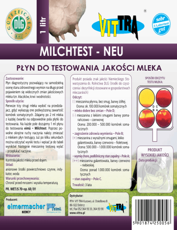 1 litr MILCHTEST - NEU PŁYN DO TESTOWANIA JAKOŚCI MLEKA Zastosowanie: Płyn diagnostyczny pozwalający na samodzielną ocenę stanu zdrowotnego wymion na długo przed pojawieniem się widocznych zmian jakościowych mleka tzn. kłaczków, krwi i wodnistości. Sposób użycia: Pierwsze trzy strugi mleka wydoić na przedzdajacz, gdyż wykazują one podwyższoną zawartość komórek somatycznych. Zdajamy po 2 ml mleka z każdej ćwiartki na odpowiednie pola płytki do testowania. Na każde pole dozujemy 1 ml płynu do testowania eimü - Milchtest. Poprzez powolne okrężne ruchy naczynia należy zmieszać z mlekiem płyn testujący. Już po kilku sekundach można odczytać wyniki testu i wpisać je do tabeli wyników. Następnie mieszaninę testową wylać i przepłukać naczynie. Wskazania: Kontrola jakości mleka przed dojem. Skład: anionowe środki powierzchniowo czynne, indykator, woda Warunki przechowywania: Chronić przed mrozem i wysoka temperaturą. PR. WET.IS 70-op. 60/01 Producent: Produkt posiada znak jakości Niemieckiego Stowarzyszenia ds. Rolnictwa DLG (środki do czyszczenia i dezynfekcji stosowane w gospodarstwach mleczarskich) Odczyt: ( ) mieszanina płynna, bez smug, barwy żółtej. Ocena: ok. 100.000 komórek somatycznych - mleko dobre bez zmian – Pole D; (-) mieszanina z lekkimi smugami barwy pomarańczowo – czerwonej Ocena: 200.000 – 500.000 komórek somatycznych - zagrożenie zdrowia wymienia – Pole B; (+) mieszanina z wyraźnymi smugami, lekko galaretowata, barwy czerwono – fioletowej. Ocena: 500.000 – 1.000.000 komórek somatycznych - wymię chore, podkliniczny stan zapalny – Pole A; (++) mieszanina galaretowata, barwy czerwono – niebieskiej. Ocena: ponad 1.000.000 komórek somatycznych – stan zapalny – Pole C. Trwałość: 3 lata Dystrybutor: P.P.H. VIT-TRA Kusowo, ul. Osiedlowa 8 86-022 Dobrcz tel./fax 052 364 93 33, 364 93 90 www.vittra.pl SPOSÓB ODCZYTU TESTU MLEKA: Produkt Wysokiej jakości Data produkcji: