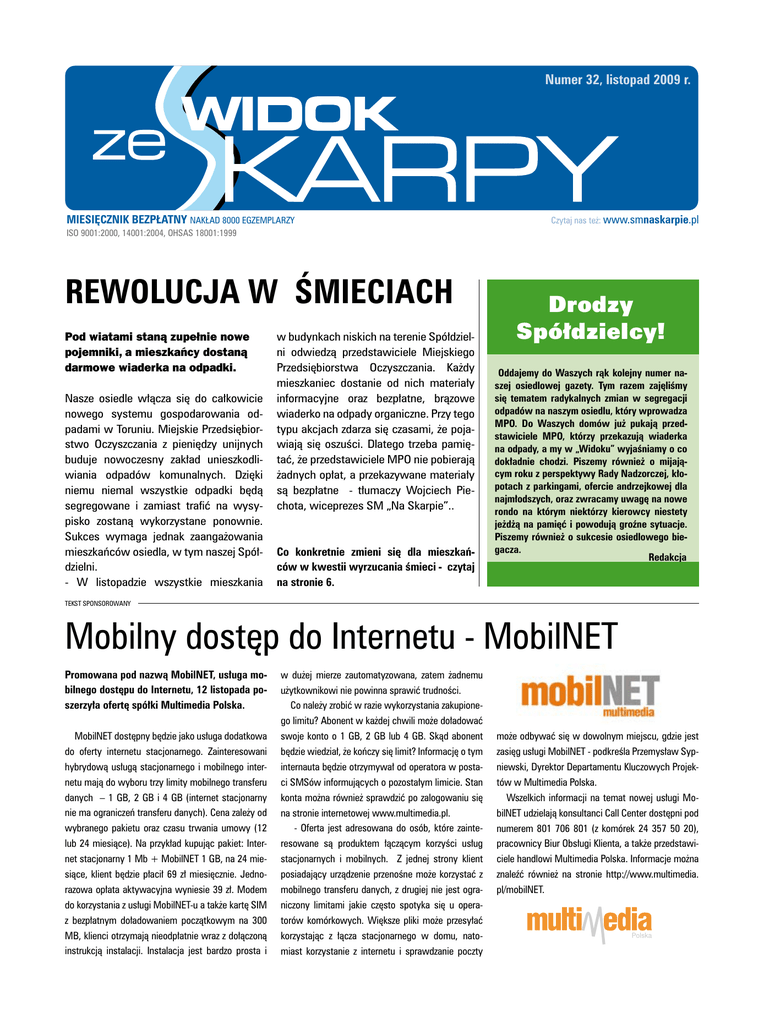 Magazyn mieszkańców SM „Na Skarpie” Numer 32, listopad 2009 r. MIESIĘCZNIK BEZPŁATNY NAKŁAD 8000 EGZEMPLARZY Czytaj nas też: www.smnaskarpie.pl ISO 9001:2000, 14001:2004, OHSAS 18001:1999 Rewolucja w Śmieciach Pod wiatami staną zupełnie nowe pojemniki, a mieszkańcy dostaną darmowe wiaderka na odpadki. Nasze osiedle włącza się do całkowicie nowego systemu gospodarowania odpadami w Toruniu. Miejskie Przedsiębiorstwo Oczyszczania z pieniędzy unijnych buduje nowoczesny zakład unieszkodliwiania odpadów komunalnych. Dzięki niemu niemal wszystkie odpadki będą segregowane i zamiast trafić na wysypisko zostaną wykorzystane ponownie. Sukces wymaga jednak zaangażowania mieszkańców osiedla, w tym naszej Spółdzielni. - W listopadzie wszystkie mieszkania w budynkach niskich na terenie Spółdzielni odwiedzą przedstawiciele Miejskiego Przedsiębiorstwa Oczyszczania. Każdy mieszkaniec dostanie od nich materiały informacyjne oraz bezpłatne, brązowe wiaderko na odpady organiczne. Przy tego typu akcjach zdarza się czasami, że pojawiają się oszuści. Dlatego trzeba pamiętać, że przedstawiciele MPO nie pobierają żadnych opłat, a przekazywane materiały są bezpłatne - tłumaczy Wojciech Piechota, wiceprezes SM „Na Skarpie”.. Co konkretnie zmieni się dla mieszkańców w kwestii wyrzucania śmieci - czytaj na stronie 6. Drodzy Spółdzielcy! Oddajemy do Waszych rąk kolejny numer naszej osiedlowej gazety. Tym razem zajęliśmy się tematem radykalnych zmian w segregacji odpadów na naszym osiedlu, który wprowadza MPO. Do Waszych domów już pukają przedstawiciele MPO, którzy przekazują wiaderka na odpady, a my w „Widoku” wyjaśniamy o co dokładnie chodzi. Piszemy również o mijającym roku z perspektywy Rady Nadzorczej, kłopotach z parkingami, ofercie andrzejkowej dla najmłodszych, oraz zwracamy uwagę na nowe rondo na którym niektórzy kierowcy niestety jeżdżą na pamięć i powodują groźne sytuacje. Piszemy również o sukcesie osiedlowego biegacza. Redakcja TEKST SPONSOROWANY Mobilny dostęp do Internetu - MobilNET Promowana pod nazwą MobilNET, usługa mobilnego dostępu do Internetu, 12 listopada poszerzyła ofertę spółki Multimedia Polska. MobilNET dostępny będzie jako usługa dodatkowa do oferty internetu stacjonarnego. Zainteresowani hybrydową usługą stacjonarnego i mobilnego internetu mają do wyboru trzy limity mobilnego transferu danych – 1 GB, 2 GB i 4 GB (internet stacjonarny nie ma ograniczeń transferu danych). Cena zależy od wybranego pakietu oraz czasu trwania umowy (12 lub 24 miesiące). Na przykład kupując pakiet: Internet stacjonarny 1 Mb + MobilNET 1 GB, na 24 miesiące, klient będzie płacił 69 zł miesięcznie. Jednorazowa opłata aktywacyjna wyniesie 39 zł. Modem do korzystania z usługi MobilNET-u a także kartę SIM z bezpłatnym doładowaniem początkowym na 300 MB, klienci otrzymają nieodpłatnie wraz z dołączoną instrukcją instalacji. Instalacja jest bardzo prosta i w dużej mierze zautomatyzowana, zatem żadnemu użytkownikowi nie powinna sprawić trudności. Co należy zrobić w razie wykorzystania zakupionego limitu? Abonent w każdej chwili może doładować swoje konto o 1 GB, 2 GB lub 4 GB. Skąd abonent będzie wiedział, że kończy się limit? Informację o tym internauta będzie otrzymywał od operatora w postaci SMSów informujących o pozostałym limicie. Stan konta można również sprawdzić po zalogowaniu się na stronie internetowej www.multimedia.pl. - Oferta jest adresowana do osób, które zainteresowane są produktem łączącym korzyści usług stacjonarnych i mobilnych. Z jednej strony klient posiadający urządzenie przenośne może korzystać z mobilnego transferu danych, z drugiej nie jest ograniczony limitami jakie często spotyka się u operatorów komórkowych. Większe pliki może przesyłać korzystając z łącza stacjonarnego w domu, natomiast korzystanie z internetu i sprawdzanie poczty może odbywać się w dowolnym miejscu, gdzie jest zasięg usługi MobilNET - podkreśla Przemysław Sypniewski, Dyrektor Departamentu Kluczowych Projektów w Multimedia Polska. Wszelkich informacji na temat nowej usługi MobilNET udzielają konsultanci Call Center dostępni pod numerem 801 706 801 (z komórek 24 357 50 20), pracownicy Biur Obsługi Klienta, a także przedstawiciele handlowi Multimedia Polska. Informacje można znaleźć również na stronie http://www.multimedia. pl/mobilNET.