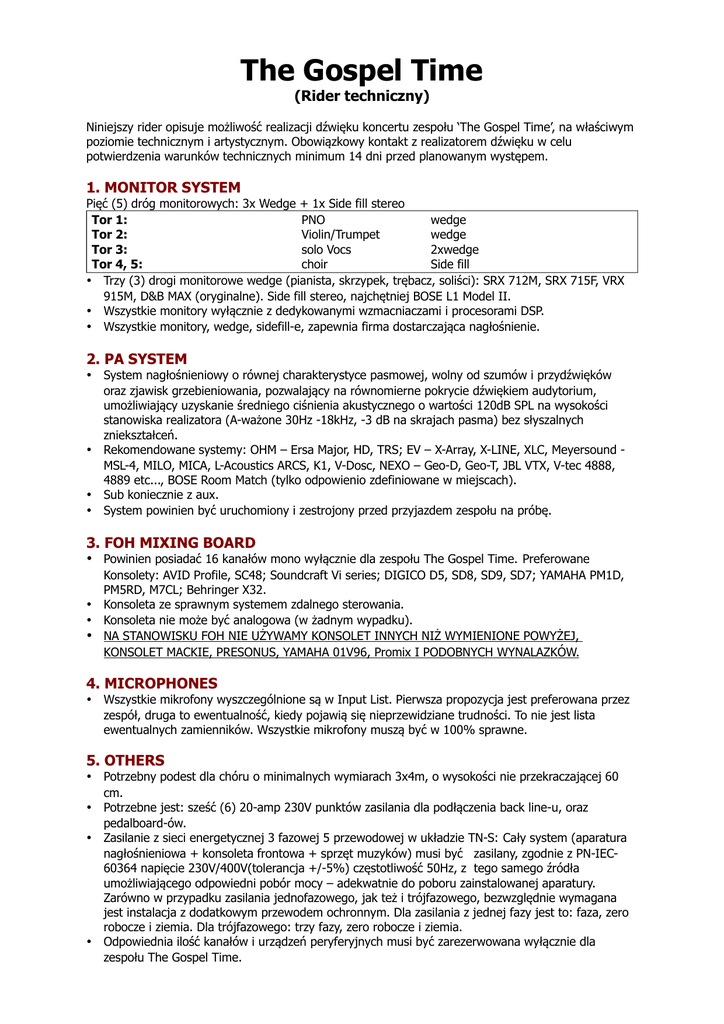 The Gospel Time (Rider techniczny) Niniejszy rider opisuje możliwość realizacji dźwięku koncertu zespołu ‘The Gospel Time’, na właściwym poziomie technicznym i artystycznym. Obowiązkowy kontakt z realizatorem dźwięku w celu potwierdzenia warunków technicznych minimum 14 dni przed planowanym występem. 1. MONITOR SYSTEM Pięć (5) dróg monitorowych: 3x Wedge + 1x Side fill stereo Tor 1: PNO wedge Tor 2: Violin/Trumpet wedge Tor 3: solo Vocs 2xwedge Tor 4, 5: choir Side fill Trzy (3) drogi monitorowe wedge (pianista, skrzypek, trębacz, soliści): SRX 712M, SRX 715F, VRX 915M, D&B MAX (oryginalne). Side fill stereo, najchętniej BOSE L1 Model II. Wszystkie monitory wyłącznie z dedykowanymi wzmacniaczami i procesorami DSP. Wszystkie monitory, wedge, sidefill-e, zapewnia firma dostarczająca nagłośnienie. 2. PA SYSTEM System nagłośnieniowy o równej charakterystyce pasmowej, wolny od szumów i przydźwięków oraz zjawisk grzebieniowania, pozwalający na równomierne pokrycie dźwiękiem audytorium, umożliwiający uzyskanie średniego ciśnienia akustycznego o wartości 120dB SPL na wysokości stanowiska realizatora (A-ważone 30Hz -18kHz, -3 dB na skrajach pasma) bez słyszalnych zniekształceń. Rekomendowane systemy: OHM – Ersa Major, HD, TRS; EV – X-Array, X-LINE, XLC, Meyersound MSL-4, MILO, MICA, L-Acoustics ARCS, K1, V-Dosc, NEXO – Geo-D, Geo-T, JBL VTX, V-tec 4888, 4889 etc..., BOSE Room Match (tylko odpowienio zdefiniowane w miejscach). Sub koniecznie z aux. System powinien być uruchomiony i zestrojony przed przyjazdem zespołu na próbę. 3. FOH MIXING BOARD Powinien posiadać 16 kanałów mono wyłącznie dla zespołu The Gospel Time. Preferowane Konsolety: AVID Profile, SC48; Soundcraft Vi series; DIGICO D5, SD8, SD9, SD7; YAMAHA PM1D, PM5RD, M7CL; Behringer X32. Konsoleta ze sprawnym systemem zdalnego sterowania. Konsoleta nie może być analogowa (w żadnym wypadku). NA STANOWISKU FOH NIE UŻYWAMY KONSOLET INNYCH NIŻ WYMIENIONE POWYŻEJ, KONSOLET MACKIE, PRESONUS, YAMAHA 01V96, Promix I PODOBNYCH WYNALAZKÓW. 4. MICROPHONES Wszystkie mikrofony wyszczególnione są w Input List. Pierwsza propozycja jest preferowana przez zespół, druga to ewentualność, kiedy pojawią się nieprzewidziane trudności. To nie jest lista ewentualnych zamienników. Wszystkie mikrofony muszą być w 100% sprawne. 5. OTHERS Potrzebny podest dla chóru o minimalnych wymiarach 3x4m, o wysokości nie przekraczającej 60 cm. Potrzebne jest: sześć (6) 20-amp 230V punktów zasilania dla podłączenia back line-u, oraz pedalboard-ów. Zasilanie z sieci energetycznej 3 fazowej 5 przewodowej w układzie TN-S: Cały system (aparatura nagłośnieniowa + konsoleta frontowa + sprzęt muzyków) musi być zasilany, zgodnie z PN-IEC60364 napięcie 230V/400V(tolerancja +/-5%) częstotliwość 50Hz, z tego samego źródła umożliwiającego odpowiedni pobór mocy – adekwatnie do poboru zainstalowanej aparatury. Zarówno w przypadku zasilania jednofazowego, jak też i trójfazowego, bezwzględnie wymagana jest instalacja z dodatkowym przewodem ochronnym. Dla zasilania z jednej fazy jest to: faza, zero robocze i ziemia. Dla trójfazowego: trzy fazy, zero robocze i ziemia. Odpowiednia ilość kanałów i urządzeń peryferyjnych musi być zarezerwowana wyłącznie dla zespołu The Gospel Time. Nie dopuszcza się stanowiska FOH na lub obok sceny, we wnękach ani na balkonach czy antresolach lub pod nimi. Wszelkie odstępstwa od niniejszych wymagań, a w szczególności wykorzystanie urządzeń innych niż wymienione MUSZĄ być uzgodnione i zaaprobowane przez realizatora zespołu: Kamil Bobrukiewicz. Firma dostarczająca i obsługująca dźwięk, światło oraz urządzenia energetyczne bierze na siebie pełną odpowiedzialność za bezpieczeństwo zespołu, techniki oraz realizatorów. Ekipa obsługująca koncert musi składać się z minimum czterech (4) osób: technik systemu foh (FOH), szef sceny (STG), technik sceny (STG), elektryk z uprawnieniami dozoru (STG). Wszyscy!!! członkowie ekipy technicznej obsługującej wydarzenie muszą!!! być bezwzględnie trzeźwi. Nie dopuszczamy pracy z osobami pod wpływem alkoholu, narkotyków lub innych substancji odurzających. 7. RIDER LIST W razie problemów ze spełnieniem niniejszych wymagań, bądź jakichkolwiek wątpliwości dotyczących aspektów technicznych, zespół udostępnia listę riderową sprawdzonych przez nas firm nagłośnieniowych, spełniających wszelkie nasze wymagania. Zamiast rozmawiać o budżetach proszę sprawdzić możliwości realizacji z podanymi poniżej firmami. Najchętniej współpracujemy z firmami: BTS P. A. - Bartosz Grabowski +48 (0) 698 616 848, [email protected] BM Productions Maria Meo Khamsene - +48 (0) 510 048 632, [email protected] SoszynskiMIX - +48 (0) 601 267 286, [email protected] Firma nagłośnieniowa bierze na siebie odpowiedzialność za bezpieczeństwo muzyków i realizatorów w trakcie prób i koncertu. Tylko menager, realizator dźwięku zespołu i możliwości techniczne decydują o głośności dźwięku. 8. CONTACT Produkcja/Organizacja: Malwina Lewińska: +48 (0) 602 404 575; [email protected] Realizator dźwięku: Kamil Bobrukiewicz – BM Productions: +48 (0) 510 048 632; [email protected] 9. INPUT LIST Nr Source Converter +48 Stand 1,2 Piano 2xBSS AR-133 In N/A 3 Violin Audio-technica ATM350 In N/A 4 Trumpet Audio-technica ATM350 In N/A 5 Voc solo 1 Audio-technica AE 4100/Shure BETA 58 N/A Long 6 Voc solo 2 Audio-technica AE 4100/Shure BETA 58 N/A Long 7 Voc Choir sopran 1p Neumann KM-184 In Long 8 Voc Choir sopran 2p Neumann KM-184 In Long 9 Voc Choir tenor AKG c-414\Neumann KM-184 In Long 10 Voc Choir tenor AKG c-414\Neumann KM-184 In Long 11 Voc Choir alt Neumann KM-184 In Long 12 Voc Choir alt Neumann KM-184 In Long 13,14 REV long/PLATE 15,16 Player 2x XLR\TRS or 1x 6,3 TRS N/A N/A 17orTB channel TalkBack SM 58 LCE/lub inny z wyłącznikiem Dokument składa się z dwóch (2) 