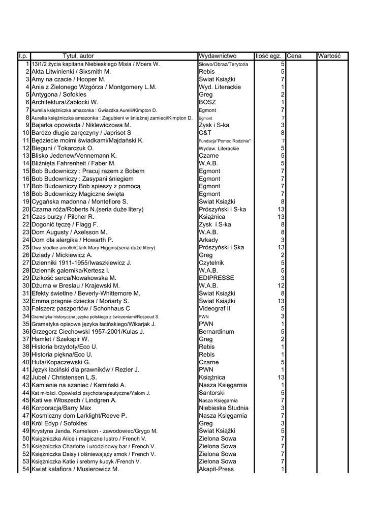 I.p. 1 2 3 4 5 6 7 8 9 10 11 12 13 14 15 16 17 18 19 20 21 22 23 24 25 26 27 28 29 30 31 32 33 34 35 36 37 38 39 40 41 42 43 44 45 46 47 48 49 50 51 52 53 54 Tytuł, autor Wydawnictwo 13i1/2 Ŝycia kapitana Niebieskiego Misia / Moers W. Słowo/Obraz/Terytoria Akta Litwinienki / Sixsmith M. Amy na czacie / Hooper M. Ania z Zielonego Wzgórza / Montgomery L.M. Antygona / Sofokles Architektura/Zabłocki W. Rebis Świat KsiąŜki Wyd. Literackie Greg BOSZ Ilość egz. Cena 5 5 7 1 2 1 7 Aurelia księŜniczka amazonka : Gwiazdka Aurelii/Kimpton D. Egmont Aurelia księŜniczka amazonka : Zagubieni w śnieŜnej zamieci/Kimpton D. Egmont 7 Bajarka opowiada / Niklewiczowa M. Bardzo długie zaręczyny / Japrisot S Będziecie moimi świadkami/Majdański K. Bieguni / Tokarczuk O. Blisko Jedenew/Vennemann K. Bliźnięta Fahrenheit / Faber M. Bob Budowniczy : Pracuj razem z Bobem Bob Budowniczy : Zasypani śniegiem Bob Budowniczy:Bob spieszy z pomocą Bob Budowniczy:Magiczne święta Cygańska madonna / Montefiore S. Czarna róŜa/Roberts N.(seria duŜe litery) Czas burzy / Pilcher R. Dogonić tęczę / Flagg F. Dom Augusty / Axelsson M. Dom dla alergika / Howarth P. Zysk i S-ka C&T 3 8 Fundacja"Pomoc Rodzinie" Wydaw. Literackie Dziady / Mickiewicz A. Dzienniki 1911-1955/Iwaszkiewicz J. Dziennik galernika/Kertesz I. Dzikość serca/Nowakowska M. DŜuma w Breslau / Krajewski M. Efekty świetlne / Beverly-Whittemore M. Emma pragnie dziecka / Moriarty S. Fałszerz paszportów / Schonhaus C Czarne W.A.B. Egmont Egmont Egmont Egmont Świat KsiąŜki Prószyński i S-ka KsiąŜnica Zysk i S-ka W.A.B. Arkady Prószyński i Ska Greg Czytelnik W.A.B. EDIPRESSE W.A.B. Świat KsiąŜki Świat KsiąŜki Videograf II Gramatyka historyczna języka polskiego z ćwiczeniami/Rospoud S. PWN Gramatyka opisowa języka łacińskiego/Wikarjak J. PWN Bernardinum Greg Rebis Rebis Czarne PWN KsiąŜnica Nasza Księgarnia Santorski Dwa słodkie aniołki/Clark Mary Higgins(seria duŜe litery) Grzegorz Ciechowski 1957-2001/Kulas J. Hamlet / Szekspir W. Historia brzydoty/Eco U. Historia piękna/Eco U. Huta/Kopaczewski G. Język łaciński dla prawników / Rezler J. Jubel / Christensen L.S. Kamienie na szaniec / Kamiński A. Kat miłości. Opowieści psychoterapeutyczne/Yalom J. Kati we Włoszech / Lindgren A. Korporacja/Barry Max Kosmiczny dom Larklight/Reeve P. Król Edyp / Sofokles Krystyna Janda. Kameleon - zawodowiec/Grygo M. KsięŜniczka Alice i magiczne lustro / French V. KsięŜniczka Charlotte i urodzinowy bar / French V. KsięŜniczka Daisy i olśniewający smok / French V. KsięŜniczka Katie i srebrny kucyk /French V. Kwiat kalafiora / Musierowicz M. Nasza Księgarnia Niebieska Studnia Nasza Księgarnia Greg Świat KsiąŜki Zielona Sowa Zielona Sowa Zielona Sowa Zielona Sowa Akapit-Press 7 5 5 5 7 7 7 7 8 13 13 8 8 3 13 2 5 5 3 12 8 13 5 3 1 5 2 1 1 5 1 13 1 5 7 3 7 3 5 7 7 7 7 1 Wartość 55 56 57 58 59 60 61 62 63 64 65 66 67 68 69 70 71 72 73 74 75 76 77 78 79 80 81 82 83 84 85 86 87 88 89 90 91 92 93 94 95 96 97 98 99 100 101 102 103 104 105 106 107 108 109 Kwiat pustyni / Dirie W. Legendy o świętych / Stadtmuller E. Leonardo da Vinci. Lot wyobraźni/Nicholl CH. Lew, czarownica i stara szafa/Lewis C.S Lisia/ Nowak E. Listy starego diabła do młodego/Lewis C.S Ludzkie ciało / Parker S. Madika / Lindgren A. Madika z Czerwcowego WzgórzA / Lindgren A. Makbet / Szekspir W. Mały ksiąŜę / Saint-Exupery A. de Manewrowanie jachtem Ŝaglowym/Berkowski M. Metodologia badań psychologicznych / Brzeziński J. Mitologia / Parandowski J. Młodość / Coetzee J.M. Musierowicz na gwiazdkę/Musierowicz M. Na dnie nieba / Gretkowska M. Najpiękniejsze wiersze/ Kasprowicz J. Największe wydarzenia w historii świata Największe wydarzenia z historii sztuki Nawigacja dla Ŝeglarzy / Czajewski J. Nie-Boska komedia / Krasiński Z. Nie ponaglaj rzeki/Martin J.C. Nowe przygody Mikołajka T.2 / Gościnny R. Obiad w restauracji dla samotnych / Tyler A. Obraz utajony / Michałowska M. Od słowa do słowa : leksykon / Kopaliński W. Ojciec chrzestny / Puzo M. Opium w rosole / Musierowicz M. Ostatni szczegół / Coben H. Ostatnie lato / Brashares A. Pamiętnik Dawida Rubinowicza/ Piąte dziecko / Lessing D. Pierwszy bal / Steel D. Pod purpurowym niebem/ Martin J.C. PiS-neyland / Lis T. PodróŜ Bena / Lessing D. Przy obieraniu cebuli / Grass G. Przypadek Adolfa H./Schmitt-E. E. Przypadkowy turysta / Tyler A. Ptak z Uliety / Davies M. Public relations / Rozwadowska B. Pudełko w kształcie serca/Hill J. Świat KsiąŜki eSPe W.A.B. Media Rodzina Egmont Media Rodzina Wyd. SBM Nasza Księgarnia Nasza Księgarnia Greg Muza ALMA-PRESS PWN Greg Znak Akapit-Press Świat KsiąŜki bis MAK MAK ALMA-PRESS Greg Świat KsiąŜki Znak KsiąŜnica Galeria f5&Księgarnia Fot. Słowenia /Jurecki M. Słownik włosko-polski, polsko-włoski/Jamrozik E. Społeczna psychologia rozwoju/Brzezińska A. Sprawiedliwy wśród narodów świata/Szpytma M. Rytm Albatros Akapit-Press Albatros Nowa Proza KsiąŜka i Wiedza PIW Świat KsiąŜki Świat KsiąŜki Świat KsiąŜki PIW Polnord-Oskar Znak KsiąŜnica KsiąŜnica Emka Prószyński i S-ka W.A.B. Prószyński i Ska Bibl. Analiz Biblioteka Analiz Biblioteka Analiz Biblioteka Analiz Świat Ksiązki Pascal PWN Scholar Rafael Szelmostwa niegrzecznej dziewczynki/ Vargas LLosa M. Znak Ślad / Cornwell P. Prószyński i S-ka Rafał Wojaczek. Prawdziwe Ŝycie bohatera / Kierc B. Rok w Prowansji/Mayle P. (seria duŜe litery) Rynek ksiąŜki w Polsce 2007. Dystrybucja/ Gołębiowski Ł. Rynek ksiąŜki w Polsce 2007. Poligrafia/Nowak T. Rynek ksiąŜki w Polsce 2007.Who i who/Dobrołęcki P. Rynek ksiąŜki w Polsce 2007.Wydawnictwa/Gołębiewski Ł. Siostry/Steel D. 1 7 2 7 7 7 5 7 7 2 1 2 3 1 5 7 5 1 1 1 2 2 8 12 13 1 3 2 1 8 8 2 5 13 8 5 5 5 5 13 13 5 7 5 13 1 1 1 1 13 4 1 3 4 5 8 110 111 112 113 114 115 116 117 118 119 120 121 122 123 124 125 126 127 128 129 130 131 132 133 134 135 136 137 138 139 140 Świateczny