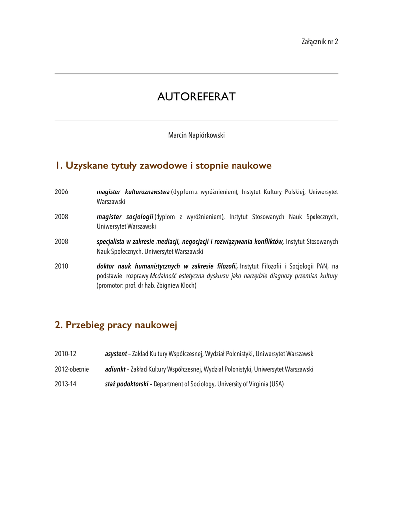 Załącznik nr 2 AUTOREFERAT Marcin Napiórkowski 1. Uzyskane tytuły zawodowe i stopnie naukowe 2006 magister kulturoznawstwa (dyplom z wyróżnieniem), Instytut Kultury Polskiej, Uniwersytet Warszawski 2008 magister socjologii (dyplom z wyróżnieniem), Instytut Stosowanych Nauk Społecznych, Uniwersytet Warszawski 2008 specjalista w zakresie mediacji, negocjacji i rozwiązywania konfliktów, Instytut Stosowanych Nauk Społecznych, Uniwersytet Warszawski 2010 doktor nauk humanistycznych w zakresie filozofii, Instytut Filozofi i Socjologii PAN, na podstawie rozprawy Modalność estetyczna dyskursu jako narzędzie diagnozy przemian kultury (promotor: prof. dr hab. Zbigniew Kloch) 2. Przebieg pracy naukowej 2010-12 asystent – Zakład Kultury Współczesnej, Wydział Polonistyki, Uniwersytet Warszawski 2012-obecnie adiunkt – Zakład Kultury Współczesnej, Wydział Polonistyki, Uniwersytet Warszawski 2013-14 staż podoktorski – Department of Sociology, University of Virginia (USA) 3. Osiągnięcie naukowe wynikające z art. 16 ust. 2 ustawy z dn. 14 marca 2003 r. o stopniach naukowych i tytule naukowym monografa naukowa pt. Władza wyobraźni. Kto wymyśla, co zdarzyło się wczoraj? (Wydawnictwa Uniwersytetu Warszawskiego, Warszawa 2014, 382 s.) Władza wyobraźni opowiada o mechanizmach pamięci kulturowej. Tematem książki są przypadki niesymetrycznych konfiktów pamięci, a więc sytuacje negocjacji odmiennych wizji przeszłości przez strony dysponujące nierówną pozycją społeczną i polityczną, różnym kapitałem kulturowym, dostępem do mediów i przestrzeni publicznej itd. Praca składa się z trzech studiów przypadków połączonych propozycją oryginalnego ujęcia teoretycznego. Przedmiotem opisu w każdej z części książki jest hegemonia hermeneutyczna, a więc zdolność narzucania innym określonych interpretacji przeszłości. Realizuje się ona nie tylko poprzez sugerowanie grupom zdominowanym gotowych rozstrzygnięć dotyczących tego, co „naprawdę” się wydarzyło i jak należy to rozumieć, lecz – przede wszystkim – poprzez narzucanie im schematów poznawczych, w oparciu o które przedstawiciele tych grup sami wytwarzają pożądane przez dominujących interpretacje. Każdej tego rodzaju hegemonii, jak staram się pokazać w książce, towarzyszyć mogą wernakularne praktyki kontr-hegemoniczne w różny sposób podważające monopole prawdy. Poświęcając znaczną uwagę materialnym uwarunkowaniom mechanizmów dominacji (w szczególności umożliwiającym je nośnikom i obiegom medialnym), pamięć zbiorową i związaną z nią hegemonię hermeneutyczną opisuję jako zasób stanowiący zarówno przedmiot rywalizacji jak i środek do uzyskania innych form kapitału (ekonomicznego, politycznego itd.). Zawarte w tytule książki pytanie badawcze „Kto wymyśla, co zdarzyło się wczoraj?” w pełnej wersji brzmi więc: za pomocą jakich środków budowana jest, utrzymywana i narzucana hegemonia interpretacyjna względem przeszłości. Sądzę, że takie ujęcie zagadnienia pamięci kulturowej dostarcza cennych narzędzi interpretacyjnych i jest w literaturze przedmiotu spojrzeniem nowym, choć zarazem stanowiącym kontynuację i twórcze rozwinięcie kilku obecnych w niej nurtów (m.in. gatunkowej semiotyki upamiętnień Jeffreya Olicka, teorii ceremonii kommemoratywnych Paula Connertona czy teorii pamięci kulturowej Jana Assmanna, wiele uwagi poświęcającego obiegom medialnym i ich przemianom). 2 ■ Książka składa się z obszernego wstępu wyznaczającego ramy analizy, trzech szczegółowych studiów przypadków pokazujących zastosowanie metody w oparciu o pracę na materiałach źródłowych oraz dodatków teoretycznych zawierających pogłębione rozwinięcie kluczowych elementów proponowanej koncepcji. We wstępie – na przykładzie analizy społecznych, ekonomicznych i kulturowych mechanizmów, które doprowadziły do ludobójstwa w Rwandzie w roku 1994 w oparciu o źródła wtórne – wskazuję na wzajemną zależność między trzema formami analizowania przeszłości (historia wyobraźni, historia materialna i historia mediów), którym odpowiadają trzy formy dominacji i podporządkowania: (1) władza wyobraźni (obejmująca m.in. monopol na interpretację przeszłości); (2) dominacja ekonomiczna; (3) kontrola nad środkami przekazu. To właśnie zależności między tymi trzema sferami są przedmiotem szczegółowej analizy w kolejnych częściach książki. Trzy studia przypadków składające się na główną treść książki przeprowadzone są w oparciu o analizę szerokiego spektrum materiałów źródłowych. Kolejne części opowiadają o (1) teoriach spiskowych po zamachach z 11 września, (2) uroczystościach żałobnych po katastrofe smoleńskiej oraz (3) dwudziestowiecznej ewolucji wizualnych przedstawień ofar wojny pod wpływem kulturowej recepcji bombardowania Guerniki. Wspólną płaszczyzną interpretacji staje się tu pytanie o tytułową „władzę wyobraźni”, a więc o to, czyja wizja wydarzeń i za pomocą jakich znaków, mediów i praktyk społecznych ustanowiona zostaje jako obowiązująca „prawda o przeszłości”. Pierwsza część książki, napisana w znacznej części w oparciu o materiały zgromadzone podczas pobytu na stażu podoktorskim w USA, poddaje refeksji praktykę „obalania mitów” jako formę symboliczną kształtującą pamięć o zamachach terrorystycznych z 11 września. W oparciu o analizę najważniejszych flmów, książek i stron internetowych należących do nurtu określanego mianem „teorii spiskowych” oraz ich recepcji w „mediach głównego nurtu” pokazuję, że do właściwej „pogromcom mitów” retoryki odwołują się z równą pasją „ofcjalne” wersje i podważające je teorie spiskowe. „Poważna” nauka i „amatorskie” dociekania wzajem wytaczają przeciw sobie argument walki z mitem czy przesądem. Przedstawiciele zarówno jednej, jak i 