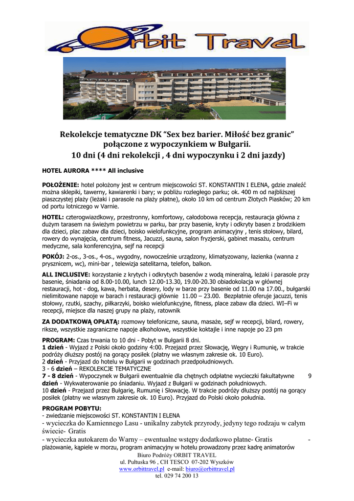 Rekolekcje tematyczne DK “Sex bez barier. Miłość bez granic” połączone z wypoczynkiem w Bułgarii. 10 dni (4 dni rekolekcji , 4 dni wypoczynku i 2 dni jazdy) HOTEL AURORA **** All inclusive POŁOŻENIE: hotel położony jest w centrum miejscowości ST. KONSTANTIN I ELENA, gdzie znaleźć można sklepiki, tawerny, kawiarenki i bary; w pobliżu rozległego parku; ok. 400 m od najbliższej piaszczystej plaży (leżaki i parasole na plaży płatne), około 10 km od centrum Złotych Piasków; 20 km od portu lotniczego w Varnie. HOTEL: czterogwiazdkowy, przestronny, komfortowy, całodobowa recepcja, restauracja główna z dużym tarasem na świeżym powietrzu w parku, bar przy basenie, kryty i odkryty basen z brodzikiem dla dzieci, plac zabaw dla dzieci, boisko wielofunkcyjne, program animacyjny , tenis stołowy, bilard, rowery do wynajęcia, centrum fitness, Jacuzzi, sauna, salon fryzjerski, gabinet masażu, centrum medyczne, sala konferencyjna, sejf na recepcji POKÓJ: 2-os., 3-os., 4-os., wygodny, nowocześnie urządzony, klimatyzowany, łazienka (wanna z prysznicem, wc), mini-bar , telewizja satelitarna, telefon, balkon. ALL INCLUSIVE: korzystanie z krytych i odkrytych basenów z wodą mineralną, leżaki i parasole przy basenie, śniadania od 8.00-10.00, lunch 12.00-13.30, 19.00-20.30 obiadokolacja w głównej restauracji, hot - dog, kawa, herbata, desery, lody w barze przy basenie od 11.00 na 17.00., bułgarski nielimitowane napoje w barach i restauracji głównie 11.00 – 23.00. Bezpłatnie oferuje jacuzzi, tenis stołowy, rzutki, szachy, piłkarzyki, boisko wielofunkcyjne, fitness, place zabaw dla dzieci. WI–Fi w recepcji, miejsce dla naszej grupy na plaży, ratownik ZA DODATKOWĄ OPŁATĄ: rozmowy telefoniczne, sauna, masaże, sejf w recepcji, bilard, rowery, riksze, wszystkie zagraniczne napoje alkoholowe, wszystkie koktajle i inne napoje po 23 pm PROGRAM: Czas trwania to 10 dni - Pobyt w Bułgarii 8 dni. 1 dzień - Wyjazd z Polski około godziny 4:00. Przejazd przez Słowację, Węgry i Rumunię, w trakcie podróży dłuższy postój na gorący posiłek (płatny we własnym zakresie ok. 10 Euro). 2 dzień - Przyjazd do hotelu w Bułgarii w godzinach przedpołudniowych. 3 - 6 dzień – REKOLEKCJE TEMATYCZNE 7 - 8 dzień - Wypoczynek w Bułgarii ewentualnie dla chętnych odpłatne wycieczki fakultatywne 9 dzień - Wykwaterowanie po śniadaniu. Wyjazd z Bułgarii w godzinach południowych. 10 dzień - Przejazd przez Bułgarię, Rumunię i Słowację. W trakcie podróży dłuższy postój na gorący posiłek (płatny we własnym zakresie ok. 10 Euro). Przyjazd do Polski około południa. PROGRAM POBYTU: - zwiedzanie miejscowości ST. KONSTANTIN I ELENA - wycieczka do Kamiennego Lasu - unikalny zabytek przyrody, jedyny tego rodzaju w całym świecie- Gratis - wycieczka autokarem do Warny – ewentualne wstępy dodatkowo płatne- Gratis plażowanie, kąpiele w morzu, program animacyjny w hotelu prowadzony przez kadrę animatorów Biuro Podróży ORBIT TRAVEL ul. Pułtuska 96 , CH TESCO 07-202 Wyszków www.orbittravel.pl e-mail: [email protected] tel. 029 74 200 13 - (lotki, zajęcia sportowo-animacyjne na plaży i na basenie), rozgrywki sportowe i zajęcia integracyjne PROGRAM FAKULTATYWNY: NESSEBAR : Około 100 kilometrów na północ od Złotych Piasków, znajduje się prawdziwa historyczna perła, nie tylko Bułgarii, ale i całego świata – Nessebar. Jest to najstarsza miejscowość w Bułgarii i jedna z najstarszych w Europie. Najwcześniejsze ślady tutejszego osadnictwa pochodzą sprzed trzech tysięcy lat (ok. 30 Euro) AQUAPOLIS MIASTECZKO WODNE W ZŁOTYCH PIASKACH - zbudowane w stylu mauretańskośródziemnomorskim na powierzchni 40 tys. m.kw. z dziesiątkami zjeżdżalni i innych wodnych atrakcji. (ok. 20 Euro) WARNA + DELFINARIUM - popołudniowa wycieczka autokarowa do Warny, w programie Mauzoleum Warneńczyka, show w delfinarium i czas wolny na zakupy (ok. 20 Euro) ILOŚĆ DNI Cena za osobę 10 dni / 7 nocy All inclusive 1600,00zł osoba dorosła w pokoju 2 os 1270,00zł dziecko od 13 – 18 lat 1000,00zł dziecko do 2 - 13 lat 400,00zł dziecko do 2 lat 10 dni / 7 nocy All inclusive Dojazd własny : 250zł od osoby taniej Cena zawiera: transport komfortowym autokarem, 7 noclegów, wyżywienie 7 x All inclusive według programu – bez napojów alkoholowych, usługę pilota, ubezpieczenie NNW KL podatek VAT, Cena nie zawiera: opłaty klimatycznej w wysokości 10 Euro – jednorazowa opłata za pobyt UWAGA: Organizatorem jest sprawdzone biuro podróży współpracujące min. z DK Diecezji łomżyńskiej. Zgłoszenia i pytania proszę przesyłać na mail: [email protected] do Lidki Rybarczyk W zgłoszeniu podajemy imiona i nazwiska uczestników, datę urodzenia, adres zameldowania i nr telefonu kontaktowego. Zaliczkę w wysokości 10% wpłacamy do 28.02.2015 na konto BP Orbit Travel. Podaję nr konta: F.H EDMAR,ORBIT TRAVEL, PBS WYSZKÓW : 12 8931 0003 0000 8817 2001 0002 W tytule przelewu : imiona i nazwiska wszystkich uczestników, datę urodzenia adres zameldowania i nr telefonu kontaktowego. Jak się nie zmieści to oddzielnie mailem na adres [email protected] Biuro Podróży ORBIT TRAVEL ul. Pułtuska 96 , CH TESCO 07-202 Wyszków www.orbittravel.pl e-mail: [email protected] tel. 029 74 200 13