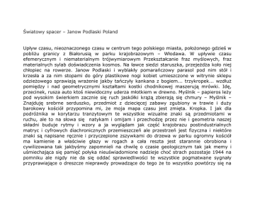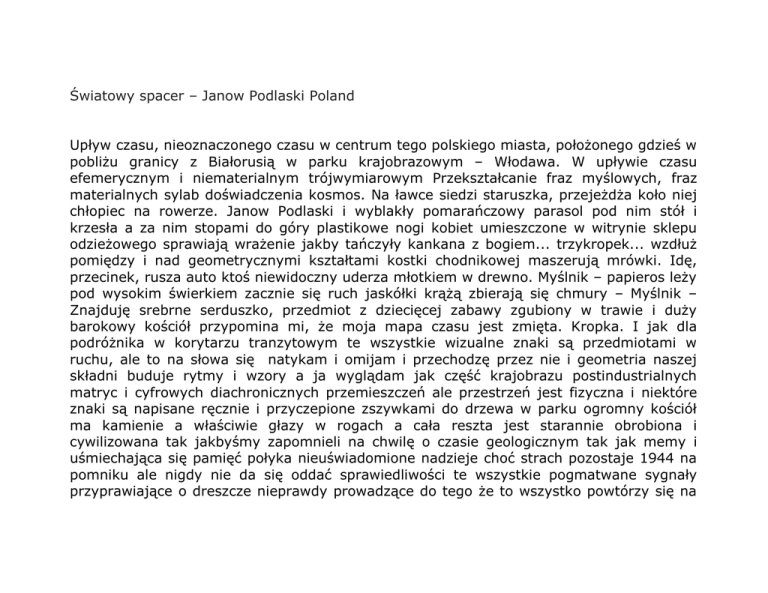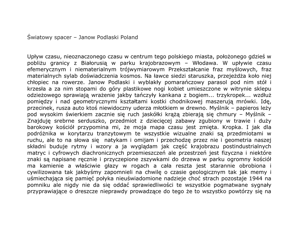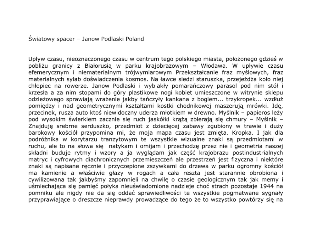 Światowy spacer – Janow Podlaski Poland Upływ czasu, nieoznaczonego czasu w centrum tego polskiego miasta, położonego gdzieś w pobliżu granicy z Białorusią w parku krajobrazowym – Włodawa. W upływie czasu efemerycznym i niematerialnym trójwymiarowym Przekształcanie fraz myślowych, fraz materialnych sylab doświadczenia kosmos. Na ławce siedzi staruszka, przejeżdża koło niej chłopiec na rowerze. Janow Podlaski i wyblakły pomarańczowy parasol pod nim stół i krzesła a za nim stopami do góry plastikowe nogi kobiet umieszczone w witrynie sklepu odzieżowego sprawiają wrażenie jakby tańczyły kankana z bogiem... trzykropek... wzdłuż pomiędzy i nad geometrycznymi kształtami kostki chodnikowej maszerują mrówki. Idę, przecinek, rusza auto ktoś niewidoczny uderza młotkiem w drewno. Myślnik – papieros leży pod wysokim świerkiem zacznie się ruch jaskółki krążą zbierają się chmury – Myślnik – Znajduję srebrne serduszko, przedmiot z dziecięcej zabawy zgubiony w trawie i duży barokowy kościół przypomina mi, że moja mapa czasu jest zmięta. Kropka. I jak dla podróżnika w korytarzu tranzytowym te wszystkie wizualne znaki są przedmiotami w ruchu, ale to na słowa się natykam i omijam i przechodzę przez nie i geometria naszej składni buduje rytmy i wzory a ja wyglądam jak część krajobrazu postindustrialnych matryc i cyfrowych diachronicznych przemieszczeń ale przestrzeń jest fizyczna i niektóre znaki są napisane ręcznie i przyczepione zszywkami do drzewa w parku ogromny kościół ma kamienie a właściwie głazy w rogach a cała reszta jest starannie obrobiona i cywilizowana tak jakbyśmy zapomnieli na chwilę o czasie geologicznym tak jak memy i uśmiechająca się pamięć połyka nieuświadomione nadzieje choć strach pozostaje 1944 na pomniku ale nigdy nie da się oddać sprawiedliwości te wszystkie pogmatwane sygnały przyprawiające o dreszcze nieprawdy prowadzące do tego że to wszystko powtórzy się na nowo młoda dziewczyna o pieknych ramionach odchyla się do tyłu tak żeby wszyscy zobaczyli i wyciąga do przodu nogi... trzykropek....starsza kobieta obserwuje młodszą kobietę i stoi zajmując pozycję i myślę o tej jeszcze starszej kobiecie w chustce która po prostu patrzy w dal uśmiechając się ten uśmiech mądry i gdzieś tajemniczy śmiejący się z czasu a może z pogranicza niepewności pozostawionej przez wiatr który przeleciał nad parkiem i liście tych drzew mówiły frazami które nami wstrząsają i powodują że ptaki lecą światło jest tak piękne i teraz przesuwa się w dół wzgórza kolejny liść spada jak refleksja albo ostatni okruch lustra albo sen kobiety idą do kościoła jest upał ubrane są w białe bluzki obserwuję oglądam jestem świadkiem Targowicy Uwaga Malplakiki 1918 i znak 40 w kole na poboczu i te droga nachyla się w jedną stronę potem w drugą tak jakby skończyło się piwo tej nocy połowa łupiny orzecha włoskiego w otoczeniu szyszek sosnowych i śpiewu ptaków rozmawiających ze sobą docierają inaczej do każdego ucha i tak jak nagły wybuch dżwięku słońce wychodzi z ukrycia a chmury oświetlone są jak jakaś dekoracja w czasie realnym Cyfrowy Polsat antena satelitarna łącząca ludzi z światem cybernetycznym jest przyczepiona do budynku jak pluskwa albo stalowy bandaż opartujący rany wojny i pomalowany na biało i dzwon kościelny dzwoni to tylko nagranie i pomnik wyłania się teraz ze skromnymi czerwonymi lampami i stara cementowa gwiazda z innej epoki w tym samym miejscu 1944 duchy wojny na polach a drzewo umarło nad Bugiem potrącane przez wiatr zardzewiałe blachy otaczają budynek w tym syntetycznym spacerze przez czas i w czas po śladach zbudowanego świata gdyby tak kamienie mogły przemówić kwiaty na pomniku z datą 1979 a my jesteśmy trochę dalej i w CZASIE KOMPLETNYM jest TROCHĘ GO plastik owija żużlowy blok tak szary szary szary i stos drewna przypomina nam wszystkim że zima przychodzi co roku każdego roku w epoce globalnego ocieplenia widać cienie bramy potem orchidee i potem krzaki i rośliny i kolejny cień idącej osoby tym razem niedaleko plastikowego bociana i pies ujada niedaleko stosu niebieskich plastikowych toreb które błyskają swoim kolorem w słońcu które coraz niżej i rośnie kilka czerwonych róż a mężczyźni stoją razem gdzie indziej mają przerwę zeszli z rusztowania ODPOCZNIJ na CHWILĘ w CZASIE w tym odległym miejscu gdzie można zobaczyć boisko z zardzewiałymi bramkami dzień po przegranym meczu POLSKI z PORTUGALIĄ Chrupiące na codzien i nie wiem dlaczego myślę o stacji z obrazu NIKIFORA obok maleńskiego punktu Coca Coli bez ludzi. Wchodząc w tej sekundzie nieskończenie uwarunkowany czasem płynącym i jak zegar bez wskazówek wieczne światło łączy razem wszystkie elementy. Cementowe sześcioboki na ziemi tworzą platformę dla samochodów przy nadmuchiwanym basenie dla komarów i dzieci jest grzyb i wierzba mężczyzna z kosą kosi trawę inny ostrzy ostrze daleko stąd zboże kłądzie się nisko na polach czarny pies z zawiniętym ogonem idzie po zakurzonej drodze. Gdzie jest nasz dom? Czy przyroda jest domem? BIM BOM. Kropka. Kable elektryczne zakręcają pod kątem 45 stopni przy opuszczonym domu bez okien nie podłączonym do niczego... Przypomnienie domu który był kiedyś domem rodzinnym...Trzykropek... Stary Pawtow widać starą zakrytą studnię i schody prowadzące donikąd jedynie do nieba numer 68 ręcznie namalowany. Matka Boska wokół kwiaty i data 1918 i jest w skrzynce na białym filarze który stoi tu szkło jest czyste słychać odgłos traktoru diesel ciągnący snopy siana pola wyglądają jak plamy czasu poza miastem teraz żółte zielone plamy barwne tak małe kwiatki także w czasie te myśli moich pomysłów rosną jak chmury lub płatki kwiatu w otaczającej przestrzeni pełen widok i ślady opon na piasku asfaltowa droga na starych skałach polodowco
