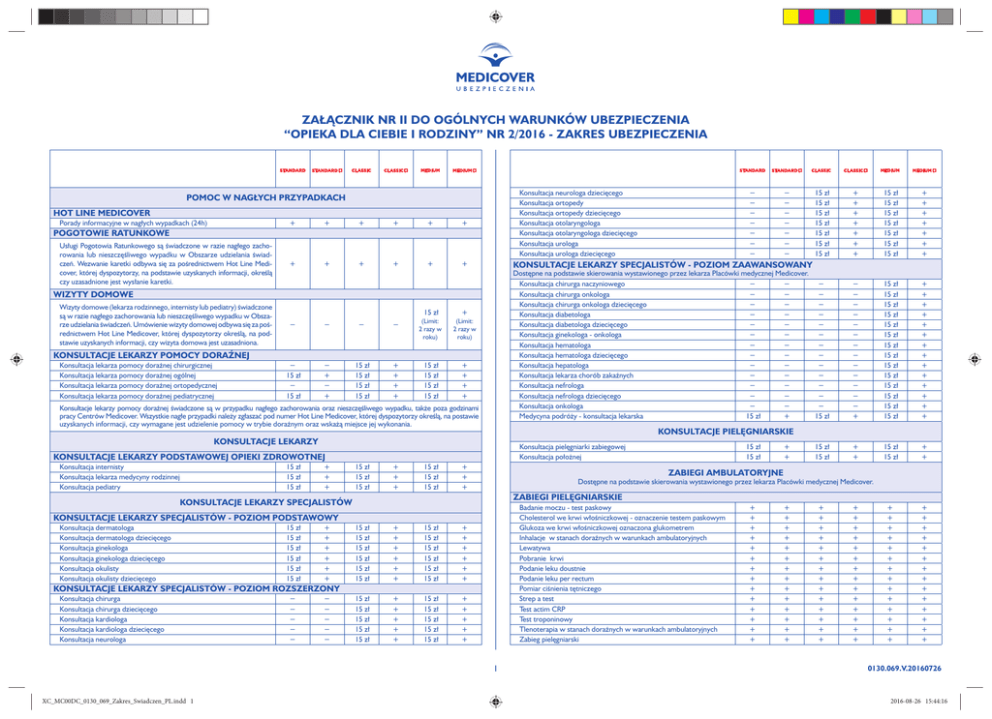 ZAŁĄCZNIK NR II DO OGÓLNYCH WARUNKÓW UBEZPIECZENIA “OPIEKA DLA CIEBIE I RODZINY” NR 2/2016 - ZAKRES UBEZPIECZENIA Konsultacja neurologa dziecięcego Konsultacja ortopedy Konsultacja ortopedy dziecięcego Konsultacja otolaryngologa Konsultacja otolaryngologa dziecięcego Konsultacja urologa Konsultacja urologa dziecięcego POMOC W NAGŁYCH PRZYPADKACH HOT LINE MEDICOVER Porady informacyjne w nagłych wypadkach (24h) + + + + + + + + + + + + POGOTOWIE RATUNKOWE Usługi Pogotowia Ratunkowego są świadczone w razie nagłego zachorowania lub nieszczęśliwego wypadku w Obszarze udzielania świadczeń. Wezwanie karetki odbywa się za pośrednictwem Hot Line Medicover, której dyspozytorzy, na podstawie uzyskanych informacji, określą czy uzasadnione jest wysłanie karetki. 15 zł + − − − − (Limit: 2 razy w roku) (Limit: 2 razy w roku) − 15 zł − 15 zł − + − + 15 zł 15 zł 15 zł 15 zł + + + + 15 zł 15 zł 15 zł 15 zł + + + + KONSULTACJE LEKARZY POMOCY DORAŹNEJ Konsultacja lekarza pomocy doraźnej chirurgicznej Konsultacja lekarza pomocy doraźnej ogólnej Konsultacja lekarza pomocy doraźnej ortopedycznej Konsultacja lekarza pomocy doraźnej pediatrycznej Konsultacje lekarzy pomocy doraźnej świadczone są w przypadku nagłego zachorowania oraz nieszczęśliwego wypadku, także poza godzinami pracy Centrów Medicover. Wszystkie nagłe przypadki należy zgłaszać pod numer Hot Line Medicover, której dyspozytorzy określą, na postawie uzyskanych informacji, czy wymagane jest udzielenie pomocy w trybie doraźnym oraz wskażą miejsce jej wykonania. + + + 15 zł 15 zł 15 zł + + + 15 zł 15 zł 15 zł + + + + + + + + + − − − − − − − − − − − − − − − − − − − − − − − + 15 zł 15 zł 15 zł 15 zł 15 zł 15 zł 15 zł 15 zł 15 zł 15 zł 15 zł 15 zł 15 zł 15 zł + + + + + + + + + + + + + + + + 15 zł 15 zł + + + + + + + + + + + + + + + + + + + + + + + + + + + + + + 15 zł 15 zł Badanie moczu - test paskowy Cholesterol we krwi włośniczkowej - oznaczenie testem paskowym Glukoza we krwi włośniczkowej oznaczona glukometrem Inhalacje w stanach doraźnych w warunkach ambulatoryjnych Lewatywa Pobranie krwi Podanie leku doustnie Podanie leku per rectum Pomiar ciśnienia tętniczego Strep a test Test actim CRP Test troponinowy Tlenoterapia w stanach doraźnych w warunkach ambulatoryjnych Zabieg pielęgniarski 15 zł 15 zł 15 zł 15 zł 15 zł 15 zł + + + + + + 15 zł 15 zł 15 zł 15 zł 15 zł 15 zł + + + + + + 15 zł 15 zł 15 zł 15 zł 15 zł + + + + + 15 zł 15 zł 15 zł 15 zł 15 zł + + + + + 1 XC_MC00DC_0130_069_Zakres_Swiadczen_PL.indd 1 Dostępne na podstawie skierowania wystawionego przez lekarza Placówki medycznej Medicover. Konsultacja chirurga naczyniowego − − − Konsultacja chirurga onkologa − − − Konsultacja chirurga onkologa dziecięcego − − − Konsultacja diabetologa − − − Konsultacja diabetologa dziecięcego − − − Konsultacja ginekologa - onkologa − − − Konsultacja hematologa − − − Konsultacja hematologa dziecięcego − − − Konsultacja hepatologa − − − Konsultacja lekarza chorób zakaźnych − − − Konsultacja nefrologa − − − Konsultacja nefrologa dziecięcego − − − Konsultacja onkologa − − − Medycyna podróży - konsultacja lekarska 15 zł + 15 zł + + 15 zł 15 zł ZABIEGI PIELĘGNIARSKIE KONSULTACJE LEKARZY SPECJALISTÓW - POZIOM ROZSZERZONY Konsultacja chirurga Konsultacja chirurga dziecięcego Konsultacja kardiologa Konsultacja kardiologa dziecięcego Konsultacja neurologa + + + + + + + ZABIEGI AMBULATORYJNE KONSULTACJE LEKARZY SPECJALISTÓW - POZIOM PODSTAWOWY 15 zł 15 zł 15 zł 15 zł 15 zł 15 zł 15 zł 15 zł 15 zł 15 zł 15 zł 15 zł 15 zł Dostępne na podstawie skierowania wystawionego przez lekarza Placówki medycznej Medicover. KONSULTACJE LEKARZY SPECJALISTÓW Konsultacja dermatologa Konsultacja dermatologa dziecięcego Konsultacja ginekologa Konsultacja ginekologa dziecięcego Konsultacja okulisty Konsultacja okulisty dziecięcego + + + + + + + Konsultacja pielęgniarki zabiegowej Konsultacja położnej KONSULTACJE LEKARZY PODSTAWOWEJ OPIEKI ZDROWOTNEJ 15 zł 15 zł 15 zł 15 zł 15 zł 15 zł 15 zł 15 zł 15 zł 15 zł KONSULTACJE PIELĘGNIARSKIE KONSULTACJE LEKARZY Konsultacja internisty Konsultacja lekarza medycyny rodzinnej Konsultacja pediatry − − − − − − − KONSULTACJE LEKARZY SPECJALISTÓW - POZIOM ZAAWANSOWANY WIZYTY DOMOWE Wizyty domowe (lekarza rodzinnego, internisty lub pediatry) świadczone są w razie nagłego zachorowania lub nieszczęśliwego wypadku w Obszarze udzielania świadczeń. Umówienie wizyty domowej odbywa się za pośrednictwem Hot Line Medicover, której dyspozytorzy określą, na podstawie uzyskanych informacji, czy wizyta domowa jest uzasadniona. − − − − − − − + + + + + + + + + + + + + + + + + + + + + + + + + + + + + + + + + + + + + + + + + + + + + + + + + + + + + + + + 0130.069.V.20160726 2016-08-26 15:44:16 INIEKCJE Iniekcja domięśniowa / podskórna Iniekcja dożylna Kroplówka Założenie wenflonu + + + + + + + + + + + + + + + + + + + + + + + + Drobne zabiegi/wymiana sączka/opatrunku Ewakuacja krwiaka z małżowiny usznej Nacięcie ropnia przewodu słuchowego Opatrunek uszny Płukanie uszu Tamponada nosa przednia Tamponada nosa przednia, obustronna Usunięcie ciała obcego z zakresu ORL Usunięcie tamponady nosa Usunięcie woskowiny − − − − + − − − − − − − − − + − − − − − + − + + + + + + + + + − + + + + + + + + + + + + + + + + + + + + + + + + + + + + Biopsja zmiany położonej podskórnie metodą przezskórną Elektrokoagulacja zmiany skórnej / błony śluzowej Kolejne płukanie rany/ropnia Kriochirurgiczne usunięcie zmiany skórnej Nacięcie i drenaż krwiaka skóry i tkanek podskórnych Nacięcie i drenaż krwiaka skóry i tkanek podskórnych, u dzieci Nacięcie i drenaż ropnia skóry i tkanek po