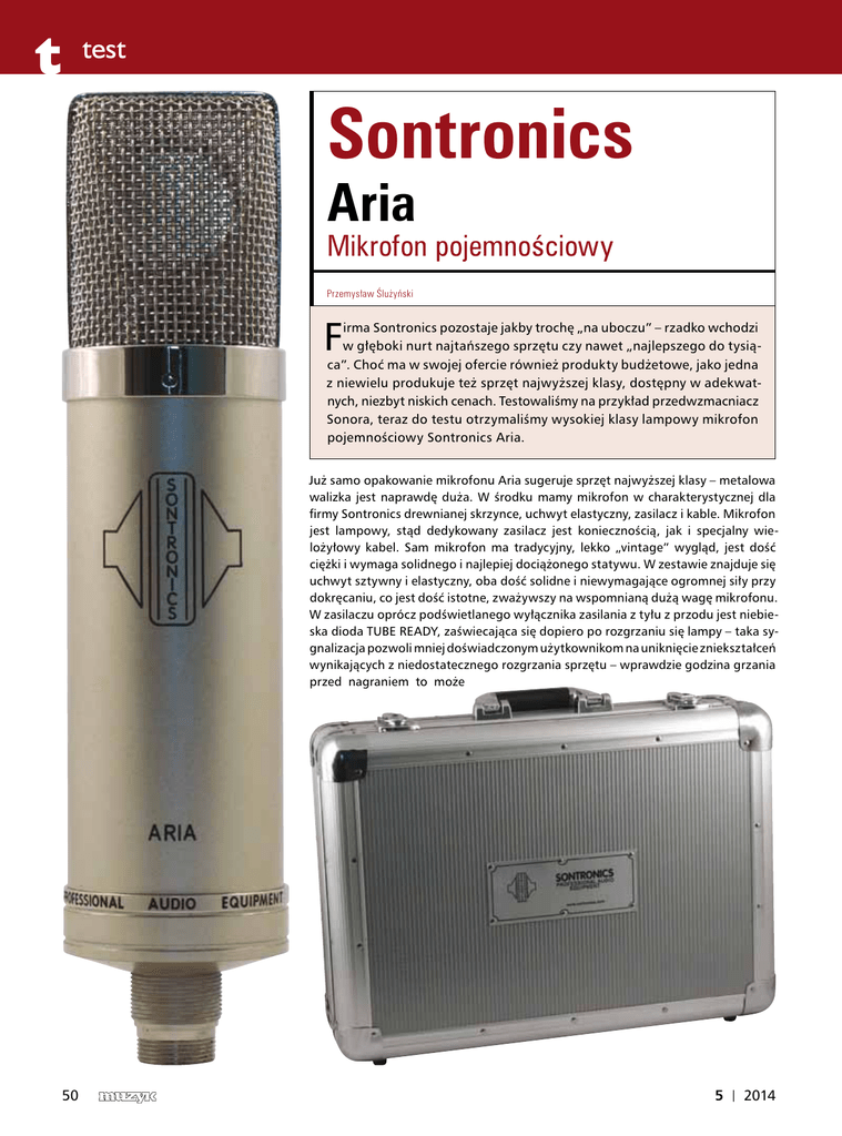 t test Sontronics Aria Mikrofon pojemnościowy Przemysław Ślużyński F irma Sontronics pozostaje jakby trochę „na uboczu” – rzadko wchodzi w głęboki nurt najtańszego sprzętu czy nawet „najlepszego do tysiąca”. Choć ma w swojej ofercie również produkty budżetowe, jako jedna z niewielu produkuje też sprzęt najwyższej klasy, dostępny w adekwatnych, niezbyt niskich cenach. Testowaliśmy na przykład przedwzmacniacz Sonora, teraz do testu otrzymaliśmy wysokiej klasy lampowy mikrofon pojemnościowy Sontronics Aria. Już samo opakowanie mikrofonu Aria sugeruje sprzęt najwyższej klasy – metalowa walizka jest naprawdę duża. W środku mamy mikrofon w charakterystycznej dla firmy Sontronics drewnianej skrzynce, uchwyt elastyczny, zasilacz i kable. Mikrofon jest lampowy, stąd dedykowany zasilacz jest koniecznością, jak i specjalny wielożyłowy kabel. Sam mikrofon ma tradycyjny, lekko „vintage” wygląd, jest dość ciężki i wymaga solidnego i najlepiej dociążonego statywu. W zestawie znajduje się uchwyt sztywny i elastyczny, oba dość solidne i niewymagające ogromnej siły przy dokręcaniu, co jest dość istotne, zważywszy na wspomnianą dużą wagę mikrofonu. W zasilaczu oprócz podświetlanego wyłącznika zasilania z tyłu z przodu jest niebieska dioda TUBE READY, zaświecająca się dopiero po rozgrzaniu się lampy – taka sygnalizacja pozwoli mniej doświadczonym użytkownikom na uniknięcie zniekształceń wynikających z niedostatecznego rozgrzania sprzętu – wprawdzie godzina grzania przed nagraniem to może 50 5 | 2014 test lekka przesada, ale parę minut nie zaszkodzi. Kabel jest dość gruby, ale miękki i elastyczny. W samym mikrofonie nie ma żadnych przełączników, przełączniki tłumika -10 dB oraz filtru dolnozaporowego o częstotliwości granicznej 75 Hz znajdują się w zasilaczu. Czułość mikrofonu nie jest bardzo wysoka i wynosi 18 mV/Pa. Stopień aktywny mikrofonu to lampa ECC83, czyli nie tradycyjnie pentoda, tylko łatwiejsza w zakupie popularna podwójna trioda, spotykana powszechnie we wzmacniaczach gitarowych. Tak nazwa mikrofonu – Aria – jak i jednoznaczne deklaracje producenta wskazują, że Sontronics Aria to mikrofon przeznaczony przede wszystkim do nagrań wokalnych, i bardzo dobrze, przecież w zasadzie tylko takie zastosowania nas interesują. Nie wyklucza to oczywiście innych zastosowań, ale z całą pewnością nagrania wokalne stoją na pierwszym miejscu. Testy porównawcze (jako drugi mikrofon użyty był „nieśmiertelny” Neumann TLM 103) pokazały, że faktycznie, Sontronics Aria ma około 6 dB niższy poziom wyjściowy niż Neumann, co zgadza się z tym, co czytamy w danych technicznych. Po zrównaniu poziomów (mniej więcej 6 dB różnicy) zrozumiały okazał się też trochę wyższy poziom szumów – wiadomo, lampa. Nawet według danych technicznych poziom szumów jest wyższy niż w TLM 103, a poziom wyjściowy niższy dwukrotnie – trudno, coś za coś. Można pokusić się o wybór mniej szumiącego egzemplarza lampy, lub nawet sprawdzić inny typ podwójnej triody – zmieni się poziom i może brzmienie, coś dla eksperymentatorów. Najważniejsze jednak jest brzmienie – i ono naprawdę zaskakuje. Firma Sontronics podkreśla w swoich materiałach delikatną czy nawet nieco wycofaną „górę” – i rzeczywiście, Sontronics Aria brzmi bardzo „jedwabiście”. Nie należy tego utożsamiać z brzmieniem ciemnym – wręcz przeciwnie, poziom najwyższych częstotliwości porównywalny jest z TLM 2014 | 5 t 103 – tylko z brzmieniem góry łagodnym, miękkim, wręcz „delikatnym”. Z pewnością nie jest to charakterystyka taniej chińskiej pojemnościówki z wycofanym środkiem i podbitą, przesterowaną górą – wręcz przeciwnie. Nawet po silnej kompresji Aria nie wykazuje tendencji do „syczenia”, wszystkie syczące głoski są rozróżnialne, a jednocześnie jasne. Czy to jest „lampowe ciepło”, za które odpowiedzialna jest lampowa elektronika, czy to po prostu porządnie i solidnie wykonana kapsuła i cały mikrofon – trudno orzec, w każdym razie góra jest ciepła, ale wcale nie schowana, po prostu dobra, taka, jak trzeba. Neumann TLM 103 ma sporo „dołu”, Aria ma go trochę mniej, ale są to różnice nieznaczne, słyszalne na głosach męskich, w dodatku nagrywanych bardzo blisko. Kobiece głosy nie różnią się w dole wiele, warto w dodatku przypomnieć, że zastosowanie filtra dolnozaporowego (w mikrofonie czy przedwzmacniaczu) różnice te doskonale niweluje. Przy większych poziomach ciśnienia akustycznego – na granicy normalnych zastosowań – lampa w mikrofonie Aria ujawnia się i pokazuje charakter – pojawia się lekka kompresja, a nawet zniekształcenia. 51 t test Sontronics Aria W przypadku silnych głosów i nagrywania z małej odległości takie zjawisko może wystąpić – i musimy podczas nagrania zdecydować, czy to akceptujemy, czy po prostu aktywujemy tłumik -10 dB i „odzyskujemy” czyste i niezniekształcone brzmienie nawet przy dużym poziomie ciśnienia akustycznego. Z tłumikiem wszystko jest w porządku i nie sposób w normalnym użytkowaniu Arii przesterować czy choćby doprowadzić do słyszalnej zmiany brzmienia, zresztą i tak prędzej „podda się” przedwzmacniacz mikrofonowy. Sontronics Aria to niezwykle ciekawy mikrofon, zgodnie z deklaracjami producenta najlepiej sprawdzający się w nagraniach wokalnych. oczywiście, również gitara akustyczna i „przeszkadzajki” brzmią na nim nieźle, nie brakuje transjentów, aczkolwiek są one jakby łagodzone, i jeżeli szukamy ostrego brzmienia tamburyna z atakiem, lepsze mogą być inne mikrofony, natomiast jeżeli chcemy go lekko schować, to warto sprawdzić ten mikrofon. Filtr dolnozaporowy ma dobrze dobraną częstotliwość graniczną – 75 Hz – i rolę swoją spełnia, aczkolwiek z pewnością lepiej posłużyć się regulowanym filtrem w przedwzmacnia