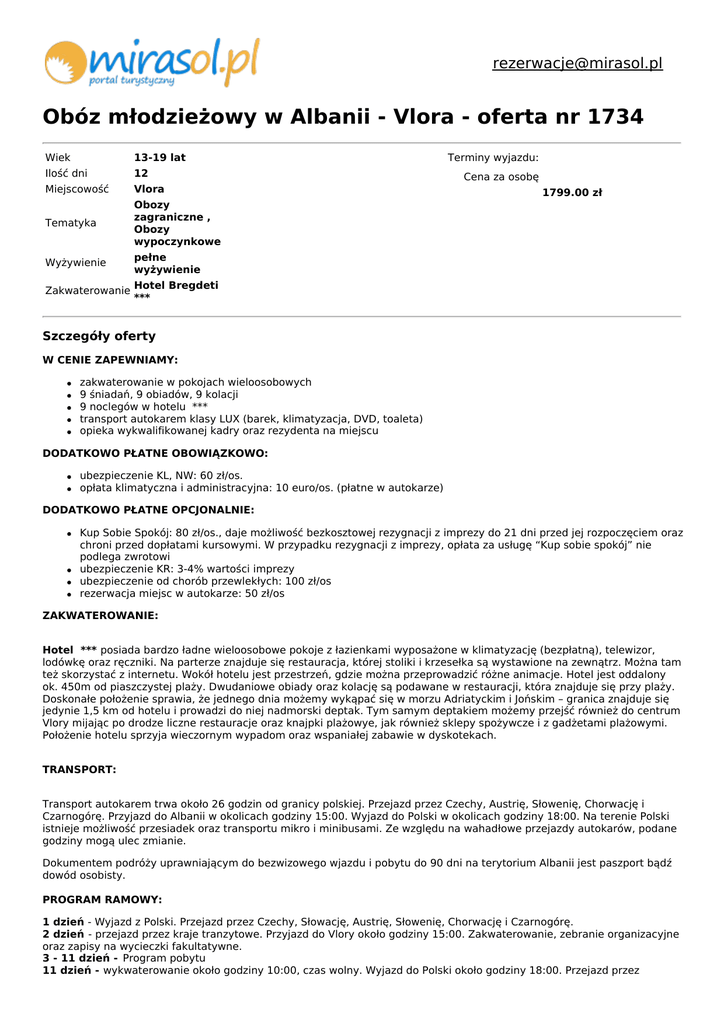 [email protected] Obóz młodzieżowy w Albanii - Vlora - oferta nr 1734 Wiek 13-19 lat Ilość dni 12 Miejscowość Vlora Tematyka Obozy zagraniczne , Obozy wypoczynkowe Wyżywienie pełne wyżywienie Zakwaterowanie Hotel Bregdeti *** Terminy wyjazdu: Cena za osobę 1799.00 zł Szczegóły oferty W CENIE ZAPEWNIAMY: zakwaterowanie w pokojach wieloosobowych 9 śniadań, 9 obiadów, 9 kolacji 9 noclegów w hotelu *** transport autokarem klasy LUX (barek, klimatyzacja, DVD, toaleta) opieka wykwalifikowanej kadry oraz rezydenta na miejscu DODATKOWO PŁATNE OBOWIĄZKOWO: ubezpieczenie KL, NW: 60 zł/os. opłata klimatyczna i administracyjna: 10 euro/os. (płatne w autokarze) DODATKOWO PŁATNE OPCJONALNIE: Kup Sobie Spokój: 80 zł/os., daje możliwość bezkosztowej rezygnacji z imprezy do 21 dni przed jej rozpoczęciem oraz chroni przed dopłatami kursowymi. W przypadku rezygnacji z imprezy, opłata za usługę “Kup sobie spokój” nie podlega zwrotowi ubezpieczenie KR: 3-4% wartości imprezy ubezpieczenie od chorób przewlekłych: 100 zł/os rezerwacja miejsc w autokarze: 50 zł/os ZAKWATEROWANIE: Hotel *** posiada bardzo ładne wieloosobowe pokoje z łazienkami wyposażone w klimatyzację (bezpłatną), telewizor, lodówkę oraz ręczniki. Na parterze znajduje się restauracja, której stoliki i krzesełka są wystawione na zewnątrz. Można tam też skorzystać z internetu. Wokół hotelu jest przestrzeń, gdzie można przeprowadzić różne animacje. Hotel jest oddalony ok. 450m od piaszczystej plaży. Dwudaniowe obiady oraz kolację są podawane w restauracji, która znajduje się przy plaży. Doskonałe położenie sprawia, że jednego dnia możemy wykąpać się w morzu Adriatyckim i Jońskim – granica znajduje się jedynie 1,5 km od hotelu i prowadzi do niej nadmorski deptak. Tym samym deptakiem możemy przejść również do centrum Vlory mijając po drodze liczne restauracje oraz knajpki plażowye, jak również sklepy spożywcze i z gadżetami plażowymi. Położenie hotelu sprzyja wieczornym wypadom oraz wspaniałej zabawie w dyskotekach. TRANSPORT: Transport autokarem trwa około 26 godzin od granicy polskiej. Przejazd przez Czechy, Austrię, Słowenię, Chorwację i Czarnogórę. Przyjazd do Albanii w okolicach godziny 15:00. Wyjazd do Polski w okolicach godziny 18:00. Na terenie Polski istnieje możliwość przesiadek oraz transportu mikro i minibusami. Ze względu na wahadłowe przejazdy autokarów, podane godziny mogą ulec zmianie. Dokumentem podróży uprawniającym do bezwizowego wjazdu i pobytu do 90 dni na terytorium Albanii jest paszport bądź dowód osobisty. PROGRAM RAMOWY: 1 dzień - Wyjazd z Polski. Przejazd przez Czechy, Słowację, Austrię, Słowenię, Chorwację i Czarnogórę. 2 dzień - przejazd przez kraje tranzytowe. Przyjazd do Vlory około godziny 15:00. Zakwaterowanie, zebranie organizacyjne oraz zapisy na wycieczki fakultatywne. 3 - 11 dzień - Program pobytu 11 dzień - wykwaterowanie około godziny 10:00, czas wolny. Wyjazd do Polski około godziny 18:00. Przejazd przez Albanię, Czarnogórę, Chorwację. 12 dzień - przejazd przez Słowenię, Austrię, Słowację, Czechy. przekroczenie granicy polskiej w godzinach wieczornych. PROGRAM POBYTU: Gry i zabawy na plaży - turniej siatkówki plażowej, turniej piłki nożnej o puchar obozu młodzieżowego, turniej w „dwa ognie”, turniej kometki, zawody pływackie ( pod nadzorem ratowników). Zabawy ruchowe - Zajęcia terenowe nad brzegiem morza, kalambury, podchody i biegi terenowe. Dyskoteki obozowe Pokaz mody, wybór miss i mistera obozu. Konkursy z nagrodami - na najładniejszą ozdobę z rzeczy znalezionych na plaży, na najładniejszą, najśmieszniejszą kartkę do rodziców, na najbardziej pomysłową pamiątkę za 2 Euro, na najlepsze, najładniejsze, najśmieszniejsze, oryginalne zdjęcie z obozu. Spacery - przywitanie morza, po “zachód słońca” (robimy piękne zdjęcia zachodu słońca), morze w nocy, pożegnanie morza. Olimpiada skok w dal, biegi przez płotki, z przeszkodami, na jednej nodze, zawody rzędów, rzut piłką, pchnięcie kamieniem, rzut beretem. Obozowe słodkie lenistwo czyli kąpiele słoneczne i morskie. I wiele innych ciekawych pomysłów na miłe spędzanie czasu na obozie młodzieżowym..... WYCIECZKI FAKULTATYWNE: Uwaga: podane ceny są orientacyjne i nie obejmują opłat za bilety wstępu wycieczka odbywa się przy określonej liczbie osób Riwiera Albańska - Wycieczka wiedzie najpiękniejszą nadmorską trasą Albanii. Zwiedzamy całą Riwierę Albańską rozpoczynając od przełęczy i Parku Narodowego Llogara, w którym zatrzymujemy się na tarasach widokowych, aby podziwiać wspaniałe widoki. Na poranną kawę zatrzymujemy się w miejscowości Himara, w której poczujemy greckoalbański klimat. Porto Palermo to urokliwe miejsce znane z bazy wojskowej, wyjątkowej urody oraz postaci Ali Pasy Tepeleńskiego, który otoczony jest legendą. Kolejnym przystankiem jest Borsh i przepiękne wodospady, które tworzą tło dla restauracji. Nastepnym punktem wycieczki jest Butrint i znajdujący się tam park archeologiczny, na którego obszarze możemy odkryć jak bogata jest historia tych terenów. Odbędziemy spacer od czasów pierwszych Słowian, poprzez okres hellenistyczny, rzymski, bizantyjski itd. Następnie czeka nas przerwa na urokliwych plażach Ksamilu, które królują we wszystkich rankingach. Na zakończenie relaksujący spacer deptakiem jednego z najbardziej znanych kurortów, czyli Sarandzie, w której, jak na miejscowość turystyczną przystało, można kupić pamiątki. Cena: 40 euro/ osoba Miasto Tysiąca Okien - Pierwszym przystankiem jest Ardenica, gdzie zwiedzamy monaster, w którym możemy podziwiać pięknie zachowane freski oraz ikonostas. Kolejny punkt to Berat, czyli znane „miasto tysiąca okien” znajdujące się na Liście Dziedzictwa Kulturowego UNESCO oraz nazwane miastem muzeum. Berat uznawany jest również za jedno z najstar