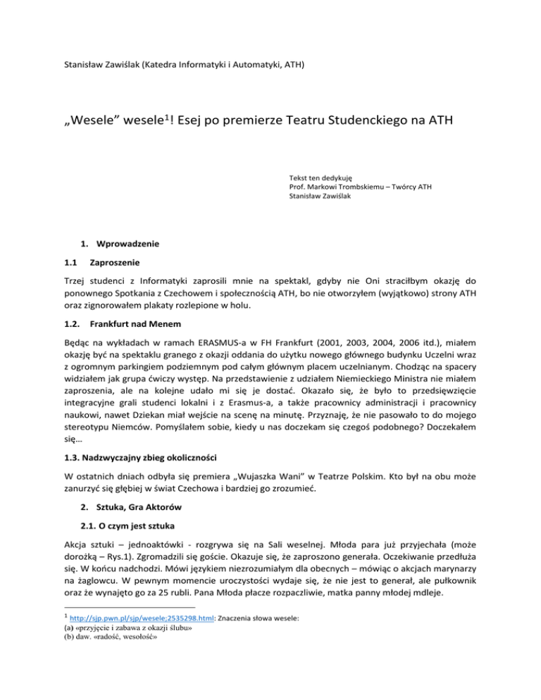 Stanisław Zawiślak (Katedra Informatyki i Automatyki, ATH) „Wesele” wesele1! Esej po premierze Teatru Studenckiego na ATH Tekst ten dedykuję Prof. Markowi Trombskiemu – Twórcy ATH Stanisław Zawiślak 1. Wprowadzenie 1.1 Zaproszenie Trzej studenci z Informatyki zaprosili mnie na spektakl, gdyby nie Oni straciłbym okazję do ponownego Spotkania z Czechowem i społecznością ATH, bo nie otworzyłem (wyjątkowo) strony ATH oraz zignorowałem plakaty rozlepione w holu. 1.2. Frankfurt nad Menem Będąc na wykładach w ramach ERASMUS-a w FH Frankfurt (2001, 2003, 2004, 2006 itd.), miałem okazję być na spektaklu granego z okazji oddania do użytku nowego głównego budynku Uczelni wraz z ogromnym parkingiem podziemnym pod całym głównym placem uczelnianym. Chodząc na spacery widziałem jak grupa ćwiczy występ. Na przedstawienie z udziałem Niemieckiego Ministra nie miałem zaproszenia, ale na kolejne udało mi się je dostać. Okazało się, że było to przedsięwzięcie integracyjne grali studenci lokalni i z Erasmus-a, a także pracownicy administracji i pracownicy naukowi, nawet Dziekan miał wejście na scenę na minutę. Przyznaję, że nie pasowało to do mojego stereotypu Niemców. Pomyślałem sobie, kiedy u nas doczekam się czegoś podobnego? Doczekałem się… 1.3. Nadzwyczajny zbieg okoliczności W ostatnich dniach odbyła się premiera „Wujaszka Wani” w Teatrze Polskim. Kto był na obu może zanurzyć się głębiej w świat Czechowa i bardziej go zrozumieć. 2. Sztuka, Gra Aktorów 2.1. O czym jest sztuka Akcja sztuki – jednoaktówki - rozgrywa się na Sali weselnej. Młoda para już przyjechała (może dorożką – Rys.1). Zgromadzili się goście. Okazuje się, że zaproszono generała. Oczekiwanie przedłuża się. W końcu nadchodzi. Mówi językiem niezrozumiałym dla obecnych – mówiąc o akcjach marynarzy na żaglowcu. W pewnym momencie uroczystości wydaje się, że nie jest to generał, ale pułkownik oraz że wynajęto go za 25 rubli. Pana Młoda płacze rozpaczliwie, matka panny młodej mdleje. 1 http://sjp.pwn.pl/sjp/wesele;2535298.html: Znaczenia słowa wesele: (a) «przyjęcie i zabawa z okazji ślubu» (b) daw. «radość, wesołość» Rys. 1. Dorożka w mieście Siergiejew Posad w okolicach Moskwy (tzw. Złoty Pierścień) [źródło: zdjęcie wykonane przez autora na wakacjach] Pułkownik odchodzi, ale trwa pogoń za posłańcem, który po prostu namówił pułkownika do przyjścia, z sam zabrał pieniądze. Czyli niby nic, ale… Ciekawe jak to się stało, że Hiszpańskojęzyczny Reżyser wybrał utwór Czechowa i jak uzyskano tekst sztuki??? 2.2.Gra Aktorów W bibliotece ATH i Książnicy Beskidzkiej w Bielsku-Białej - egzemplarz tekstu sztuki jest niedostępny, oprócz audiobook-a (!). Zatem będę pisał o aktorach według własnych nazw; stół po lewej: Para Jaśniepaństwo (Śpiewaczka i Mądrala), Para Grek i Marynarz, stół po prawej Absztyfikant i Matka Panny Młodej, Para Młoda, Generał i Posłaniec – chodzą po scenie, Generał siada na przygotowanym w środku krześle, prawie tronie. Aktorzy grali z zaangażowaniem i przekonująco. Potwierdzeniem tego były salwy śmiechu na widowni. Sztukę reżyserował Profesor z Hiszpanii czy Argentyny prowadzący zajęcia na kierunku Iberystyka. Niektóre role męskie grają Panie – bo pewnie nie było chętnych chłopaków. Każdy z Aktorów coś ciekawego i oryginalnego zaprezentował grając swoje postacie z wielkim zaangażowaniem: Marynarz spokój i rozmowy z generałem, czy raczej komandorem, bo był to oficer marynarki wojennej – floty carskiej, Grek – wygłasza mowy o wyższości Greków, by być grubym Aktorka ma poduszkę na brzuchu, JaśniePani śpiewa, Pan Mądrala prowadzi dialog z Absztyfikantem na temat elektryczności, Pan Młody ma pretensje za zaproszenie konkurenta (przecież to absurd), Pana Młoda gra przejętą swoją rolą - już żonę. Mama organizuje wszystko. Posłaniec to uroczy krętacz. Generał z przejęciem i pewnie bezbłędnie operuje żargonem żeglarskim. Absurd zamiany generała na pułkownika jest porażający – zemdlenie Matki było efektowne! 2.3. Geneza postaci Postacie mają związek z życiem Antoniego Czechowa. Urodził się w Taganrogu mieście nad Morzem Azowskim – częścią Morza Czarnego. W tym czasie podobno ważniejsze od Odessy. W mieście mieszkało wielu Greków oraz ludzi innych narodowości niż Rosjanie. Były porty handlowe i wojskowy. Grecy mieli składy portowe, sklepy i firmy transportowe, czy nawet własne statki. Byli zatem bogaczami. Dlatego Grek wywyższa się nad wszystkich uczestników. Jak zwykle w Czechowa – każda postać związana jest z pewnym ogólnym problem. Poczucie wyższości jest w jakiś sposób ośmieszane. Gruby człowiek ledwo może chodzić, a upity w końcowych scenach jest jak chochoł obracany wokół własnej osi przez pozostałych ścigających Posłańca. Marynarz to zdrowy rozsądek i człowiek oddany zawodowi – jedyny, który rozumie żargon. Razem z Komandorem reprezentują klasę wojskowych Armii Carskiej. Członkowie jej korpusu oficerskiego, byli klasą uprzywilejowaną w Cesarstwie, dlatego zaproszenie takiej osoby miało podnosić prestiż rodziny oraz całej uroczystości. Z drugiej strony jest to absurdalne, gdyż zamiast zaproszenia, które jak się okazało było możliwe, z góry planowano farsę w postaci przyjścia za opłatą. Ciekawy jest dialog Pana Mądralińskiego z Absztyfikantem – temat: znaczenie elektryczności. Jak powiedział Włodzimierz Lenin „Socjalizm - to władza radziecka plus elektryfikacja całego kraju.” Czechow genialnie wyczuł problem. Jak zwykle postacie są przerysowane, a przeciwność „elektryczność vs. tradycyjne środki oświetlenia” przedstawiona jest jako różniąca dwa światy. 3. Prof. Trombski -hiszpańskie nazwiska – Dziekan Pan Profesor Marek Trombski może być bezspornie uznany za Twórcę ATH. Ostatnio n