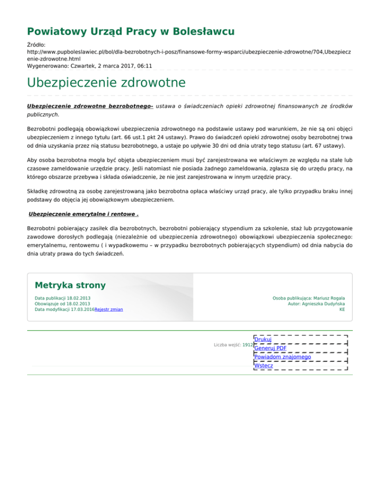 Powiatowy Urząd Pracy w Bolesławcu Źródło: http://www.pupboleslawiec.pl/bol/dla-bezrobotnych-i-posz/finansowe-formy-wsparci/ubezpieczenie-zdrowotne/704,Ubezpiecz enie-zdrowotne.html Wygenerowano: Czwartek, 2 marca 2017, 06:11 Ubezpieczenie zdrowotne Ubezpieczenie zdrowotne bezrobotnego- ustawa o świadczeniach opieki zdrowotnej finansowanych ze środków publicznych. Bezrobotni podlegają obowiązkowi ubezpieczenia zdrowotnego na podstawie ustawy pod warunkiem, że nie są oni objęci ubezpieczeniem z innego tytułu (art. 66 ust.1 pkt 24 ustawy). Prawo do świadczeń opieki zdrowotnej osoby bezrobotnej trwa od dnia uzyskania przez nią statusu bezrobotnego, a ustaje po upływie 30 dni od dnia utraty tego statusu (art. 67 ustawy). Aby osoba bezrobotna mogła być objęta ubezpieczeniem musi być zarejestrowana we właściwym ze względu na stałe lub czasowe zameldowanie urzędzie pracy. Jeśli natomiast nie posiada żadnego zameldowania, zgłasza się do urzędu pracy, na którego obszarze przebywa i składa oświadczenie, że nie jest zarejestrowana w innym urzędzie pracy. Składkę zdrowotną za osobę zarejestrowaną jako bezrobotna opłaca właściwy urząd pracy, ale tylko przypadku braku innej podstawy do objęcia jej obowiązkowym ubezpieczeniem. Ubezpieczenie emerytalne i rentowe . Bezrobotni pobierający zasiłek dla bezrobotnych, bezrobotni pobierający stypendium za szkolenie, staż lub przygotowanie zawodowe dorosłych podlegają (niezależnie od ubezpieczenia zdrowotnego) obowiązkowi ubezpieczenia społecznego: emerytalnemu, rentowemu ( i wypadkowemu – w przypadku bezrobotnych pobierających stypendium) od dnia nabycia do dnia utraty prawa do tych świadczeń. Metryka strony Data publikacji 18.02.2013 Obowiązuje od 18.02.2013 Data modyfikacji 17.03.2016Rejestr zmian Osoba publikująca: Mariusz Rogala Autor: Agnieszka Dudyńska KE Liczba wejść: 1912 Drukuj Generuj PDF Powiadom znajomego Wstecz