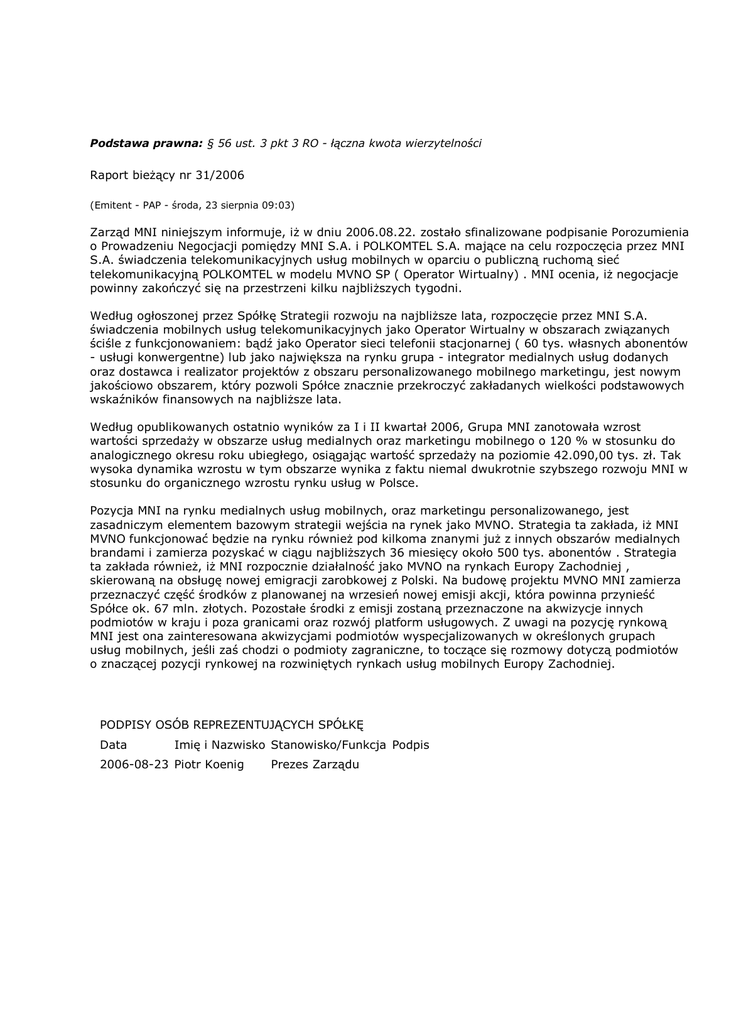 Podstawa prawna: § 56 ust. 3 pkt 3 RO - łączna kwota wierzytelności Raport bieżący nr 31/2006 (Emitent - PAP - środa, 23 sierpnia 09:03) Zarząd MNI niniejszym informuje, iż w dniu 2006.08.22. zostało sfinalizowane podpisanie Porozumienia o Prowadzeniu Negocjacji pomiędzy MNI S.A. i POLKOMTEL S.A. mające na celu rozpoczęcia przez MNI S.A. świadczenia telekomunikacyjnych usług mobilnych w oparciu o publiczną ruchomą sieć telekomunikacyjną POLKOMTEL w modelu MVNO SP ( Operator Wirtualny) . MNI ocenia, iż negocjacje powinny zakończyć się na przestrzeni kilku najbliższych tygodni. Według ogłoszonej przez Spółkę Strategii rozwoju na najbliższe lata, rozpoczęcie przez MNI S.A. świadczenia mobilnych usług telekomunikacyjnych jako Operator Wirtualny w obszarach związanych ściśle z funkcjonowaniem: bądź jako Operator sieci telefonii stacjonarnej ( 60 tys. własnych abonentów - usługi konwergentne) lub jako największa na rynku grupa - integrator medialnych usług dodanych oraz dostawca i realizator projektów z obszaru personalizowanego mobilnego marketingu, jest nowym jakościowo obszarem, który pozwoli Spółce znacznie przekroczyć zakładanych wielkości podstawowych wskaźników finansowych na najbliższe lata. Według opublikowanych ostatnio wyników za I i II kwartał 2006, Grupa MNI zanotowała wzrost wartości sprzedaży w obszarze usług medialnych oraz marketingu mobilnego o 120 % w stosunku do analogicznego okresu roku ubiegłego, osiągając wartość sprzedaży na poziomie 42.090,00 tys. zł. Tak wysoka dynamika wzrostu w tym obszarze wynika z faktu niemal dwukrotnie szybszego rozwoju MNI w stosunku do organicznego wzrostu rynku usług w Polsce. Pozycja MNI na rynku medialnych usług mobilnych, oraz marketingu personalizowanego, jest zasadniczym elementem bazowym strategii wejścia na rynek jako MVNO. Strategia ta zakłada, iż MNI MVNO funkcjonować będzie na rynku również pod kilkoma znanymi już z innych obszarów medialnych brandami i zamierza pozyskać w ciągu najbliższych 36 miesięcy około 500 tys. abonentów . Strategia ta zakłada również, iż MNI rozpocznie działalność jako MVNO na rynkach Europy Zachodniej , skierowaną na obsługę nowej emigracji zarobkowej z Polski. Na budowę projektu MVNO MNI zamierza przeznaczyć część środków z planowanej na wrzesień nowej emisji akcji, która powinna przynieść Spółce ok. 67 mln. złotych. Pozostałe środki z emisji zostaną przeznaczone na akwizycje innych podmiotów w kraju i poza granicami oraz rozwój platform usługowych. Z uwagi na pozycję rynkową MNI jest ona zainteresowana akwizycjami podmiotów wyspecjalizowanych w określonych grupach usług mobilnych, jeśli zaś chodzi o podmioty zagraniczne, to toczące się rozmowy dotyczą podmiotów o znaczącej pozycji rynkowej na rozwiniętych rynkach usług mobilnych Europy Zachodniej. PODPISY OSÓB REPREZENTUJĄCYCH SPÓŁKĘ Data Imię i Nazwisko Stanowisko/Funkcja Podpis 2006-08-23 Piotr Koenig Prezes Zarządu