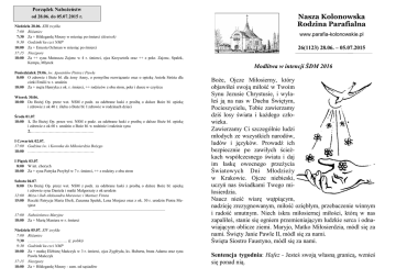 Porządek Nabożeństw od 28.06. do 05.07.2015 r. Niedziela 28.06. XIII zwykła 7:00 Różaniec 7:30 Za + Hildegardę Mocny w miesiąc po śmierci (deutsch) 9:30 Godzinki ku czci NMP 10:00 Za + Ernesta Ochman w miesiąc po śmierci 17:15 Nieszpory 18:00 Za ++ syna Mateusza Zajonc w 4 r. śmierci, ojca Krzysztofa oraz ++ z pokr. Zajonc, Spałek, Kempa, Mlynek Poniedziałek 29.06. św. Apostołów Piotra i Pawła 8:00 O zdrowie i Boże bł. dla żony Anny, o pomyślne rozwiązanie oraz o opiekę Anioła Stróża dla córki Emilii w r. urodzin 18:00 Za + męża Henryka z ok. r. śmierci, ++ rodziców z obu stron, pokr i dusze w czyśćcu Wtorek 30.06. 18:00 Do Bożej Op. przez wst. NSM z podz. za odebrane łaski z prośbą o dalsze Boże bł. opiekę i zdrowie z ok 40 r. ślubu o Boże bł. I zdrowie w rodzinach dzieci Środa 01.07. 18:00 1. Do Bożej Op. przez wst. NSM z podz. za odebrane łaski z prośbą o dalsze Boże bł. opiekę i zdrowie z ok 60 r. urodzin o Boże bł. w rodzinie i rodzinie syna 2.………………………………………… I Czwartek 02.07. 17:00 Godzina św. i Koronka do Miłosierdzia Bożego 18:00 …………………………………………... I Piątek 03.07. 8:00 W int. chorych 18:00 Za + syna Patryka Przybył w 7 r. śmierci, ++ z rodziny z obu stron Sobota 04.07. 8:00 Do Bożej Op. przez wst. NSM z podz. za odebrane łaski z prośbą o dalsze Boże bł. opiekę i zdrowie syna Daniela i matki Małgorzaty z ok urodzin 12:00 Msza i ślub Aleksandra Morawiec i Mariusz Firuta 15:00 Roczki Patrycja Maria Ebelt, Zuzanna Spałek, Lena Mesjasz oraz z ok. 30 r. urodzin Piotra Mesjasz ————————–—–——–————————————–——–—————— 17:00 Nabożeństwo Maryjne 18:00 Za + Marię Maniera w r. śmierci Niedziela 05.07. XIV zwykła 7:00 Różaniec 7:30 ………………………… (j. polski) 9:30 Godzinki ku czci NMP 10:00 Za + matkę Elżbietę Mańczyk w 3 r. śmierci, ojca Zygfryda, ks. Huberta, brata Adama oraz syna Pawła Mańczyk 17:15 Nieszpory 18:00 Za + Hildegardę Mocny - zam. od sąsiadów Nasza Kolonowska Rodzina Parafialna www.parafia-kolonowskie.pl 26(1123) 28.06. – 05.07.2015 Modlitwa w intencji ŚDM 2016 Boże, Ojcze Miłosierny, który objawiłeś swoją miłość w Twoim Synu Jezusie Chrystusie, i wylałeś ją na nas w Duchu Świętym, Pocieszycielu, Tobie zawierzamy dziś losy świata i każdego człowieka. Zawierzamy Ci szczególnie ludzi młodych ze wszystkich narodów, ludów i języków. Prowadź ich bezpiecznie po zawiłych ścieżkach współczesnego świata i daj im łaskę owocnego przeżycia Światowych Dni Młodzieży w Krakowie. Ojcze niebieski, uczyń nas świadkami Twego miłosierdzia. Naucz nieść wiarę wątpiącym, nadzieję zrezygnowanym, miłość oziębłym, przebaczenie winnym i radość smutnym. Niech iskra miłosiernej miłości, którą w nas zapaliłeś, stanie się ogniem przemieniającym ludzkie serca i odnawiającym oblicze ziemi. Maryjo, Matko Miłosierdzia, módl się za nami. Święty Janie Pawle II, módl się za nami. Święta Siostro Faustyno, módl się za nami. Sentencja tygodnia: Hafez - Jesteś swoją własną granicą, wznieś się ponad nią. 26/2015 Wakacje z Bogiem 2015 roku Parafialny Zespół Caritas informuje, że tegoroczne wakacyjne zajęcia dla dzieci i młodzieży będą się odbywać w środy i czwartki od 01 do 31 lipca. W środy w salce od 9:00 do 12:00. Odbędą się one w dniach: 01; 08; 15; 22; 29 lipca. W programie: modlitwa, rozmówki, praca plastyczna i techniczna, wspólne śniadanie, gry i zabawy, nauka piosenek. Dzieci biorące udział w zajęciach przynoszą swoje przybory ( kredki, flamastry, klej, nożyczki). Zajęcia w czwartek to wyjazdy na wycieczki. Dzieci, które chcą wziąć udział w wycieczce przynoszą na poniedziałek zgodę rodzica. Druki będą na bieżąco wykładane na stoliku, tam też składamy wypełnione. Dzieci przedszkolne jadą z swoim opiekunem. Wyjazdy: 02.07 - Opole; rejs statkiem, zwiedzanie Wieży Piastowskiej, Rynku, Amfiteatru, Katedry. Wyjazd o 8:00. Koszt 15 zł. 09.07. - do Muzeum Chleba w Radzionkowie. Wyjazd o 8:00. koszt 15 zł. 16.07. - do zabytkowej Kopalni Srebra w Tarnowskich Górach. Wyjazd o 8;00, koszt 15 zł. 23.07. - do Opola do kina Helios. Wyjazd o 8:00, koszt 15 zł. 30.07. - do Wrocławia - ZOO. Wyjazd o 7:30, koszt 20 zł. ZAPRASZAMY DZIECI DO UDZIAŁU. Zapraszamy też młodzież do pomocy paniom w zajęciach. Zespołowi Caritas, organizatorom, chętnym do pomocy składamy Bóg zapłać! ——–—————————–—–———–——–———–——————— Wakacje 20 - 25.07. Święto Młodzieży na Górze św. Anny (zgłoszenia u franciszkanów) 20 - 29.07. Camino - Sandomierz - Kraków (205 km), zgłoszenia u ks. Piotra, najlepiej do 1 lipca. 26.07. niedziela, godz. 17:00 błogosławieństwo kierowców i pojazdów 05.08. środa, wyjazd do Barda, Wambierzyc i Polanicy. Koszt 15 zł. Zapisy w kancelarii i zakrystii 17 – 22.08, piesza pielgrzymka na Jasną Górę. Zapisy w kancelarii i zakrystii 28 – 30.08, obchody Aniołów Stróżów na Górze św. Anny. Zapisy w kancelarii i zakrystii Wykorzystajmy dobrze i owocnie czas wakacji. Propozycji jest wiele zechciejmy z nich korzystać. Dzisiaj kolekta na cele parafii. Nieszpory o 17:15. Na Górze św. Anny pielgrzymka mężczyzn i młodzieńców. Wyjazd rowerzystów o 6:30. ——–—————————–—–———–——–———–——————— W poniedziałek Uroczystość św. Piotra i Pawła. Msze św. o 8:00 i 18:00. Kolekta na cele Stolicy Apostolskiej. ——–—————————–—–———–——–———–——————— I czwartek. Msza św. o 4:30 i wyjazd 85 osób na Bałkany. Zabieramy intencje wszystkich parafian. Polecamy się pamięci modlitewnej. Godzina Święta o 16:00. ——–—————————–—–—