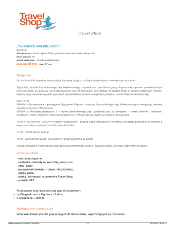 Travel Shop „TAJEMNICE WIELKIEJ NOCY” Szczecin Atrakcje: poznanie zająca Filipa, gra terenowa, warsztaty plastyczne ilość godzin: 4h grupa wiekowa: - szkoła podstawowa cena od: 45 PLN (przy 27 os.) Program Ok. 8:45- 9:00 Przyjazd na Szczecińską Starówkę ( dojazd na Stare Nowe Miasto – we własnym zakresie) Zając Filip, strażnik Szczecińskiego Jaja Wielkanocnego, przywita nas i podzieli na grupy. Poprosi nas o pomoc, ponieważ w tym roku ktoś zrobił mu psikusa i ukrył Szczecińskie Jajo Wielkanocne, bez którego nie będzie Świąt w naszym rodzinnym mieście. Musimy więc rozwikłać zagadki, poszukać odpowiedzi na pytania w najbliższej okolicy i pomóc Filipowi odnaleźć Jajo. 9:00-10:30 GRUPA I: Gra terenowa – pomagamy Zajączkowi Filipowi - szukamy Szczecińskiego Jaja Wielkanocnego rozwiązując ciekawe zagadki związane z Wielkanocą. GRUPA II: Warsztaty plastyczne 1 – wyrób pamiątkowego jaja (ozdobimy jajo ze styropianu – różne techniki - cekinami, wstążkami, wełną, piórkami). Warsztaty plastyczne 2 : Własnoręczny wyrób kurczaczka lub zajączka. 10:30-11:30 GRUPA I /GRUPA II razem Poczęstunek – pyszne ciasto drożdżowe z herbatką. Warsztaty plastyczne 3: świeczki z węzy pszczelej – super prezent dla mamy lub babci. 11:30 – 13:00 Zamiana grup 13:00 - zakończenie zajęć i wyruszenie w drogę powrotną do szkoły Uwaga! Wszystkie własnoręcznie przygotowane przedmioty (pisanki, zające/kurczaki, świeczki) zabieramy do domu. Cena zawiera - realizację programu, - niezbędne materiały na warsztaty plastyczne, - karty pracy, - poczęstunek (herbata + ciasto / drożdżówka), - opiekę pilota, - opiekę animatora i przewodnika Travel Shop, - podatek VAT Przykładowe ceny transportu dla grup 45 osobowych: ze Stargardu oraz z Gryfina + 15 zł/os. z Choszczna + 20zł/os. Dodatkowe informacje Cena kalkulowana jest dla grup liczących 45 Uczestników, wyjeżdżających ze Szczecina. Wygenerowane w systemie TravelShop 1/2 02-03-2017 06:12:14 Kalkulacja dla konkretnej grupy (inna liczba uczestników, miejsce wyjazdu) na życzenie Klienta. Powyższa treść nie stanowi oferty handlowej w rozumieniu art. 66 § 1 kodeksu cywilnego oraz innych właściwych przepisów prawnych. Wygenerowane w systemie TravelShop 2/2 02-03-2017 06:12:14