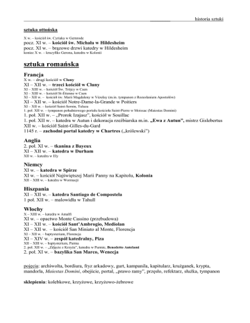 ________ historia sztuki sztuka ottońska X w. – kościół św. Cyriaka w Gernrode pocz. XI w. – kościół św. Michała w Hildesheim pocz. XI w. – brązowe drzwi katedry w Hildesheim koniec X w. – krucyfiks Gerona, katedra w Kolonii sztuka romańska Francja X w. – drugi kościół w Cluny XI – XII w. – trzeci kościół w Cluny XI – XIII w. – kościół Św. Trójcy w Caen XI – XIII w. – kościół St-Étienne w Caen XI – XII w. – kościół św. Marii Magdaleny w Vézelay (m.in. tympanon z Rozesłaniem Apostołów) XI – XII w. – kościół Notre-Dame-la-Grande w Poitiers XI – XII w. – kościół Saint-Sernin, Tuluza 1. poł. XII w. – tympanon południowego portalu kościoła Saint-Pierre w Moissac (Maiestas Domini) 1. poł. XII w. – „Prorok Izajasz”, kościół w Souillac 1. poł. XII w. – katedra w Autun i dekoracja rzeźbiarska m.in. „Ewa z Autun”, mistrz Gislebertus XII w. – kościół Saint-Gilles-du-Gard 1145 r. – zachodni portal katedry w Chartres („królewski”) Anglia 2. poł. XI w. – tkanina z Bayeux XI – XII w. – katedra w Durham XII w. – katedra w Ely Niemcy XI w. – katedra w Spirze XI w. – kościół Najświętszej Marii Panny na Kapitolu, Kolonia XII – XIII w. – katedra w Wormacji Hiszpania XI – XII w. – katedra Santiago de Compostela 1 poł. XII w. – malowidła w Tahull Włochy X – XIII w. – katedra w Amalfi XI w. – opactwo Monte Cassino (przebudowa) XI – XII w. – kościół Sant’Ambrogio, Mediolan XI – XII w. – kościół San Miniato al Monte, Florencja XI – XII w. – baptysterium, Florencja XI – XIV w. – zespół katedralny, Piza XII – XIII w. – baptysterium, Parma 2. poł. XII w. – „Zdjęcie z Krzyża”, katedra w Parmie, Benedetto Antelami 2. poł. XI w. – bazylika San Marco, Wenecja pojęcia: archiwolta, bordiura, fryz arkadowy, gurt, kampanila, kapitularz, krużganek, krypta, mandorla, Maiestas Domini, obejście, portal, „prawo ramy”, przęsło, refektarz, służka, tympanon sklepienia: kolebkowe, krzyżowe, krzyżowo-żebrowe