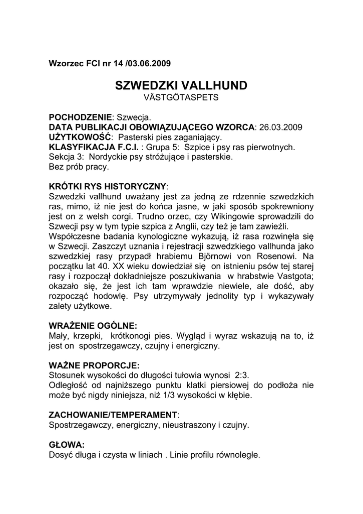 Wzorzec FCI nr 14 /03.06.2009 SZWEDZKI VALLHUND VÄSTGÖTASPETS POCHODZENIE: Szwecja. DATA PUBLIKACJI OBOWIĄZUJĄCEGO WZORCA: 26.03.2009 UŻYTKOWOŚĆ: Pasterski pies zaganiający. KLASYFIKACJA F.C.I. : Grupa 5: Szpice i psy ras pierwotnych. Sekcja 3: Nordyckie psy stróżujące i pasterskie. Bez prób pracy. KRÓTKI RYS HISTORYCZNY: Szwedzki vallhund uważany jest za jedną ze rdzennie szwedzkich ras, mimo, iż nie jest do końca jasne, w jaki sposób spokrewniony jest on z welsh corgi. Trudno orzec, czy Wikingowie sprowadzili do Szwecji psy w tym typie szpica z Anglii, czy też je tam zawieźli. Współczesne badania kynologiczne wykazują, iż rasa rozwinęła się w Szwecji. Zaszczyt uznania i rejestracji szwedzkiego vallhunda jako szwedzkiej rasy przypadł hrabiemu Björnowi von Rosenowi. Na początku lat 40. XX wieku dowiedział się on istnieniu psów tej starej rasy i rozpoczął dokładniejsze poszukiwania w hrabstwie Vastgota; okazało się, że jest ich tam wprawdzie niewiele, ale dość, aby rozpocząć hodowlę. Psy utrzymywały jednolity typ i wykazywały zalety użytkowe. WRAŻENIE OGÓLNE: Mały, krzepki, krótkonogi pies. Wygląd i wyraz wskazują na to, iż jest on spostrzegawczy, czujny i energiczny. WAŻNE PROPORCJE: Stosunek wysokości do długości tułowia wynosi 2:3. Odległość od najniższego punktu klatki piersiowej do podłoża nie może być nigdy niniejsza, niż 1/3 wysokości w kłębie. ZACHOWANIE/TEMPERAMENT: Spostrzegawczy, energiczny, nieustraszony i czujny. GŁOWA: Dosyć długa i czysta w liniach . Linie profilu równoległe. MÓZGOCZASZKA: Widziana z góry i z boku średniej szerokości, równomiernie zwęża się w kierunku kufy. Czaszka : Niemal płaska. Stop: Dobrze zaznaczony. TRZEWOCZASZKA : Nos: Czarny. Kufa: Widziana z boku jest raczej tępa, nieco krótsza od czaszki. Wargi: Ściśle przylegające. Uzębienie : Żuchwa raczej tępo zakończona i mocna, ale nie wydatna. Pełny, ścisły zgryz nożycowy, zęby duże i równe. Oczy: Średniej wielkości, owalnego kształtu, ciemnobrązowe. Uszy: Średniej wielkości, spiczaste, stojące; małżowina sztywna od nasady do czubka. Pokryte gładkim włosem, ruchliwe. Długość ucha powinna być nieco większa od jego szerokości u nasady. SZYJA: Długa i mocno umięśniona, ładnie wzniesiona. TUŁÓW: Górna linia: Grzbiet poziomy, dobrze umięśniony. Lędźwie: Krótkie, szerokie i mocne. Zad: Szeroki, nieco opadający. Klatka piersiowa: Długa, odpowiednio głęboka. Dość mocno wysklepione żebra. Widziana z przodu klatka piersiowa jest owalna; z boku – elipsoidalna. Sięga 2/5 długości przednich kończyn; widziany z boku najniższy punkt klatki piersiowej znajduje się tuż za łokciem. Przedpiersie widoczne, ale nie przesadnie zaznaczone. Linia dolna: Brzuch lekko podciągnięty. OGON: Występują dwa typy ogona: długi lub w najrozmaitszym stopniu skrócony. W obydwu przypadkach dopuszczalne są różne sposoby noszenia ogona, ponieważ nie ustalono żadnej „normy”. KOŃCZYNY: O mocnym kośćcu. KOŃCZYNY PRZEDNIE : Łopatka: Łopatka długa, ustawiona pod kątem 45o do poziomu. Ramię: Nieco krótsze niż łopatka; tworzy z nią wyraźny kąt. Ramię przylega do żeber, lecz pozostaje bardzo ruchome. Przedramię: Widziane z przodu – nieco zakrzywione, na tyle , by możliwy był swobodny ruch kończyn, mimo szerokości dolnej części klatki piersiowej. Śródręcze: Elastyczne. KOŃCZYNY TYLNE : Widziane z tyłu – równoległe. Udo: Szerokie, mocno umięśnione. Staw kolanowy: Dobrze kątowany. Podudzie: Nieco dłuższe, niż wynosi odległość od stawu skokowego do podłoża. Staw skokowy: Dobrze kątowany. Śródstopie: Średniej długości. ŁAPY: Średniej wielkości, krótkie, owalne, ustawione prosto do przodu, o mocnych opuszkach, zwarte i wysklepione. CHODY: Swobodne, z dobrym wykrokiem i napędem. SZATA: Sierść: Średniej długości, twardy, zwarty, ściśle przylegający włos okrywowy; podszerstek miękki i bardzo gęsty . Włos krótszy na głowie i przedzie kończyn; może być dłuższy na szyi, klatce piersiowej oraz z tyłu tylnych kończyn. Maść: Szara, szarawo brązowa, szarawo żółta i rudawobrązowa. Jaśniejsza w tym samym odcieniu sierść może występować na kufie, szyi, klatce piersiowej, brzuchu, pośladkach, łapach i śródstopiach. Ciemniejsze włosy okrywowe na szyi, grzbiecie i bokach tułowia. Bardzo pożądane jaśniejsze odcienie na łopatkach, tak zwana uprząż , i jaśniejsze policzki. Biel dopuszczalna jako niewielka strzałka, plamka na szyi lub niewielki naszyjnik, a także na klatce piersiowej i łapach, ale skarpetki nie powinny sięgać powyżej połowy długości kończyny. WIELKOŚĆ : Wysokość w kłębie: Psy: 33 cm (idealna). Suki: 31 cm (idealna) Dopuszczalna wysokość 2 cm powyżej i 1 cm poniżej ideału. WADY: Wszelkie odstępstwa od podanego wzorca powinny być uznane za wady i oceniane w zależności od stopnia nasilenia i wpływu na zdrowie i dobrostan psa. Zbyt krótkie nogi. Niewyraźny stop. Szpiczasta kufa. Brak dwóch P1 lub jednego P2. Oko jasne, o złym wyrazie. Uszy zbyt nisko osadzone. Klatka piersiowa zbyt głęboka lub zbyt płytka. Zbyt szeroki front. Stroma łopatka. Zbyt krótkie ramię. Przekątowany tył. Brak obroży lub znaczeń na policzkach. WADY DUŻE: Krótka lub okrągła czaszka. Krótka kufa. Żuchwa słaba, wąska lub cofnięta. Zgryz cęgowy. Braki trzonowców (M3 nie są brane pod uwagę). Wygarbiony grzbiet. Sierść miękka lub nastroszona. Sierść zbyt krótka lub zbyt długa. Brak podszerstka. Białe znaczenia, obejmujące więcej jak 30% powierzchni ciała. Wielkość znacznie różniąca się od idealnej. WADY DYSKWALIFIKUJĄCE: Agresja lub wyraźna lękliwość. Przodozgryz lub tyłozgryz. Jedno lub obydwoje oczu niebieskie. Uszy wiszące lub półstojące. Sierść długa, kędzierzawa. Maść czarna, biała, wątrobiana lub błękitna. Każdy pies, wykazujący wyraźne wady