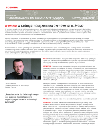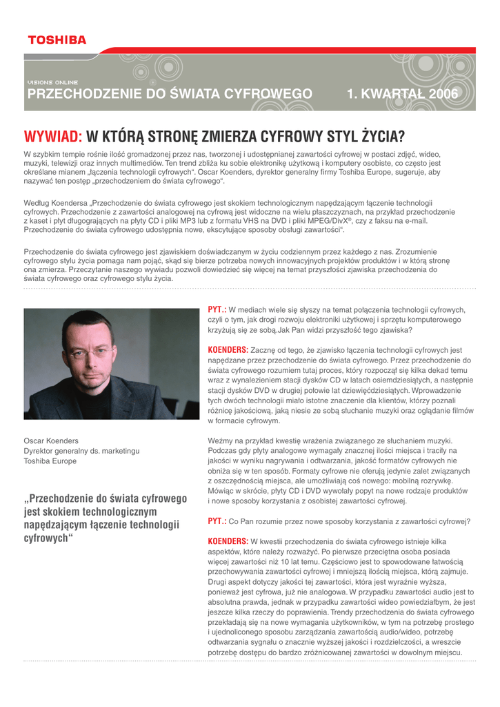 PRZECHODZENIE DO ŚWIATA CYFROWEGO 1. kwartał 2006 Wywiad: W którą stronę zmierza cyfrowy styl życia? W szybkim tempie rośnie ilość gromadzonej przez nas, tworzonej i udostępnianej zawartości cyfrowej w postaci zdjęć, wideo, muzyki, telewizji oraz innych multimediów. Ten trend zbliża ku sobie elektronikę użytkową i komputery osobiste, co często jest określane mianem „łączenia technologii cyfrowych“. Oscar Koenders, dyrektor generalny firmy Toshiba Europe, sugeruje, aby nazywać ten postęp „przechodzeniem do świata cyfrowego“. Według Koendersa „Przechodzenie do świata cyfrowego jest skokiem technologicznym napędzającym łączenie technologii cyfrowych. Przechodzenie z zawartości analogowej na cyfrową jest widoczne na wielu płaszczyznach, na przykład przechodzenie z kaset i płyt długogrających na płyty CD i pliki MP3 lub z formatu VHS na DVD i pliki MPEG/DivX®, czy z faksu na e-mail. Przechodzenie do świata cyfrowego udostępnia nowe, ekscytujące sposoby obsługi zawartości“. Przechodzenie do świata cyfrowego jest zjawiskiem doświadczanym w życiu codziennym przez każdego z nas. Zrozumienie cyfrowego stylu życia pomaga nam pojąć, skąd się bierze potrzeba nowych innowacyjnych projektów produktów i w którą stronę ona zmierza. Przeczytanie naszego wywiadu pozwoli dowiedzieć się więcej na temat przyszłości zjawiska przechodzenia do świata cyfrowego oraz cyfrowego stylu życia. Pyt.: W mediach wiele się słyszy na temat połączenia technologii cyfrowych, czyli o tym, jak drogi rozwoju elektroniki użytkowej i sprzętu komputerowego krzyżują się ze sobą.Jak Pan widzi przyszłość tego zjawiska? Koenders: Zacznę od tego, że zjawisko łączenia technologii cyfrowych jest napędzane przez przechodzenie do świata cyfrowego. Przez przechodzenie do świata cyfrowego rozumiem tutaj proces, który rozpoczął się kilka dekad temu wraz z wynalezieniem stacji dysków CD w latach osiemdziesiątych, a następnie stacji dysków DVD w drugiej połowie lat dziewięćdziesiątych. Wprowadzenie tych dwóch technologii miało istotne znaczenie dla klientów, którzy poznali różnicę jakościową, jaką niesie ze sobą słuchanie muzyki oraz oglądanie filmów w formacie cyfrowym. Oscar Koenders Dyrektor generalny ds. marketingu Toshiba Europe „Przechodzenie do świata cyfrowego jest skokiem technologicznym napędzającym łączenie technologii cyfrowych“ Weźmy na przykład kwestię wrażenia związanego ze słuchaniem muzyki. Podczas gdy płyty analogowe wymagały znacznej ilości miejsca i traciły na jakości w wyniku nagrywania i odtwarzania, jakość formatów cyfrowych nie obniża się w ten sposób. Formaty cyfrowe nie oferują jedynie zalet związanych z oszczędnością miejsca, ale umożliwiają coś nowego: mobilną rozrywkę. Mówiąc w skrócie, płyty CD i DVD wywołały popyt na nowe rodzaje produktów i nowe sposoby korzystania z osobistej zawartości cyfrowej. Pyt.: Co Pan rozumie przez nowe sposoby korzystania z zawartości cyfrowej? KOENDERS: W kwestii przechodzenia do świata cyfrowego istnieje kilka aspektów, które należy rozważyć. Po pierwsze przeciętna osoba posiada więcej zawartości niż 10 lat temu. Częściowo jest to spowodowane łatwością przechowywania zawartości cyfrowej i mniejszą ilością miejsca, którą zajmuje. Drugi aspekt dotyczy jakości tej zawartości, która jest wyraźnie wyższa, ponieważ jest cyfrowa, już nie analogowa. W przypadku zawartości audio jest to absolutna prawda, jednak w przypadku zawartości wideo powiedziałbym, że jest jeszcze kilka rzeczy do poprawienia. Trendy przechodzenia do świata cyfrowego przekładają się na nowe wymagania użytkowników, w tym na potrzebę prostego i ujednoliconego sposobu zarządzania zawartością audio/wideo, potrzebę odtwarzania sygnału o znacznie wyższej jakości i rozdzielczości, a wreszcie potrzebę dostępu do bardzo zróżnicowanej zawartości w dowolnym miejscu. Pyt.: W jaki sposób wytłumaczy Pan w takim razie stworzenie Qosmio, audiowizualnego komputera przenośnego, który często jest oceniany jako najnowocześniejsze osiągnięcie w dziedzinie łączenia technologii cyfrowych? Koenders: Prostota, jakość i niezawodność — to są wartości dostarczane przez firmę Toshiba. Ogromny sukces komputera Qosmio można tłumaczyć faktem, iż spełnia on istniejące od dawna potrzeby wywołane przez procesy przechodzenia do świata cyfrowego. Ten fakt nie jest zbiegiem okoliczności. Kilka lat temu firma Toshiba przeprowadziła badania wśród użytkowników dotyczące ich cyfrowych wymagań, a następnie zbudowała prototyp produktu i poprosiła o opinię. Jakie były pierwsze odpowiedzi? Klienci byli zachwyceni komputerem Qosmio. Byli zaskoczeni i podekscytowani odkryciem, że ich wymagania zostały spełnione i to w mobilnym formacie. „W cyfrowym stylu życia mają miejsce dwie istotne zmiany: zmiana czasu i zmiana miejsca“. Pyt.: Jak opisałby Pan ewolucję cyfrowego stylu życia? Koenders: Poza salonem w naszym domu oraz poza naszymi domami, gdy wyjeżdżamy służbowo lub dla przyjemności, odczuwamy ogromną zmianę. W cyfrowym stylu życia mają miejsce dwie istotne zmiany: zmiana czasu i zmiana miejsca. Rozumiem przez to, że tak jak 20 lat temu narodził się model mobilnego pracownika, tak dzisiaj rzeczywistością staje się mobilny styl życia. Nauczyliśmy się już, że istotne jest jak, a nie gdzie pracujemy. Jest to też prawdą w przypadku rozrywki cyfrowej. W coraz większym stopniu ludzie decydują o miejscu i czasie korzystania z ich osobistej zawartości cyfrowej — cyfrowy styl życia wykracza poza salon i dom. Pyt.: Czy jest Pan w stanie przewidzieć, które technologie będą miały szczególne znaczenie dla cyfrowego stylu życia w przyszłości? Koenders: Prawdziwą siłą napędową transformacji w cyfrowym stylu życia są standardy HD DVD i VoIP. W 2006 roku format HD DVD zaof