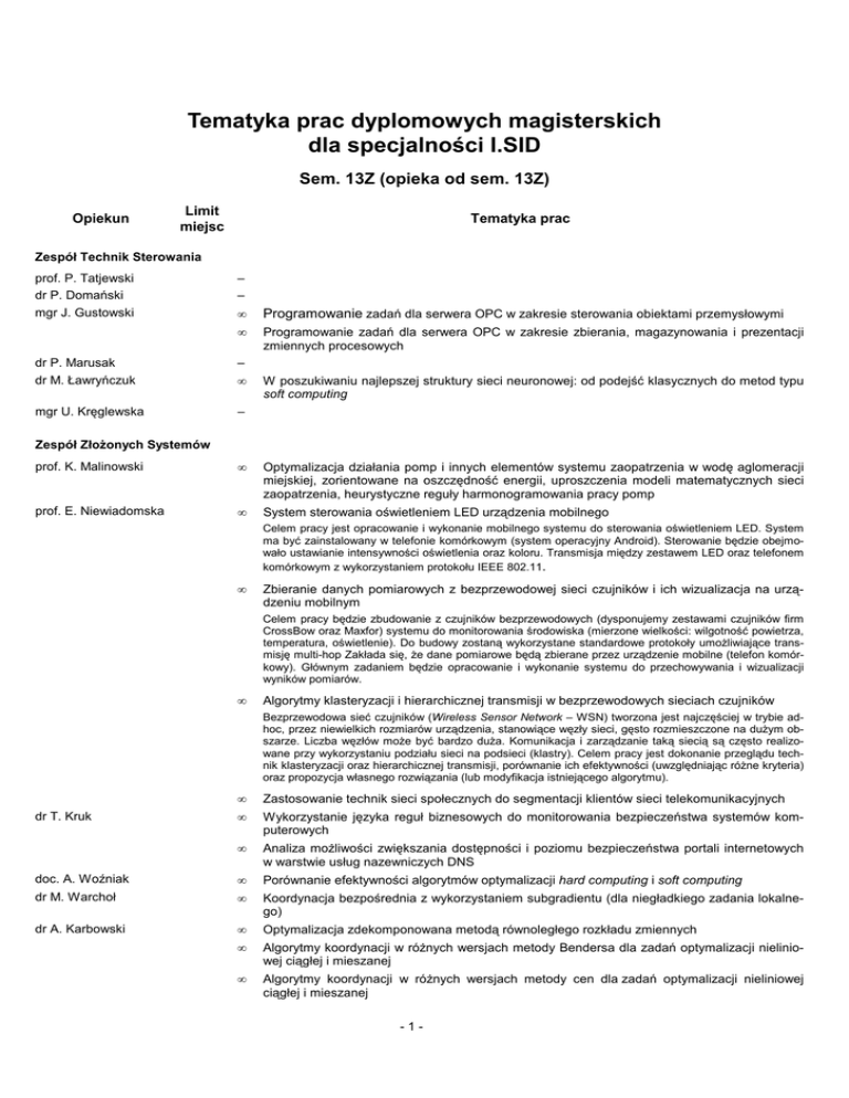 Tematyka prac dyplomowych magisterskich dla specjalności I.SID Sem. 13Z (opieka od sem. 13Z) Opiekun Limit miejsc Tematyka prac Zespół Technik Sterowania prof. P. Tatjewski dr P. Domański mgr J. Gustowski – – • Programowanie zadań dla serwera OPC w zakresie sterowania obiektami przemysłowymi • Programowanie zadań dla serwera OPC w zakresie zbierania, magazynowania i prezentacji zmiennych procesowych dr P. Marusak dr M. Ławryńczuk – mgr U. Kręglewska – • W poszukiwaniu najlepszej struktury sieci neuronowej: od podejść klasycznych do metod typu soft computing Zespół Złożonych Systemów prof. K. Malinowski • prof. E. Niewiadomska • Optymalizacja działania pomp i innych elementów systemu zaopatrzenia w wodę aglomeracji miejskiej, zorientowane na oszczędność energii, uproszczenia modeli matematycznych sieci zaopatrzenia, heurystyczne reguły harmonogramowania pracy pomp System sterowania oświetleniem LED urządzenia mobilnego Celem pracy jest opracowanie i wykonanie mobilnego systemu do sterowania oświetleniem LED. System ma być zainstalowany w telefonie komórkowym (system operacyjny Android). Sterowanie będzie obejmowało ustawianie intensywności oświetlenia oraz koloru. Transmisja między zestawem LED oraz telefonem komórkowym z wykorzystaniem protokołu IEEE 802.11. • Zbieranie danych pomiarowych z bezprzewodowej sieci czujników i ich wizualizacja na urządzeniu mobilnym Celem pracy będzie zbudowanie z czujników bezprzewodowych (dysponujemy zestawami czujników firm CrossBow oraz Maxfor) systemu do monitorowania środowiska (mierzone wielkości: wilgotność powietrza, temperatura, oświetlenie). Do budowy zostaną wykorzystane standardowe protokoły umożliwiające transmisję multi-hop Zakłada się, że dane pomiarowe będą zbierane przez urządzenie mobilne (telefon komórkowy). Głównym zadaniem będzie opracowanie i wykonanie systemu do przechowywania i wizualizacji wyników pomiarów. • Algorytmy klasteryzacji i hierarchicznej transmisji w bezprzewodowych sieciach czujników Bezprzewodowa sieć czujników (Wireless Sensor Network – WSN) tworzona jest najczęściej w trybie adhoc, przez niewielkich rozmiarów urządzenia, stanowiące węzły sieci, gęsto rozmieszczone na dużym obszarze. Liczba węzłów może być bardzo duża. Komunikacja i zarządzanie taką siecią są często realizowane przy wykorzystaniu podziału sieci na podsieci (klastry). Celem pracy jest dokonanie przeglądu technik klasteryzacji oraz hierarchicznej transmisji, porównanie ich efektywności (uwzględniając różne kryteria) oraz propozycja własnego rozwiązania (lub modyfikacja istniejącego algorytmu). dr T. Kruk • Zastosowanie technik sieci społecznych do segmentacji klientów sieci telekomunikacyjnych • Wykorzystanie języka reguł biznesowych do monitorowania bezpieczeństwa systemów komputerowych • Analiza możliwości zwiększania dostępności i poziomu bezpieczeństwa portali internetowych w warstwie usług nazewniczych DNS doc. A. Woźniak • Porównanie efektywności algorytmów optymalizacji hard computing i soft computing dr M. Warchoł • Koordynacja bezpośrednia z wykorzystaniem subgradientu (dla niegładkiego zadania lokalnego) dr A. Karbowski • Optymalizacja zdekomponowana metodą równoległego rozkładu zmiennych • Algorytmy koordynacji w różnych wersjach metody Bendersa dla zadań optymalizacji nieliniowej ciągłej i mieszanej • Algorytmy koordynacji w różnych wersjach metody cen dla zadań optymalizacji nieliniowej ciągłej i mieszanej -1- • dr P. Arabas • Optymalizacja zdekomponowana z wykorzystaniem kart graficznych Energooszczędny system dopuszczania połączeń Celem pracy jest implementacja systemu dopuszczania połączeń, wykorzystującego pomiary (MBAC – measurement based admission, control), który będzie uwzględniać koszty związane ze zużyciem energii przez urządzenia sieciowe. Na system składają się: model energetyczny urządzeń, podsystem pomiaru ruchu, algorytmy wykorzystujące prognozy ruchu oraz licytacje. Przewiduje się porównanie algorytmów poprzez eksperymenty obliczeniowe i emulacje w sieci laboratoryjnej. • Energooszczędny system inżynierii ruchu dla chmury obliczeniowej Celem pracy jest implementacja systemu pozwalającego na zestawianie połączeń między węzłami sieci tworzącej chmurę obliczeniową. Przyjmuje się strukturę, w której występują węzły dwóch rodzajów, tzn. maszyny obliczeniowe i przełączniki MPLS. Połączenia (ścieżki MPLS) zestawiane są w celu dostarczenia danych do maszyn obliczeniowych - dopuszcza się wykonywanie obliczeń na maszynach, które pierwotnie nie posiadają danych. Trasy przesyłu danych jak i alokacja maszyn do zadań mają spełniać wymagania związane z czasem obliczeń i zużyciem energii. dr M. Kamola • Analiza triad w serwisach społecznościowych Celem pracy jest określenie czynników decydujących o tworzeniu się kompletu powiązań pomiędzy trójkami osób („przyjaciel mojego przyjaciela jest moim przyjacielem”) w serwisie społecznościowym. Należy wykonać narzędzie do pobierania danych z serwisu, a następnie obserwować dynamikę powiązań (list znajomych) przez pewien okres, konfrontując ją z zachowaniem tych osób na blogach w tym serwisie. • Techniki estymacji przepływów IP a ruch drogowy Celem pracy jest weryfikacja możliwości zastosowania technik estymacji macierzy ruchu Ip do identyfikacji głównych relacji w ruchu drogowym. Należy dostosować istniejące algorytmy do specyfikacji zadania (mała i zmienna szybkość obiektów), dokonać testów poprawności w środowisku symulacyjnym. Następnie należy sprawdzić wydajność algorytmu dla ogólnodostępnych danych rzeczywistych. • Analiza motywów doboru cytowań w publikacjach naukowych Wybór piśmiennictwa do artykułu naukowego może wynikać z różnych, praktycznych i pozanaukowych celów. Zadaniem badawczym
