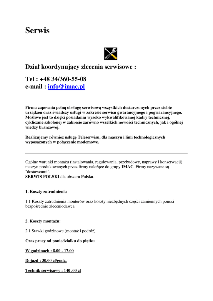 Serwis Dział koordynujący zlecenia serwisowe : Tel : +48 34/360-55-08 e-mail : [email protected] Firma zapewnia pełną obsługę serwisową wszystkich dostarczonych przez siebie urządzeń oraz świadczy usługi w zakresie serwisu gwarancyjnego i pogwarancyjnego. Możliwe jest to dzięki posiadaniu wysoko wykwalifikowanej kadry technicznej, cyklicznie szkolonej w zakresie zarówno wszelkich nowości technicznych, jak i ogólnej wiedzy branżowej. Realizujemy również usługę Teleserwisu, dla maszyn i linii technologicznych wyposażonych w połączenie modemowe. Ogólne warunki montażu (instalowania, regulowania, przebudowy, naprawy i konserwacji) maszyn produkowanych przez firmy należące do grupy IMAC. Firmy nazywane są "dostawcami". SERWIS POLSKI dla obszaru Polska. 1. Koszty zatrudnienia 1.1 Koszty zatrudnienia monterów oraz koszty niezbędnych części zamiennych ponosi bezpośrednio zleceniodawca. 2. Koszty montażu: 2.1 Stawki godzinowe (montaż i podróż) Czas pracy od poniedziałku do piątku W godzinach : 8.00 - 17.00 Dojazd : 30,00 zł/godz. Technik serwisowy : 140 ,00 zł 2.2 Dodatki za pracę w nadgodzinach, w godzinach nocnych, w niedzielę i dni świąteczne (montaż i podróż) Czas pracy od poniedziałku do piątku W godzinach 17.00 - 8.00 : 50% W godzinach nocnych : 10% W sobotę : 50% W niedzielę : 100% W dni świąteczne : 150% 2.3 Koszty podróży przejazdy samochodem serwisowym Stawka za 1 km : 0,85 PLN Przejazdy publicznymi środkami transportu Klasa turystyczna : wg taryfy W nocy pierwszą klasą lub wagonem sypialnym : wg taryfy 2.4 Wyżywienie i nocleg Koszty noclegu zgodnie z rachunkiem ( refaktura) Diety - 30zł pierwsza i następne doby 2.5 Diety bez noclegu (za granicą) Wg ryczałtu przewidzianego dla grup krajów +15% Koszty noclegu zgodnie z rachunkiem lub ryczałtowo 2.6 Powyższe stawki rozliczeniowe nie zawierają podatku VAT 2.7 Warunki płatności Koszty za usługi montażowe należy bezzwłocznie pokrywać zaraz po otrzymaniu faktury. 3. Przerwanie montażu. 3.1 Jeżeli zlecenie wymaga, żeby monter lub jego pomocnicy wielokrotnie odbywali podróż do miejsca pracy i z powrotem, wówczas zamawiający musi pokryć związane z tym koszty. 3.2 W szczególnie pilnych przypadkach, np. w razie usterek w eksploatacji u innych klientów, dostawca ma prawo polecić monterowi przerwanie montażu. Koszty podróży ponosi w takim wypadku dostawca. 4. Współpraca ze strony zamawiającego. 4.1 Zamawiający ma obowiązek udzielania pomocy. 4.2 Pomoc ze strony zamawiającego powinna zagwarantować, że montaż zostanie rozpoczęty zaraz po przybyciu personelu montażowego i będzie mógł być kontynuowany bez ograniczeń, aż do chwili dokonania odbioru przez zamawiającego. 4.3 Współpraca ze strony zamawiającego polega na ochronie osób i mienia na placu montażowym, zapewnieniu prawidłowych warunków pracy, udostępnieniu niezbędnych materiałów pracowniczych. 4.4 Udostępnienie personelu pomocniczego, jeżeli monter uważa to za niezbędne. Dotyczy to również wymagań montera wynikających z przepisów BHP. 4.5 Zatrudnienie tłumacza, jeżeli monter uzna to za niezbędne 4.6 Koszty tych zadań z zakresu współpracy ponosi zamawiający. 4.7 Jeśli zamawiający nie wypełnia swoich obowiązków wówczas dostawca ma prawo, lecz nie obowiązek, na koszt zamawiającego samodzielnie wykonać czynności będące obowiązkiem zamawiającego. 4.8 Zamawiający poinformuje dostawcę o ewentualnych wykroczeniach, jakich dopuścił się personel wykonujący montaż. 5. Zadania montera. 5.1 Monter wykonuje tylko prace ustalone przez dostawcę i przekazuje zamawiającemu informacje na temat sposobu obsługi i konserwacji maszyny. 5.2 W pilnych przypadkach monter - zwłaszcza w celu uniknięcia zakłóceń w eksploatacji na życzenie zamawiającego podejmie pracę w godzinach nadliczbowych lub w dniach świątecznych w zakresie dopuszczalnym ustawowo, lecz za odpowiednio wyższym wynagrodzeniem i po porozumieniu się ze swoim kierownictwem. 5.3 Monter nie ma prawa składać prawnie wiążących oświadczeń. W takich przypadkach należy zwracać się bezpośrednio do kierownictwa serwisu technicznego. 6. Odpowiedzialność cywilna. 6.1 Zakres odpowiedzialności cywilnej dostawcy obejmuje bezpłatną naprawę usterek montażowych. 6.2 Roszczenie o naprawę nie przysługuje, jeśli zamawiający niezwłocznie nie zamelduje usterki montażowej. 6.3 Dostawca nie ponosi również odpowiedzialności cywilnej za usterki montażowe, które wynikają za szczególnych warunków lokalnych, cech, podłoże itd. 6.4 Jeżeli zamawiający dokona zmian lub przeprowadzi naprawy bez porozumienia z dostawcą, wówczas dostawcza nie ponosi odpowiedzialności cywilnej, a pozostałe w związku z tym koszty nie będę pokryte przez dostawcę. 7. Gwarancja. 7.1 Oprócz roszczenia o naprawę zamawiający nie może dochodzić wobec dostawcy żadnych innych roszczeń, ani praw z tytułu ewentualnych niedogodności zwišzanych z montażem, niezależnie od podstaw prawnych, na jakie powołuje się zamawiający. 7.2 Sądem właściwym w sprawach spornych dotyczących zlecenia montażu jest sąd właściwy terytorialnie dla siedziby firmy dostawcy. Obowiązuje prawo polskie. 8. Odbiór. 8.1 Po zakończeniu prac zleceniodawca powinien sprawdzić, czy roboty zostały wykonane prawidłowo i zgodnie z udzielonym zaleceniem. 8.2 Personel montażowy misi przedłożyć zamawiającemu do podpisu zlecenie montażu wraz z zamieszczonymi w nim godzinami dojazdu i godzinami pracy. Tym samym zamawiający uznaje prawidłową realizacje montażu. Czas na podróż powrotną jest wpisywany przez serwis techniczny dostawcy dopiero po powrocie montera. 8.3 Jeżeli odbiór opóźnia się nie z winy dostawcy, wówczas po upływie 10 dni po zgłoszeniu zakończenia montażu przez serwis techniczny dostawcy przyjmuje się, że odbiór został dokonany. Ta sama zasada obowiązuje w przypadku, gdy podczas wyjazdu