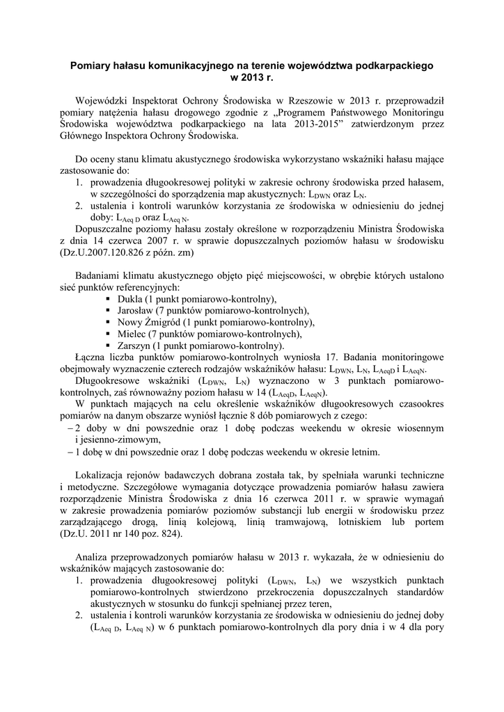 Pomiary hałasu komunikacyjnego na terenie województwa podkarpackiego w 2013 r. Wojewódzki Inspektorat Ochrony Środowiska w Rzeszowie w 2013 r. przeprowadził pomiary natężenia hałasu drogowego zgodnie z „Programem Państwowego Monitoringu Środowiska województwa podkarpackiego na lata 2013-2015” zatwierdzonym przez Głównego Inspektora Ochrony Środowiska. Do oceny stanu klimatu akustycznego środowiska wykorzystano wskaźniki hałasu mające zastosowanie do: 1. prowadzenia długookresowej polityki w zakresie ochrony środowiska przed hałasem, w szczególności do sporządzenia map akustycznych: LDWN oraz LN. 2. ustalenia i kontroli warunków korzystania ze środowiska w odniesieniu do jednej doby: LAeq D oraz LAeq N. Dopuszczalne poziomy hałasu zostały określone w rozporządzeniu Ministra Środowiska z dnia 14 czerwca 2007 r. w sprawie dopuszczalnych poziomów hałasu w środowisku (Dz.U.2007.120.826 z późn. zm) Badaniami klimatu akustycznego objęto pięć miejscowości, w obrębie których ustalono sieć punktów referencyjnych: Dukla (1 punkt pomiarowo-kontrolny), Jarosław (7 punktów pomiarowo-kontrolnych), Nowy Żmigród (1 punkt pomiarowo-kontrolny), Mielec (7 punktów pomiarowo-kontrolnych), Zarszyn (1 punkt pomiarowo-kontrolny). Łączna liczba punktów pomiarowo-kontrolnych wyniosła 17. Badania monitoringowe obejmowały wyznaczenie czterech rodzajów wskaźników hałasu: LDWN, LN, LAeqD i LAeqN. Długookresowe wskaźniki (LDWN, LN) wyznaczono w 3 punktach pomiarowokontrolnych, zaś równoważny poziom hałasu w 14 (LAeqD, LAeqN). W punktach mających na celu określenie wskaźników długookresowych czasookres pomiarów na danym obszarze wyniósł łącznie 8 dób pomiarowych z czego: − 2 doby w dni powszednie oraz 1 dobę podczas weekendu w okresie wiosennym i jesienno-zimowym, − 1 dobę w dni powszednie oraz 1 dobę podczas weekendu w okresie letnim. Lokalizacja rejonów badawczych dobrana została tak, by spełniała warunki techniczne i metodyczne. Szczegółowe wymagania dotyczące prowadzenia pomiarów hałasu zawiera rozporządzenie Ministra Środowiska z dnia 16 czerwca 2011 r. w sprawie wymagań w zakresie prowadzenia pomiarów poziomów substancji lub energii w środowisku przez zarządzającego drogą, linią kolejową, linią tramwajową, lotniskiem lub portem (Dz.U. 2011 nr 140 poz. 824). Analiza przeprowadzonych pomiarów hałasu w 2013 r. wykazała, że w odniesieniu do wskaźników mających zastosowanie do: 1. prowadzenia długookresowej polityki (LDWN, LN) we wszystkich punktach pomiarowo-kontrolnych stwierdzono przekroczenia dopuszczalnych standardów akustycznych w stosunku do funkcji spełnianej przez teren, 2. ustalenia i kontroli warunków korzystania ze środowiska w odniesieniu do jednej doby (LAeq D, LAeq N) w 6 punktach pomiarowo-kontrolnych dla pory dnia i w 4 dla pory nocy nie odnotowano przekroczeń standardów akustycznych w stosunku do funkcji spełnianej przez teren. Na badanych obszarach, dla wyznaczonych wskaźników, nie odnotowano przekroczeń powyżej 10 dB. Wyniki pomiarów długookresowego średniego poziomu dźwięku A w [dB] przeprowadzonych w 2013 r. na terenie województwa podkarpackiego (źródło: dane WIOŚ) Lokalizacja punktu pomiarowokontrolnego Dopuszczalny poziom LDWN Wynik pomiaru LDWN Wielkość przekroczenia Dopuszczalny poziom LN Wynik pomiaru LN Wielkość przekroczenia [dB] Dukla, 68 73,6 5,6 59 66,6 7,6 ul. Traktat Węgierski Jarosław , ul. Józefa 68 70,0 2,0 59 61,8 2,8 Ignacego Kraszewskiego Mielec, ul. Wolności 68 72,3 4,3 59 63,8 4,8 Objaśnienia skrótów użytych w tabeli: – długookresowy średni poziom dźwięku A wyrażony w decybelach (dB), wyznaczony w ciągu wszystkich dób w roku, z uwzględnieniem pory dnia (rozumianej jak przedział LDWN 00 00 00 00 00 LN czasu od godz. 6 do godz. 18 ), pory wieczoru (rozumianej jak przedział czasu od godz. 18 do godz. 22 ) oraz pory nocy (rozumianej jak przedział czasu od godz. 22 do godz. 600), – długookresowy średni poziom dźwięku A wyrażony w decybelach (dB), wyznaczony w ciągu wszystkich pór nocy w roku (rozumianej jak przedział czasu od godz. 2200 do godz. 600). Wyniki pomiarów równoważnego poziomu dźwięku A w [dB] przeprowadzonych w 2013 r. na terenie województwa podkarpackiego (źródło: dane WIOŚ) Miejscowość Wynik pomiaru LAeqN Wielkość przekroczenia 56 53,4 - - 56 54,0 - 68,0 3 56 56,4 0,4 65 66,7 1,7 56 59,2 3,2 65 57,8 - 56 50,2 - 61 52,7 - 56 43,7 - ul. Dukielska 65 64,9 - 56 63,0 7 al. Ducha Świętego ul. Kazimierza Jagiellończyka ul. Jana Kilińskiego ul. Adama Mickiewicza al. Niepodległości ul. Wincentego Witosa 65 63,6 - 56 56,8 0,8 65 67,3 2,3 56 58,0 2,0 61 67,1 6,1 56 57,9 1,9 65 69,6 4,6 56 61,7 5,7 65 66,5 1,5 56 63,8 7,8 61 66,7 5,7 56 61,4 5,4 56 64,0 8 Lokalizacja punktu pomiarowokontrolnego Dopuszczalny poziom LAeqD Wynik pomiaru LAeqD Wielkość przekroczenia 65 58,6 - 61 60,8 65 Dopuszczalny poziom LAeqN [dB] Jarosław Nowy Żmigród Mielec ul. Stefana Czarnieckiego ul. Tadeusza Kościuszki ul. Pełkińska ul. Józefa Poniatowskiego ul. Przemyska ul. Spytka z Jarosławia Zarszyn ul. Podkarpacka 65 68,7 3,7 Objaśnienia skrótów użytych w tabeli: – równoważny poziom dźwięku A dla pory dnia (rozumianej jako przedział czasu od godz. 600 do godz. 2200). LAeqD – równoważny poziom dźwięku A dla pory nocy (rozumianej jako przedział czasu od godz. 2200 do godz. 600). LAeqN