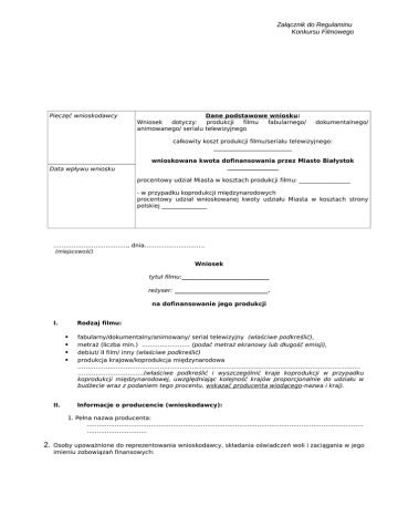 Załącznik do Regulaminu Konkursu Filmowego Pieczęć wnioskodawcy Dane podstawowe wniosku: Wniosek dotyczy: produkcji filmu fabularnego/ animowanego/ serialu telewizyjnego dokumentalnego/ całkowity koszt produkcji filmu/serialu telewizyjnego: __________________________ Data wpływu wniosku wnioskowana kwota dofinansowania przez Miasto Białystok _________________ procentowy udział Miasta w kosztach produkcji filmu: _________________ - w przypadku koprodukcji międzynarodowych procentowy udział wnioskowanej kwoty udziału Miasta w kosztach strony polskiej _______________ ….……………………………, dnia………………………… (miejscowość) Wniosek tytuł filmu:_____________________________ reżyser: _______________________________. na dofinansowanie jego produkcji I. Rodzaj filmu: II. fabularny/dokumentalny/animowany/ serial telewizyjny (właściwe podkreślić), metraż (liczba min.) …………………… (podać metraż ekranowy lub długość emisji), debiut/ II film/ inny (właściwe podkreślić) produkcja krajowa/koprodukcja międzynarodowa …………………………………………………………………………………………………………………………… ……………………………(właściwe podkreślić i wyszczególnić kraje koprodukcji w przypadku koprodukcji międzynarodowej, uwzględniając kolejność krajów proporcjonalnie do udziału w budżecie wraz z podaniem tego procentu, wskazać producenta wiodącego-nazwa i kraj). Informacje o producencie (wnioskodawcy): 1. Pełna nazwa producenta: ………………………………………………………………………………………………………………………… ………………………… 2. Osoby upoważnione do reprezentowania wnioskodawcy, składania oświadczeń woli i zaciągania w jego imieniu zobowiązań finansowych: ………………………………………………………………………………………………………………………… ……………………… ………………………………………………………………………………………………………………………… ……………………… 3. Osoba odpowiedzialna za przygotowanie wniosku i kontakty z Organizatorem (nr telefonu, faksu i e-mail): - …………………………………………………………………………………………………………………….. ……………… 4. Adres wnioskodawcy (województwo, miejscowość, kod poczt., ulica, nr telefonu i faksu, e-mail, należy podać również ewentualny adres do korespondencji): ………………………………………………………………………………………………………………………… ………………………………. ………………………………………………………………………………………………………………………… …............ 5. Numery NIP oraz Regon: ……………………………………………………………………………..…………………………. …………………….....…………… 6. Forma prawna: ………………………………………………………………………………………………………………………… ………………… 7. Nazwa banku i numer rachunku bankowego: ……………………………………………………………………………………..………………………….. …………………… III. Informacje o koproducencie : 1. Pełna nazwa koproducenta: ………………………………………………………………………………………………………………………… ……………………… 2. Osoby upoważnione do reprezentowania koproducenta, składania oświadczeń woli i zaciągania w jego imieniu zobowiązań finansowych: ……………………………………………………………………………………………………………………………………… ……… ……………………………………………………………………………………………………………………………………… ……… 3. Adres koproducenta (województwo, miejscowość, kod poczt., ulica, nr telefonu i faksu, e-mail): ………………………………………………………………………………………………………………………… ……………………… (w przypadku większej liczby koproducentów należy powtórzyć rubrykę potrzebną ilość razy) IV. Informacje o filmie: tytuł roboczy gatunek filmu autor scenariusza - oryginalny - adaptacja (źródło) metraż lub długość filmu (min projekcji) format reżyser*(imię i nazwisko, kraj) kierownik produkcji* (imię, nazwisko, kraj) operator obrazu*(imię, nazwisko, kraj) scenograf* (imię, nazwisko, kraj) wiodący aktorzy (imię, nazwisko, kraj) montażysta* nośnik główna wersja językowa inne (sposób Białystok) prezentacji wizerunku miasta * jeśli dany twórca debiutuje w danym filmie – proszę zaznaczyć V. Krótki opis filmu: …………………………………………………………………………………………………………………………… …………………………… …………………………………………………………………………………………………………………………… ……………………… …………………………………………………………………………………………………………………………… ……………………… …………………………………………………………………………………………………………………………… ……………………… …………………………………………………………………………………………………………………………
