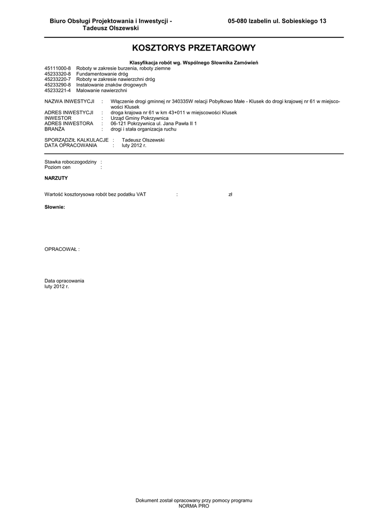 Biuro Obsługi Projektowania i Inwestycji Tadeusz Olszewski 05-080 Izabelin ul. Sobieskiego 13 KOSZTORYS PRZETARGOWY 45111000-8 45233320-8 45233220-7 45233290-8 45233221-4 Klasyfikacja robót wg. Wspólnego Słownika Zamówień Roboty w zakresie burzenia, roboty ziemne Fundamentowanie dróg Roboty w zakresie nawierzchni dróg Instalowanie znaków drogowych Malowanie nawierzchni NAZWA INWESTYCJI : ADRES INWESTYCJI INWESTOR ADRES INWESTORA BRANŻA : : : : Włączenie drogi gminnej nr 340335W relacji Pobyłkowo Małe - Klusek do drogi krajowej nr 61 w miejscowości Klusek droga krajowa nr 61 w km 43+011 w miejscowości Klusek Urząd Gminy Pokrzywnica 06-121 Pokrzywnica ul. Jana Pawła II 1 drogi i stała organizacja ruchu SPORZĄDZIŁ KALKULACJE : DATA OPRACOWANIA : Tadeusz Olszewski luty 2012 r. Stawka roboczogodziny : Poziom cen : NARZUTY Wartość kosztorysowa robót bez podatku VAT : zł Słownie: OPRACOWAŁ : Data opracowania luty 2012 r. Dokument został opracowany przy pomocy programu NORMA PRO -2KOSZTORYS PRZETARGOWY - włączenie drogi gminnej nr 340335W relacji Pobyłkowo Małe - Klusek do drogi krajowej nr 61 w km 43+011 w miejscowości Klusek. ROBOTY DROGOWE I STAŁA ORGANIZACJA RUCHU. Lp. Nr spec. techn. Jedn Ilość Cena Wartość . miazł zł ry (5 x 6) 1 2 3 4 5 6 7 KOSZTORYS PRZETARGOWY - włączenie drogi gminnej nr 340335W relacji Pobyłkowo Małe - Klusek do drogi krajowej nr 61 w km 43+011 w miejscowości Klusek. ROBOTY DROGOWE I STAŁA ORGANIZACJA RUCHU. 1 ROBOTY ROZBIÓRKOWE I ROBOTY ZIEMNE 1 D-01.02.04 Rozbiórka nawierzchni bitumicznej o gr. śr. 15 cm z wywozem m2 45 d.1 materiału z rozbiórki na odl. do 1 km 2 D-01.02.04 Wywiezienie gruzu z terenu rozbiórki - dodatek za każdy nam3 poz.1* d.1 stępny rozpoczęty 1 km - za nast. ..... km (odległość wywozu 0.15*1.4 = określa Wykonawca na własną odpowiedzialność) 9.45 3 D-01.01.01 Roboty pomiarowe przy liniowych robotach ziemnych - trasa km 0.1 d.1 dróg w terenie równinnym. 4 D-02.03.01 Wykopy oraz przekopy o wyk. na odkład w gr.kat. I-II m3 1 d.1 5 D-02.01.01 Roboty ziemne wykonywane w gr.kat. I-II z transp.urobku na m3 (31)*95% d.1 odl.do 1 km = 29.45 6 D-02.01.01 Wykopy z załadunkiem ręcznym i transportem na odległość do m3 (31)*5% = d.1 1 km (grunt kat. I-II) 1.55 7 D-02.01.01 Dodatek za każdy rozp. 1 km transportu ziemi po drogach o na- m3 poz.5+ d.1 wierzchni utwardzonej (kat.gr. I-IV) - za nast. ..... km (odległość poz.6 = wywozu określa Wykonawca na własną odpowiedzialność) 31.00 8 D-02.03.01 Ręczne formowanie nasypów z gruntu kat. I-II ułożonego m3 poz.4 = d.1 wzdłuż nasypu 1.00 9 D-02.03.01 Zagęszczanie nasypów z gruntu sypkiego kat.I-II zagęszczarm3 poz.8 = d.1 kami 1.00 10 D-09.01.01 Humusowanie terenu z obsianiem przy grubości warstwy hum2 20 d.1 musu 5 cm. 11 D-09.01.01 Humusowanie skarp z obsianiem,dodatek za każdy dalszy 1 m2 poz.10 = d.1 cm humusu - za nast. 5 cm 20.00 Krotność = 5 Razem dział: ROBOTY ROZBIÓRKOWE I ROBOTY ZIEMNE 2 PODBUDOWY 12 D-04.01.01 Profilowanie i zagęszczanie podłoża wykonywane mechaniczm2 95 d.2 nie w gruncie kat. II-IV pod warstwy konstrukcyjne nawierzchni 13 D-04.01.01 Profilowanie i zagęszczanie podłoża wykonywane ręcznie w m2 24 d.2 gruncie kat. II-IV pod warstwy konstrukcyjne nawierzchni 14 D-04.04.01 Warstwa dolna podbudowy z kruszyw naturalnych gr. 15 cm m2 95 d.2 15 D-04.04.02 Warstwa górna podbudowy z kruszyw łamanych gr. 20 cm m2 95 d.2 16 D-04.03.01 Oczyszczenie i skropienie emulsją asfaltową warstw niebitum2 100 d.2 micznych Razem dział: PODBUDOWY 3 ŁAWY, KRAWĘŻNIKI, OBRZEŻA I NAWIERZCHNIE 17 D-08.01.01b Ława pod krawężniki betonowa z oporem z betonu C12/15 m3 poz.18* d.3 0.0594 = 2.02 18 D-08.01.01b Krawężniki betonowe wtopione o wymiarach 12x25 cm bez ław m 34 d.3 na podsypce cementowo-piaskowej 19 D-05.02.01 Nawierzchnie z tłucznia kamiennego - warstwa górna o gr. 10 m2 poz.13 = d.3 cm 24.00 20 D-05.03.05b Nawierzchnie z mieszanek mineralno-bitumicznych - warstwa m2 100 d.3 wiążąca o gr. 7 cm 21 D-04.03.01 Oczyszczenie i skropienie emulsją asfaltową podbudowy lub m2 poz.20 = d.3 nawierzchni bitumicznej 100.00 22 D-05.03.26a Ułożenie geosiatki przeciwspękaniowej pod warstwy bitumiczne m2 25 d.3 23 D-05.03.05a Nawierzchnie z mieszanek mineralno-bitumicznych - warstwa m2 100 d.3 ścieralna o gr. 5 cm Razem dział: ŁAWY, KRAWĘŻNIKI, OBRZEŻA I NAWIERZCHNIE 4 STAŁA ORGANIZACJA RUCHU 4.1 Demontaż i Instalowanie znaków drogowych 24 D-07.02.01 Pionowe znaki drogowe - znaki informacyjne typu II o pow. poszt. 1 d.4.1 nad 0.3 m2 Razem dział: Demontaż i Instalowanie znaków drogowych 4.2 Malowanie nawierzchi - oznakowanie poziome 25 D-07.01.01 Oznakowanie poziome jezdni farbą akrylową odblaskową - linie m2 3 d.4.2 segregacyjne i krawędziowe przerywane malowane ręcznie Razem dział: Malowanie nawierzchi - oznakowanie poziome Razem dział: STAŁA ORGANIZACJA RUCHU Wartość kosztorysowa robót bez podatku VAT Słownie: Norma PRO Wersja 4.36 Nr seryjny: 4939 Opis