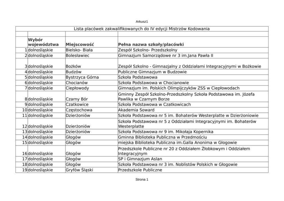 Arkusz1 Lista placówek zakwalifikowanych do IV edycji Mistrzów Kodowania Wybór województwa 1 dolnośląskie 2 dolnośląskie Miejscowość Bielsko- Biała Bolesławiec Pełna nazwa szkoły/placówki Zespół Szkolno- Przedszkolny Gimnazjum Samorządowe nr 3 im.Jana Pawła II 3 dolnośląskie 4 dolnośląskie 5 dolnośląskie 6 dolnośląskie 7 dolnośląskie Bożków Budzów Bystrzyca Górna Chocianów Ciepłowody Zespół Szkolno - Gimnazjalny z Oddziałami Integracyjnymi w Bożkowie Publiczne Gimnazjum w Budzowie Szkoła Podstawowa Szkoła Podstawowa w Chocianowie Gimnazjum im. Polskich Olimpijczyków ZSS w Ciepłowodach 8 dolnośląskie 9 dolnośląskie 10 dolnośląskie 11 dolnośląskie Czarny Bór Czatkowice Częstochowa Dzierżoniów Gminny Zespół Szkolno-Przedszkolny Szkoła Podstawowa im. Józefa Pawlika w Czarnym Borze Szkoła Podstawowa w Czatkowicach Akademia Soward Szkoła Podstawowa nr 5 im. Bohaterów Westerplatte w Dzierżoniowie 12 dolnośląskie 13 dolnośląskie 14 dolnośląskie 15 dolnośląskie Dzierżoniów Dzierżoniów Głogów Głogów Szkoła Podstawowa nr 5 z Oddziałami Integracyjnymi im. Bohaterów Westerplatte Szkoła Podstawowa nr 9 im. Mikołaja Kopernika Gminna Biblioteka Publiczna w Przedmościu miejska Biblioteka Publiczna im.Galla Anonima w Głogowie 16 dolnośląskie 17 dolnośląskie 18 dolnośląskie 19 dolnośląskie Głogów Głogów Głogów Gryfów Śląski Przedszkole Publiczne nr 20 z Oddziałem Żłobkowym i Oddziałem Integracyjnym SP i Gimnazjum Aslan Szkoła Podstawowa nr 3 im. Noblistów Polskich w Głogowie Przedszkole Publiczne Strona 1 Arkusz1 20 dolnośląskie 21 dolnośląskie 22 dolnośląskie 23 dolnośląskie 24 dolnośląskie 25 dolnośląskie 26 dolnośląskie 27 dolnośląskie 28 dolnośląskie Jedlina-Zdrój Jutrosin Kamieniec Wrocławski Kąty Wrocławskie Kłodzko Kłodzko Kobierzyce Legnica Legnica Gimnazjum Miejskie im. Jana Pawła II w Jedlinie-Zdroju Zespół Szkół w Szkaradowie Szkoła Podstawowa im. Bolesława Krzywoustego Szkoła Podstawowa nr 1 im. Kardynała Bolesława Kominka Miejski Zespół Szkół Przedszkole nr 2 Zespół Szkolno-Przedszkolny w Wysokiej I Liceum Ogólnokształcące im. T. Kosciuszki Szkoła Podstawowa nr 9 29 dolnośląskie 30 dolnośląskie 31 dolnośląskie 32 dolnośląskie 33 dolnośląskie 34 dolnośląskie 35 dolnośląskie 36 dolnośląskie 37 dolnośląskie 38 dolnośląskie 39 dolnośląskie 40 dolnośląskie 41 dolnośląskie 42 dolnośląskie 43 dolnośląskie 44 dolnośląskie 45 dolnośląskie Leszno Lubań Lubań Lubin Lubin Lubin Lubin Lubin Lubin Lwówek Śląski Lwówek Śląski Lwówek Śląski Mietków Międzybórz Międzylesie Oborniki Śląskie Oleśnica Szkoła Podstawowa nr 13 z Oddziałami Integracyjnymi im .Króla Stanisława Leszczyńskiego Szkoła Podstawowa im. Kawalerów Uśmiechu Zespół Szkolno-Przedszkolny w Pisarzowicach Gimnazjum nr 1 im. Czesława Niemena w Lubinie Szkola Podstawowa nr 14 im. gen. broni Stanisława Maczka w Lubinie Szkoła Podstawowa im. Marii Konopnickiej w Krzeczynie Wielkim Szkoła Podstawowa nr 14 im. gen. broni Stanisława Maczka Szkoła Podstawowa nr 9 im. Stefanii Sempołowskiej w Lubinie Zespół Szkół Społecznych im. Rady Europy w Lubinie Szkoła Podstawowa Nr 2 w Lwówku Śląskim Szkoła Podstawowa w Płóczkach Górnych Szkoła Podstawowa we Włodzicach Wielkich Szkoła Podstawowa im.Ojca Św.Jana Pawła II Gimnazjum Samorządowe im. Polskich Noblistów Zespół Szkół w Międzylesiu Publiczna Szkoła Podstawowa nr 3 im. Jana Pawła II SP nr 44 im. Jana III Sobieskiego w Zespole Szkół Nr 10 Strona 2 Arkusz1 46 dolnośląskie Oleśnica Szkoła Podstawowa nr 4 im.prof. R. Podoskiego 47 dolnośląskie Oleśnica Zespół Szkół Ponadgimnazjalnych im. Marii Skłodowskiej-Curie w Oleśnicy 48 dolnośląskie 49 dolnośląskie 50 dolnośląskie 51 dolnośląskie 52 dolnośląskie 53 dolnośląskie 54 dolnośląskie 55 dolnośląskie 56 dolnośląskie 57 dolnośląskie 58 dolnośląskie 59 dolnośląskie 60 dolnośląskie 61 dolnośląskie Oława Oława Polkowice Polkowice Polkowice Polkowice Prusice Przeworno Świdnica Świdnica TRZEBNICA Twardogóra Udanin Wałbrzych Szkoła Podstawowa im. Kawalerów Orderu Uśmiechu w Marcinkowicach Szkoła Podstawowa w Chwalibożycach Gimnazjum nr 1 im. Jana Pawła II w Polkowicach Szkoła Podsawowa Nr 3 im. Arkadego Fiedlera w Polkowicach Szkoła Podstawowa nr 2 Szkoła Podstawowa nr 2 im. Kornela Makuszyńskiego w Polkowicach Szkoła Podstawowa w Piotrkowicach Zespół Szkolny-Przedszkolny w Przewornie Szkoła Podstawowa nr 4 im. H. Sienkiewicza Szkoła Podstawowa w Bystrzycy Górnej Szkoła Podstawowa nr 3 im. M. Skłodowskiej-Curie Szkoła Podstawowa nr 2 im. Jana Pawła II Zespół Szkolno-Przedszkolny Zespół Szkół nr 2 im. Hugona Kołłątaja w Wałbrzychu 62 dolnośląskie 63 dolnośląskie 64 dolnośląskie 65 dolnośląskie 66 dolnośląskie Wałbrzych Węgliniec Wiązów Wrocław Wrocław Zespół Szkół z Oddziałami Integracyjnymi im. Komisji Edukacji Narodowej Szkoła Podstawowa im. Jana Pawła II w Czerwonej Wodzie Szkoła Podstawowa im. Jana Pawła II w Jaworowie Gimnazjum nr 1 im. H. D. Steinhausa Miejska Biblioteka Publiczna/MultiCentrum Wrocław Wrocław Ogólnokształcąca Szkoła Muzyczna I i II stopnia im. Karola Szymanowskiego Prywatna Szkoła Podstawowa Sigma 67 dolnośląskie 68 dolnośląskie Strona 3 Arkusz1 69 dolnośląskie 70 dolnośląskie 71 dolnośląskie 72 dolnośląskie 73 dolnośląskie WROCŁAW Wrocław Wrocław Wrocław Wrocław Przedszkole nr 56 "Niezapominajka" Regionalny Ośrodek Edukacji Technikum Szkoła Podstawowa nr 15 we Wrocławiu im. Księżnej Jadwigi Śląskiej Szkoła Podstawowa nr 24 Szkoła Podstawowa nr 3 im. Mariusza Zaruskiego 74 dolnośląskie 75 dolnośląskie 76 dolnośląskie 77 dolnośląskie 78 dolnośląskie 79 dolnośląskie 80 dolnośląskie 81 dolnośląskie Wrocław Wrocław Wrocław Wrocław Wrocław Wrocław Wroc