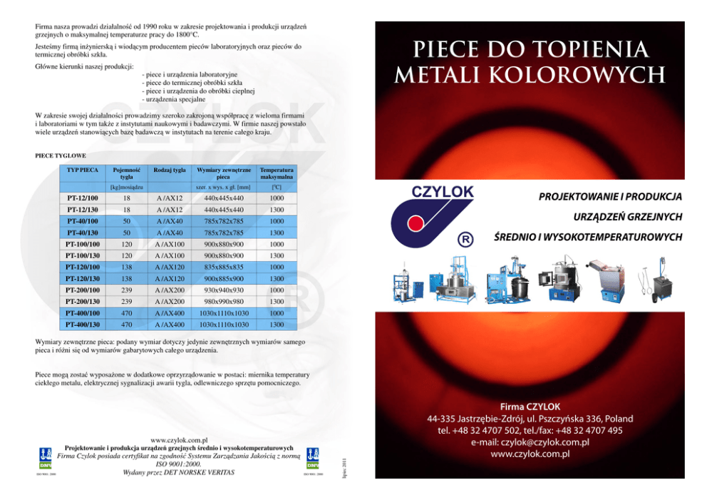 Firma nasza prowadzi działalno od 1990 roku w zakresie projektowania i produkcji urzdze grzejnych o maksymalnej temperaturze pracy do 1800°C. PIECE DO TOPIENIA METALI KOLOROWYCH Jestemy firm inyniersk i wiodcym producentem pieców laboratoryjnych oraz pieców do termicznej obróbki szkła. Główne kierunki naszej produkcji: - piece i urzdzenia laboratoryjne - piece do termicznej obróbki szkła - piece i urzdzenia do obróbki cieplnej - urzdzenia specjalne W zakresie swojej działalnoci prowadzimy szeroko zakrojon współprac z wieloma firmami i laboratoriami w tym take z instytutami naukowymi i badawczymi. W firmie naszej powstało wiele urzdze stanowicych baz badawcz w instytutach na terenie całego kraju. PIECE TYGLOWE TYP PIECA Pojemno tygla Rodzaj tygla [kg]mosidzu Wymiary zewntrzne pieca Temperatura maksymalna szer. x wys. x gł. [mm] [0C] PT-12/100 18 A /AX12 440x445x440 1000 PT-12/130 18 A /AX12 440x445x440 1300 PT-40/100 50 A /AX40 785x782x785 1000 PT-40/130 50 A /AX40 785x782x785 1300 PT-100/100 120 A /AX100 900x880x900 1000 PT-100/130 120 A /AX100 900x880x900 1300 PT-120/100 138 A /AX120 835x885x835 1000 PT-120/130 138 A /AX120 900x885x900 1300 PT-200/100 239 A /AX200 930x940x930 1000 PT-200/130 239 A /AX200 980x990x980 1300 PT-400/100 470 A /AX400 1030x1110x1030 1000 PT-400/130 470 A /AX400 1030x1110x1030 1300 PROJEKTOWANIE I PRODUKCJA URZĄDZEŃ GRZEJNYCH ŚREDNIO I WYSOKOTEMPERATUROWYCH Wymiary zewntrzne pieca: podany wymiar dotyczy jedynie zewntrznych wymiarów samego pieca i róni si od wymiarów gabarytowych całego urzdzenia. Piece mog zosta wyposaone w dodatkowe oprzyrzdowanie w postaci: miernika temperatury ciekłego metalu, elektrycznej sygnalizacji awarii tygla, odlewniczego sprztu pomocniczego. www.czylok.com.pl Firma Czylok posiada certyfikat na zgodno Systemu Zarzdzania Jakoci z norm ISO 9001:2000. Wydany przez DET NORSKE VERITAS ISO 9001: 2000 ISO 9001: 2000 lipiec 2011 Projektowanie i produkcja urzdze grzejnych rednio i wysokotemperaturowych Firma CZYLOK 44-335 Jastrzębie-Zdrój, ul. Pszczyńska 336, Poland tel. +48 32 4707 502, tel./fax: +48 32 4707 495 e-mail: [email protected] www.czylok.com.pl PIEC LABORATORYJNY TYGLOWY PRÓNIOWY TYP: PT-60 Przeznaczenie: Piec tyglowy PT-60 przeznaczony jest do topienia metali kolorowych w atmosferze ochronnej gazowej lub w próni Piec przeznaczony jest do uytku laboratoryjnego. Istnieje moliwo wyposaenia pieca w mieszadło oraz dozownik materiałów kompozytowych, których uycie nie zakłóca atmosfery pieca. PIEC AUTOKLAWOWY PRZEZNACZONY DO TOPIENIA I WYTWARZANIA ZAWIESIN KOMPOZYTOWYCH W PODCINIENIU W ATMOSFERZE ARGONU W ZAKRESIE TEMPERATUR DO 8000 C TYP: PTA-200/PRG Przeznaczenie: Piec PTA-200/PrG przeznaczony jest do topienia i wytwarzania kompozytowych materiałów lub samego topienia i rafinacji. Wyposaenie pieca umoliwia topienie w próni lub gazie osłonowym, a take prowadzenia rafinacji metalu i dozowania dodatków uzupełniajcych lub kompozytowych w warunkach atmosfery beztlenowej. Piec moe zosta wyposaony w układ dopływu gazu ochronnego. Temperatura maksymalna 1100 0C Typ pieca PTA-200/PrG Moc pieca 1,4 kW Rodzaj pieca tyglowy w gazoszczelnym autoklawie Wymiary gabarytowe urzdzenia 360 x 800 x 380 mm (szer. x wys. x gł.) Temperatura maksymalna 8000 C Wymiary komory roboczej φ 140 x 160 mm Wymiary tygla Wymiary gabarytowe 1236 x 2520 x 1920 mm φ 61/φ 56,5 x 100 mm urzdzenia (szer. x wys. x gł.) Objto tygla 0,13 l Maksymalna prónia 20 mbar Wymiary komory roboczej φ 430 x 540 mm Sterownik temperatury programator temperatury MRT-4 Typ tygla B60 (60 kg Al) Maksymalne podcinienie 20 mbar ABS Moc pieca – zainstalowana 21,0 kW Sterownik temperatury programator temp. MRT-4/BTC – 1 szt. Masa urzdzenia ~730 kg Pomiar temperatury ciekłego metalu termopara typ:K PIEC TYGLOWY TYP: PT-1 Przeznaczenie: Elektryczny oporowy piec tyglowy typu PT-1 przeznaczony jest do topienia metali kolorowych w sposób cigły w temp. do 12000C. Piec przeznaczony jest do pracy w laboratoriach i zakładach rzemielniczych Piec moe zosta wyposaony w układ dopływu gazu ochronnego. Piec wyposaony jest w: Mikroprocesorowy miernik cinienia Mechanizm obrotów mieszadła Mechanizm unoszenia/opuszczania mieszadła Pompa próniowa Temperatura maksymalna 1200 0C Termopara pomiarowa Moc pieca 1,2 kW Pomiar temperatury stopu Wymiary gabarytowe urzdzenia 265 x 575 x 265 mm (szer. x wys. x gł.) Rotametr mieszadła Wymiary komory grzejnej φ 110 x 155 mm Rotametr komory pieca Wymiary tygla φ90/φ50 x 90 mm Zasobnik kompozytu Objto tygla 0,2 l Rodzaj tygla AX1 Sterownik temperatury regulator temperatury MRT-3 lub programator MRT-4 STANOWISKO DO TOPIENIA STOPÓW MAGNEZU PTM-30/G JEST PRZEZNACZONE DO TOPIENIA I ODLEWANIA STOPÓW MAGNEZU TYP:PTM-30/G Przeznaczenie: Stanowisko PTM-30/G przeznaczone jest do topienia i odlewania stopów magnezu w iloci do 30 kg odlewu. Konstrukcja stanowiska umoliwia przygotowanie stopu o wysokiej czystoci. Stanowisko wyposaone jest w mieszadło, które umoliwia prowadzenie rafinacji metalu. Po zakoczonym procesie przygotowania stopu dokonuje si odlewania w komorze osłonowej (np: przez spust metalu do kokil). PIEC TYGLOWY TYP:PT-12 Przeznaczenie: Elektryczne oporowe piece tyglowe typu PT przeznaczone s do topienia metali kolorowych. w sposób cigły w temp. do 10000C i 13000C dla poszczególnych modeli temperaturowych. Piece przeznaczone s do pracy w odlewniach, laboratoriach, zakładach przemysłowych i rzemielniczych oraz wszdzie tam, gdzie wielko tygla pozwala uzyska potrzebn ilo ciekłego metalu. Piec jest wyposaony w stacj mieszania gazów wlotowych. Model stanowiska PTM-30/G Wymiary gabarytowe urzdzenia 1340 x 2960 x 1460 mm Temperatura maksymalna (szer. x wys. x gł.) Moc pieca Wymiary gabarytowe urzdzenia PIEC Rodzaj pieca tyglowy, gazoszczelny Temperatura maksymalna 9000 C Robocza objto tygla 17 l Atmosfera ochronna prónia – gaz (mieszanina Ar2+SF6) Maksymalne podcinienie 20 mbar ABS Maksymalna prdko ob