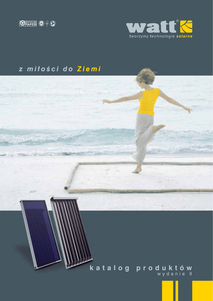 spis treści TECHNOLOGIE SOLARNE • o nas... • zmieniamy się... 2 3 4 ZESTAWY SOLARNE • zestawy - SU • zestawy - CPC • zestawy - DUO • zestawy - VIP 6 9 11 13 15 KOLEKTORY SŁONECZNE • kolektory płaskie • kolektory próżniowe 16 18 23 SYSTEMY MOCOWAŃ • do kolektorów płaskich • do kolektorów próżniowych 26 28 34 OSPRZĘT INSTALACJI SOLARNYCH • do kolektorów płaskich • do kolektorów próżniowych • do kolektorów próżniowych i płaskich 42 45 52 54 PODGRZEWACZE C .W.U. i C .O. • podgrzewacze C.W.U. i C.O. z jedną wężownicą • podgrzewacze C .W.U. z podwójną wężownicą 78 80 82 KOLEKTORY EKSPOZYCYJNE 85 JAK NAS ZNALEŹĆ 86 Broszura zawiera ceny katalogowe netto. Do podanych cen należy doliczyć 22% VAT. Niniejsza treść nie stanowi oferty handlowej w myśl rozumienia Kodeksu Cywilnego. 1 technologie solarne z miłości do Ziemi... z miłości do Ziemi... Firma Watt od 1998 roku doskonali metody pozyskiwania energii ze źródeł odnawialnych. Wytyczamy nowe kierunki rozwoju, udoskonalamy technologię, poszukujemy jeszcze efektywniejszych sposobów wykorzystania niewyczerpalnej energii słonecznej. Umiejętność pozyskiwania i wykorzystywania energii słonecznej jest dowodem troski o środowisko naturalne. Rozumiemy to i oferujemy nowoczesne, ekonomiczne rozwiązania doskonale wpisujące się w aktualne tendencje ogólnoświatowe oraz w strategię rozwoju naszego kraju. Przyczyniając się do redukcji CO2, wyprzedzamy rozwiązania prawne w tym zakresie. Pozwala to już dziś obniżyć koszty pozyskiwania energii, które z każdym rokiem będą wyższe. Miłość do ziemi wiążemy z szacunkiem dla człowieka. Troszczymy się o zadowolenie naszych partnerów na każdym etapie współpracy: po- 2 cząwszy od etapu koncepcyjnego, poprzez liczne konsultacje specjalistyczne, aż po realizację powierzonych nam zadań. Aktywnie współtworzymy najnowocześniejsze technologie. Prowadzimy własne badania. Udoskonalamy rozwiązania, które pozwoliły nam osiągnąć pozycję jednego z liderów na międzynarodowym rynku producentów kolektorów słonecznych. Uważnie śledzimy aktualne tendencje w technologiach solarnych. Błyskawicznie odpowiadamy na potrzeby i oczekiwania użytkowników, instalatorów i dystrybutorów. Profesjonalizm, wsparty niezawodną logistyką doceniają wieloletni współpracownicy. tworzymy technologie solarne... Firma Watt należy do europejskiej elity producentów systemów solarnych. o nas... www.watt.pl ...tworzymy technologie solarne Skonstruowaliśmy najwydajniejszy na świecie kolektor płaski. 85-procentowa efektywność kolektora WATT 4000 S jest najlepszym wynikiem w historii, jaki odnotował renomowany Institut für Solarenergieforschung w Hameln (ISFH) testujący kolektory według zasad SOLAR KEYMARK. Nasze produkty posiadają certyfikaty potwierdzające, iż spełniają normy jakości i wydajności (zgodnie z normą EN 12795 i EN 12976). Długoletnie doświadczenia i ciągła innowacyjność w pozyskiwaniu naturalnej czystej energii dają nam pewność, że nasze produkty są niezawodne w działaniu, a przy tym oferują użytkownikom bezpieczne, komfortowe i tanie ciepło. Każdy element systemów solarnych tworzonych przez Watt jest efektem połączenia głębokiej wiedzy, ciężkiej pracy i wytrwałości w dążeniu do zrozumienia i praktycznego wykorzystania potencjału energii słonecznej. Instalacje słoneczne firmy Watt przez długie lata gwarantują niezawodne użytkowanie, skutecznie przygotowując wodę użytkową oraz wspomagając systemy grzewcze domów i instytucji. W dążeniu do perfekcji stosujemy materiały wysokiej jakości, szczycimy się precyzją i solidnością wykonania oraz szczególną dbałością o estetykę naszych produktów. Kolektory słoneczne firmy Watt, zanim trafią do klientów, poddawane są licznym testom i analizom technicznym. Firma Watt oferuje zróżnicowaną gamę modeli kolektorów słonecznych. Trwałe, wytrzymałe i niezawodne, sprawdzają się nawet w trudnych warunkach ekspozycyjnych. Wyciągamy do Państwa pomocną dłoń, aby ułatwić szeroki dostęp do energii słonecznej. Kolektory słoneczne to inwestycja na wiele lat, która, dzięki swej rentowności, zyskuje coraz większą popularność także w Polsce. 3 technologie solarne zmieniamy się... W produkcji kolektorów słonecznych innowacyjność firmy Watt wyznacza nowe, wyższe standardy. Znajdujemy rozwiązania, które poprawiają sprawność pozyskiwania ciepła, czynią systemy jeszcze bardziej niezawodnymi, zabezpieczają przed negatywnym wpływem warunków atmosferycznych, a w efekcie wydłużają okres użytkowania. Jesteśmy dumni z efektów naszej pracy. Znajdują one uznanie użytkowników i są źródłem sukcesu rynkowego. Opracowaliśmy unikalny sposób łączenia absorbera z rurkami miedzianymi, który został zastrzeżony patentem. Jako pierwsi w Polsce wyprodukowaliśmy kolektor próżniowy wykorzystujący w swojej strukturze szklane rury próżniowe i wysoko refleksyjne lustro paraboliczne. Pracujemy w oparciu o system zarządzania jakością ISO 9001 ÷ 2000, optymalizując działanie firmy. Dopasowujemy strukturę firmy Watt do wyzwań związanych z udoskonalaniem procesu produkcyjnego instalacji solarnych. Stale poszukujemy nowych ścieżek rozwoju systemów solarnych, aby nasze produkty wciąż były najlepszymi kolektorami na świecie. Jesteśmy przekonani, że tylko rosnąca kompetencja zapewni wysoką jakość naszych produktów i usprawni ich tworzenie. Instalacje solarne są modne, łatwiej dostępne i coraz poważniej traktowane przez inwestorów. Pragniemy sprostać rosnącym oczekiwaniom, dlatego w Sosnowcu, w obrębie Katowickiej Strefy Ekonomicznej, powstaje obecnie nowa hala produkcyjna. Będzie ona miała ogromną powierzchnię 25 384 m². Tyle, co cztery boiska piłkarskie! Część produkcyjna zajmie 9 623im². Na przestrzeń magazynową przeznaczono 13 329 m², natomiast