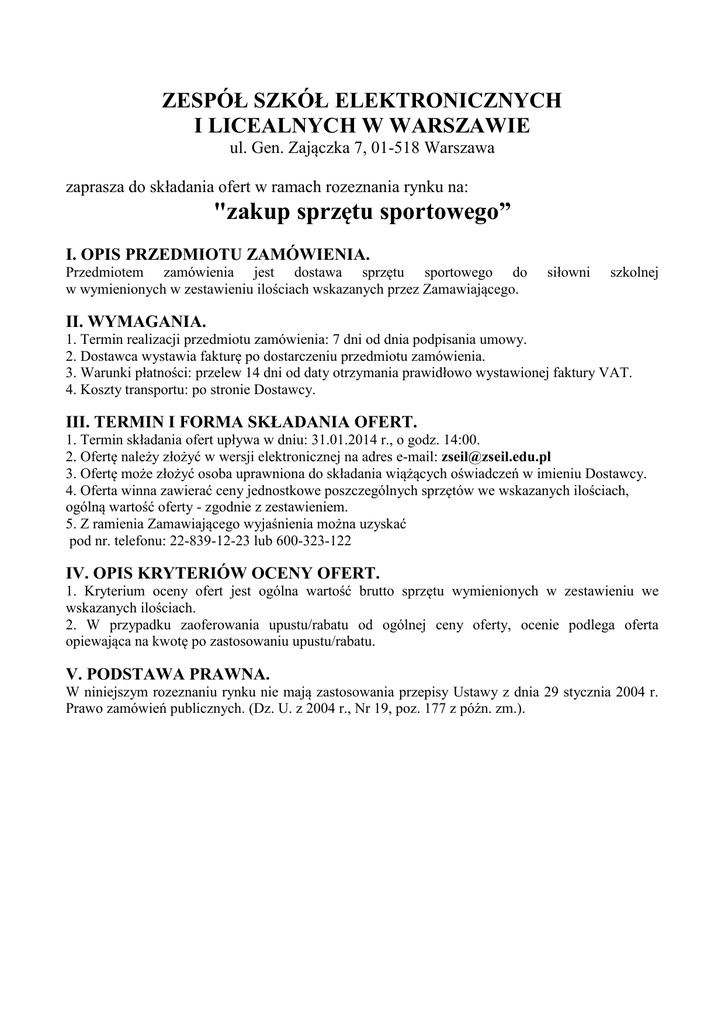ZESPÓŁ SZKÓŁ ELEKTRONICZNYCH I LICEALNYCH W WARSZAWIE ul. Gen. Zajączka 7, 01-518 Warszawa zaprasza do składania ofert w ramach rozeznania rynku na: "zakup sprzętu sportowego” I. OPIS PRZEDMIOTU ZAMÓWIENIA. Przedmiotem zamówienia jest dostawa sprzętu sportowego do w wymienionych w zestawieniu ilościach wskazanych przez Zamawiającego. siłowni szkolnej II. WYMAGANIA. 1. Termin realizacji przedmiotu zamówienia: 7 dni od dnia podpisania umowy. 2. Dostawca wystawia fakturę po dostarczeniu przedmiotu zamówienia. 3. Warunki płatności: przelew 14 dni od daty otrzymania prawidłowo wystawionej faktury VAT. 4. Koszty transportu: po stronie Dostawcy. III. TERMIN I FORMA SKŁADANIA OFERT. 1. Termin składania ofert upływa w dniu: 31.01.2014 r., o godz. 14:00. 2. Ofertę należy złożyć w wersji elektronicznej na adres e-mail: [email protected] 3. Ofertę może złożyć osoba uprawniona do składania wiążących oświadczeń w imieniu Dostawcy. 4. Oferta winna zawierać ceny jednostkowe poszczególnych sprzętów we wskazanych ilościach, ogólną wartość oferty - zgodnie z zestawieniem. 5. Z ramienia Zamawiającego wyjaśnienia można uzyskać pod nr. telefonu: 22-839-12-23 lub 600-323-122 IV. OPIS KRYTERIÓW OCENY OFERT. 1. Kryterium oceny ofert jest ogólna wartość brutto sprzętu wymienionych w zestawieniu we wskazanych ilościach. 2. W przypadku zaoferowania upustu/rabatu od ogólnej ceny oferty, ocenie podlega oferta opiewająca na kwotę po zastosowaniu upustu/rabatu. V. PODSTAWA PRAWNA. W niniejszym rozeznaniu rynku nie mają zastosowania przepisy Ustawy z dnia 29 stycznia 2004 r. Prawo zamówień publicznych. (Dz. U. z 2004 r., Nr 19, poz. 177 z późn. zm.). ZESTAWIENIE ILOŚCIOWO CENOWE ZAMAWIANEGO SPRZĘTU Lp. Nazwa sprzętu 1 TRX FORCE 2 Piłki Fitness 55cm Zestaw hantli chromowanych 3 1-10kg (zestaw 20 hantli) ze stojakiem 4 Hantla Kettlebell 6kg 5 Hantla Kettlebell 10kg 6 Piłka lekarska 5kg 7 Ergometr Concept 2 8 Rower stacjonarny Ilość Cena netto za szt. Stawka VAT Cena brutto za szt. 8 szt. 8 szt. 1 zestaw 2 szt. 2 szt. 5 szt. 2 szt. 3 szt. RAZEM Wartość brutto za całość