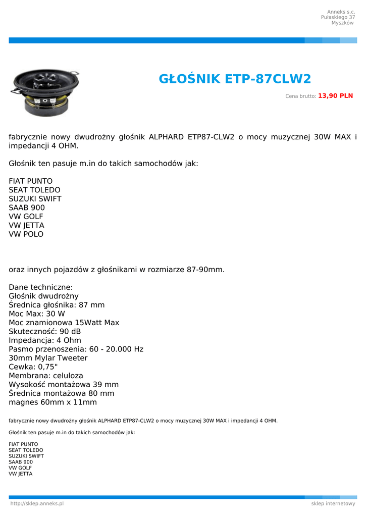Anneks s.c. Pułaskiego 37 Myszków GŁOŚNIK ETP-87CLW2 Cena brutto: 13,90 PLN fabrycznie nowy dwudrożny głośnik ALPHARD ETP87-CLW2 o mocy muzycznej 30W MAX i impedancji 4 OHM. Głośnik ten pasuje m.in do takich samochodów jak: FIAT PUNTO SEAT TOLEDO SUZUKI SWIFT SAAB 900 VW GOLF VW JETTA VW POLO oraz innych pojazdów z głośnikami w rozmiarze 87-90mm. Dane techniczne: Głośnik dwudrożny Średnica głośnika: 87 mm Moc Max: 30 W Moc znamionowa 15Watt Max Skuteczność: 90 dB Impedancja: 4 Ohm Pasmo przenoszenia: 60 - 20.000 Hz 30mm Mylar Tweeter Cewka: 0,75" Membrana: celuloza Wysokość montażowa 39 mm Średnica montażowa 80 mm magnes 60mm x 11mm fabrycznie nowy dwudrożny głośnik ALPHARD ETP87-CLW2 o mocy muzycznej 30W MAX i impedancji 4 OHM. Głośnik ten pasuje m.in do takich samochodów jak: FIAT PUNTO SEAT TOLEDO SUZUKI SWIFT SAAB 900 VW GOLF VW JETTA http://sklep.anneks.pl sklep internetowy Anneks s.c. Pułaskiego 37 Myszków VW POLO oraz innych pojazdów z głośnikami w rozmiarze 87-90mm. Dane techniczne: Głośnik dwudrożny Średnica głośnika: 87 mm Moc Max: 30 W Moc znamionowa 15Watt Max Skuteczność: 90 dB Impedancja: 4 Ohm Pasmo przenoszenia: 60 - 20.000 Hz 30mm Mylar Tweeter Cewka: 0,75" Membrana: celuloza Wysokość montażowa 39 mm Średnica montażowa 80 mm magnes 60mm x 11mm http://sklep.anneks.pl sklep internetowy