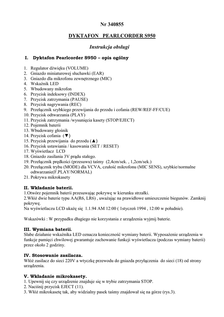 Nr 340855 DYKTAFON PEARLCORDER S950 Instrukcja obsługi I. Dyktafon Pearlcorder S950 – opis ogólny 1. Regulator dźwięku (VOLUME) 2. Gniazdo miniaturowej słuchawki (EAR) 3. Gniazdo dla mikrofonu zewnętrznego (MIC) 4. Wskaźnik LED 5. Wbudowany mikrofon 6. Przycisk indeksowy (INDEX) 7. Przycisk zatrzymania (PAUSE) 8. Przycisk nagrywania (REC) 9. Przełącznik szybkiego przewijania do przodu i cofania (REW/REF-FF/CUE) 10. Przycisk odtwarzania (PLAY) 11. Przycisk zatrzymania /wysunięcia kasety (STOP/EJECT) 12. Pojemnik baterii 13. Wbudowany głośnik 14. Przycisk cofania (▼) 15. Przycisk przewijania do przodu (▲) 16. Przycisk ustawiania / kasowania (SET / RESET) 17. Wyświetlacz LCD 18. Gniazdo zasilania 3V prądu stałego. 19. Przełącznik prędkości (przesuwu) taśmy (2,4cm/sek. , 1,2cm/sek.) 20. Przełącznik trybu (MODE) dla VCVA, czułość mikrofonu (MIC SENS), szybkie/normalne odtwarzanie(F.PLAY/NORMAL) 21. Pokrywa mikrokasety II. Wkładanie baterii. 1.Otwórz pojemnik baterii przesuwając pokrywę w kierunku strzałki. 2.Włóż dwie baterie typu AA(R6, LR6) , uważając na prawidłowe umieszczenie biegunów. Zamknij pokrywę. Na wyświetlaczu LCD ukażę się 1.1.94 AM 12:00 ( 1styczeń 1994 , 12:00 w południe). Wskazówki : W przypadku długiego nie korzystania z urządzenia wyjmij baterie. III. Wymiana baterii. Słabe działanie wskaźnika LED oznacza konieczność wymiany baterii. Wyposażenie urządzenia w funkcje pamięci chwilowej gwarantuje zachowanie funkcji wyświetlacza (podczas wymiany baterii) przez około 2 godziny. IV. Stosowanie zasilacza. Włóż zasilacz do sieci 220V a wtyczkę przewodu do gniazda przyłączenia do sieci (18) od strony urządzenia. V. Wkładanie mikrokasety. 1. Upewnij się czy urządzenie znajduje się w trybie zatrzymania STOP. 2. Naciśnij przycisk EJECT (11). 3. Włóż mikrokasetę tak, aby widzialny pasek taśmy znajdował się na górze (rys.3). 4. Zamknij delikatnie pokrywę pomieszczenia mikrokasety (21). Przed włożeniem mikrokasety upewnij się, czy taśma jest właściwie napięta. Luźna taśma może zostać wciągnięta lub owinąć się wokół wałka napędu. Zaleca się stosowanie mikrokaset firmy Olympus. VI. Zastosowanie wyświetlacza LCD. Wyświetlacz LCD (17) pokazuje aktualny stan licznika taśmy (z góry na dół), datę i aktualny czas. VI-1. Ustawienie daty i godziny. Przy uruchamianiu przycisków SET (16), przycisku cofania (▼) (14) i przycisku przewijania do przodu(▲) (15) nie należy stosować siły i używać przedmiotów ostrych. 1. Naciśnij przycisk STOP. 2. Naciśnij przycisk SET (przycisk ustawienia) i przytrzymaj przez około 2 sekundy. Wskaźnik godziny zacznie pulsować. * Krótsze przytrzymanie przycisku SET spowoduje cofnięcie licznika taśmy na pozycje 0000, a urządzenie nie znajdzie się w trybie ustawienia. 3. Naciśnij przycisk cofania(▼) lub przewijania do przodu(▲) i ustaw pożądaną godzinę. *Przytrzymanie przycisku cofania(▼) lub przewijania do przodu(▲) dłużej niż 1 sekunda spowoduje przesunięcie i uruchomienie następnego wskaźnika. 4. Po nastawieniu wskaźnika godziny ponownie naciśnij przycisk SET. 5. W ten sam sposób ustaw pulsujący wskaźnik minut i naciśnij przycisk SET. 6. Nastaw wskaźnik daty w następującej kolejności: rok(Y), miesiąc(M), dzień(D) (rys.5). 7. Po nastawieniu dnia (D) zaprogramowanie czasu zostanie zakończone i wyświetli się aktualna godzina. * Wskaźnik roku (Y)można nastawić od roku ’94 (1994) do ’19 (2019). *Przy naciśnięciu podczas procesu nastawiania innego przycisku funkcji, wpisana wcześniej treść zostanie zachowana. *Ponad 3 minutowa przerwa w procesie ustawiania doprowadzi do anulowania wcześniej wprowadzonej treści. VI- 2. Licznik taśmy LCD. *Licznik taśmy na wyświetlaczu LCD (17) rejestruje maksymalnie czterocyfrowe liczby, po przekroczeniu wartości „9999” zaczyna odliczanie od „0000”. Podczas cofania licznik działa wstecz. *Aby ustawić licznik przesuwu taśmy z powrotem na wartości „0000” naciśnij przycisk SET (16). VII. Nagranie przy użyciu wbudowanego mikrofonu. 1. Ustaw przełącznik MODE (20) na pozycję MIC SENS (czułość mikrofonu) (rys.6). 2. Za pomocą przełącznika prędkości przesuwu taśmy (19) wybierz pożądaną prędkość taśmy. * Dalsze informacje dotyczące wyboru prędkości taśmy znajdziesz w punkcie [14]- „ Prędkość przesuwu taśmy”. 3. Przy pomocy regulatora nasilenia dźwięku (1) zmień czułość wbudowanego mikrofonu. Na ogół stosuje się głośność maksymalną (MAX). Zalecane jest jednak przeprowadzenie próbnego nagrania w celu uzyskania optymalnego poziomu nagrania przed właściwym użyciem (rys.7). 4. Naciśnij jednocześnie przycisk nagrania (REC) i przycisk odtwarzania (PLAY). Nagranie nastąpi przez wbudowany mikrofon. Na wyświetlaczu LCD ukaże się „REC”, a wskaźnik LED (4) zaświeci się. 5. Przesunięcie przełącznika „zatrzymania” (PAUSE) podczas nagrania na ON spowoduje przerwanie nagrania, a wskaźnik LED zgaśnie. Po nastawieniu przełącznika na OFF, nagranie zostanie kontynuowane (rys. 8). 6. Aby zakończyć nagranie naciśnij przycisk STOP (11). * Data i godzina nagrania zostanie automatycznie zapamiętana na taśmie ( tylko przy prędkości przesuwu taśmy 2,4cm/sek.). * Podczas odtwarzania (PLAY-MODE) nagrania od określonego momentu, nagranie zostanie rozpoczęte przez naciśnięcie na przycisk REC. Funkcja ta jest bardzo pomocna przy zmianie nagrania. VIII. Nagranie VCVA. 1. Ustaw przełącznik MODE na pozycję VCVA (rys. 9). 2. Moment uruchomienia nagrania należy ustawić regulatorem dźwięku(VOLUME)(1). Nastaw przy pomocy wyżej wymienionego regulatora pożądany moment rozpoczęcia dla nagrania automatycznego.(rys.7) 3. Naciśnij jednocześnie przycisk nagrania (REC) (8) i przycisk odtwarzania (PLAY) (10).Wskaźnik LED (4) zacznie pulsować i urządzenie znajdzie się w stanie oczekiwania. 4.Po zarejestro