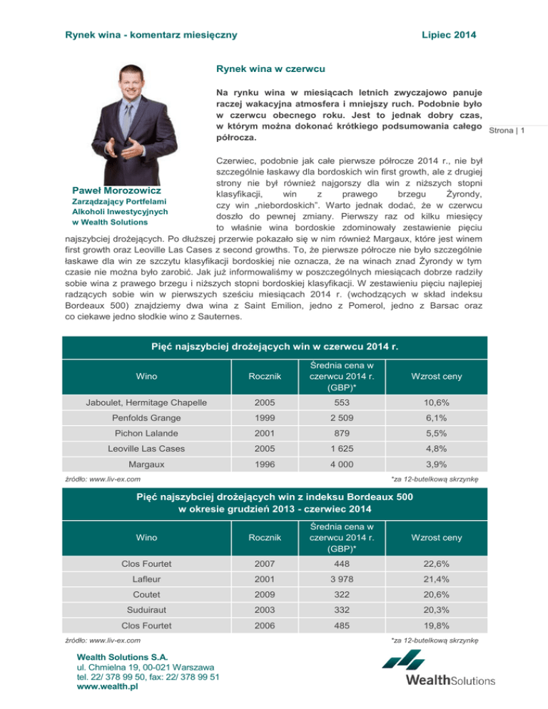 Rynek wina - komentarz miesięczny Lipiec 2014 Rynek wina w czerwcu Na rynku wina w miesiącach letnich zwyczajowo panuje raczej wakacyjna atmosfera i mniejszy ruch. Podobnie było w czerwcu obecnego roku. Jest to jednak dobry czas, w którym można dokonać krótkiego podsumowania całego Strona | 1 półrocza. Czerwiec, podobnie jak całe pierwsze półrocze 2014 r., nie był szczególnie łaskawy dla bordoskich win first growth, ale z drugiej strony nie był również najgorszy dla win z niższych stopni Paweł Morozowicz klasyfikacji, win z prawego brzegu Żyrondy, Zarządzający Portfelami czy win „niebordoskich”. Warto jednak dodać, że w czerwcu Alkoholi Inwestycyjnych doszło do pewnej zmiany. Pierwszy raz od kilku miesięcy w Wealth Solutions to właśnie wina bordoskie zdominowały zestawienie pięciu najszybciej drożejących. Po dłuższej przerwie pokazało się w nim również Margaux, które jest winem first growth oraz Leoville Las Cases z second growths. To, że pierwsze półrocze nie było szczególnie łaskawe dla win ze szczytu klasyfikacji bordoskiej nie oznacza, że na winach znad Żyrondy w tym czasie nie można było zarobić. Jak już informowaliśmy w poszczególnych miesiącach dobrze radziły sobie wina z prawego brzegu i niższych stopni bordoskiej klasyfikacji. W zestawieniu pięciu najlepiej radzących sobie win w pierwszych sześciu miesiącach 2014 r. (wchodzących w skład indeksu Bordeaux 500) znajdziemy dwa wina z Saint Emilion, jedno z Pomerol, jedno z Barsac oraz co ciekawe jedno słodkie wino z Sauternes. Pięć najszybciej drożejących win w czerwcu 2014 r. Wino Rocznik Średnia cena w czerwcu 2014 r. (GBP)* Wzrost ceny Jaboulet, Hermitage Chapelle 2005 553 10,6% Penfolds Grange 1999 2 509 6,1% Pichon Lalande 2001 879 5,5% Leoville Las Cases 2005 1 625 4,8% Margaux 1996 4 000 3,9% źródło: www.liv-ex.com *za 12-butelkową skrzynkę Pięć najszybciej drożejących win z indeksu Bordeaux 500 w okresie grudzień 2013 - czerwiec 2014 Wino Rocznik Średnia cena w czerwcu 2014 r. (GBP)* Wzrost ceny Clos Fourtet 2007 448 22,6% Lafleur 2001 3 978 21,4% Coutet 2009 322 20,6% Suduiraut 2003 332 20,3% Clos Fourtet 2006 485 19,8% źródło: www.liv-ex.com Wealth Solutions S.A. ul. Chmielna 19, 00-021 Warszawa tel. 22/ 378 99 50, fax: 22/ 378 99 51 www.wealth.pl *za 12-butelkową skrzynkę Rynek wina - komentarz miesięczny Lipiec 2014 Pamiętać jednak należy, że to bordoskie wina first growth - ze względu na konstrukcję indeksów Liv-ex – zaważają na ich wynikach. W związku z tym nie można się dziwić, że znów najmocniej na obecną sytuację zareagował Liv-ex 50, który gromadzi wyłącznie dziesięć różnych roczników pięciu win first growth. Najsłabiej spadki win ze szczytu bordoskiej klasyfikacji odbijają się z kolei na notowaniach indeksu Liv-ex 1000, w którym aż 500 win pochodzi spoza Bordeaux. Warto również dodać, że indeksy monitorujące ceny win Burgundzkich, z doliny Rodanu oraz Nowego Świata Strona | 2 zanotowały wzrost notowań na poziomie ok. 0,4 proc. Zmiany wartości indeksów Liv-ex w ciągu ostatniego miesiąca (stan na 30.06.2014 r.) Nazwa indeksu Zmiana miesięczna Liv-ex Fine Wine 50 -3,2% Liv-ex Fine Wine 100 -2,9% Liv-ex Bordeaux 500 -1,8% Liv-ex Fine Wine 1000 -0,9% źródło: www.liv-ex.com W miesiącach letnich, zwyczajowo mamy do czynienia z wyciszeniem rynkowym, z tej też przyczyny wszelkie operacje na portfelach polecamy rozważać w okresie od października do maja, gdy obroty na rynku fine wines są na wyższym poziomie. W czerwcu Bordeaux nadal oczywiście dominowało w obrotach na giełdzie w Londynie. W miesiącu tym 83,4 proc. transakcji zostało dokonanych na winach znad Żyrondy. Jest to najlepszy wynik od 11 miesięcy. Popyt na wina first growth okazał się stabilny i nie ulegał zasadniczej zmianie względem poprzedniego miesiąca, natomiast wzrósł popyt na wina produkowane poza tym regionem. Obroty na winach „niebordoskich” wzrosły w stosunku do maja o 8 proc., jednak były niższe aż o 14 proc. względem czerwca ubiegłego roku. Wśród win bordoskich tradycyjnie już dominowały trzy roczniki: z jednej strony duet wybitnych roczników 2009 i 2010 z drugiej najmłodszy fizycznie dostępny rocznik 2011, który w wypadku wielu win jest również najtańszym na rynku. W związku z obecną sytuacją rynkową warto pomyśleć o uzupełnieniu portfeli o starannie wybrane wina z innych regionów. Taka strategia pozwali korzystać z obecnej dobrej koniunktury wśród win produkowanych poza Bordeaux. Należy również śledzić zmiany cen win ze szczytu klasyfikacji 1855 - Premier Grand Cru Classe. Ich wycena obniżyła się bowiem znacznie w czasie korekty rynkowej, a obecnie niski poziom cenowy powinien w nadchodzącym czasie przełożyć się na wzrost zainteresowania tymi, prestiżowymi winami. Od kilkunastu tygodni widać na rynku wzrost popytu na Bordeaux z niższych stopni klasyfikacyjnych, co w perspektywie nadchodzących miesięcy skutkować powinno zwiększeniem ich wyceny. Okres starzenia win W związku z wieloma pytaniami otrzymywanymi od Państwa odnośnie maksymalnego czasu dojrzewania sklasyfikowanych win bordoskich, które znajdują się w Państwa portfelach inwestycyjnych, warto zaznaczyć, że wina te należą do najbardziej długowiecznych na świecie. Tradycja produkcji win sięga w tym regionie czasów rzymskich. Bordeaux zapewnia również idealne warunki dla uprawianych tam szczepów winorośli. Nie mniej ważny jest również proces produkcji wina oraz rocznik zbioru winogron użytych do produkcji. Wina bordoskie od wieków produkowane są w sposób umożliwiający ich długie dojrzewanie. Stosuję się wobec nich m.in. długą maturację w beczkach, która dla win Bordeaux trwa 18 miesięcy. Dodatkowo zbiory winogron są mocno ograniczane, a do kadzi trafiają tylko te idealnie dojrzałe i nieuszkodzone. Wealth Solutions S.A. ul. Chmielna 19, 00-021 Warsza