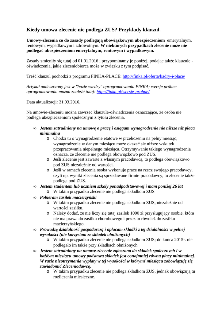 Kiedy umowa-zlecenie nie podlega ZUS? Przykłady klauzul. Umowy-zlecenia co do zasady podlegają obowiązkowym ubezpieczeniom emerytalnym, rentowym, wypadkowym i zdrowotnym. W niektórych przypadkach zlecenie może nie podlegać ubezpieczeniom emerytalnym, rentowym i wypadkowym. Zasady zmieniły się tutaj od 01.01.2016 i przypominamy je poniżej, podając także klauzule oświadczenia, jakie zleceniobiorca może w związku z tym podpisać. Treść klauzul pochodzi z programu FINKA-PŁACE: http://finka.pl/oferta/kadry-i-place/ Artykuł umieszczony jest w "bazie wiedzy" oprogramowania FINKA; wersje próbne oprogramowania można znaleźć tutaj: http://finka.pl/wersje-probne/ Data aktualizacji: 21.03.2016. Na umowie-zleceniu można zawrzeć klauzule-oświadczenia oznaczające, że osoba nie podlega ubezpieczeniom społecznym z tytułu zlecenia. • • • • • Jestem zatrudniony na umowę o pracę i osiągam wynagrodzenie nie niższe niż płaca minimalna o Chodzi tu o wynagrodzenie etatowe w przeliczeniu na pełny miesiąc; wynagrodzenie w danym miesiącu może okazać się niższe wskutek przepracowania niepełnego miesiąca. Otrzymywanie takiego wynagrodzenia oznacza, że zlecenie nie podlega obowiązkowo pod ZUS. o Jeśli zlecenie jest zawarte z własnym pracodawcą, to podlega obowiązkowo pod ZUS niezależnie od wartości. o Jeśli w ramach zlecenia osoba wykonuje pracę na rzecz swojego pracodawcy, czyli np. wyniki zlecenia są sprzedawane firmie-pracodawcy, to zlecenie także podlega pod ZUS. Jestem studentem lub uczniem szkoły ponadpodstawowej i mam poniżej 26 lat o W takim przypadku zlecenie nie podlega składkom ZUS Pobieram zasiłek macierzyński o W takim przypadku zlecenie nie podlega składkom ZUS, niezależnie od wartości zasiłku. o Należy dodać, że nie liczy się tutaj zasiłek 1000 zł przysługujący osobie, która nie ma prawa do zasiłku chorobowego i przez to również do zasiłku macierzyńskiego. Prowadzę działalność gospodarczą i opłacam składki z tej działalności w pełnej wysokości (nie korzystam ze składek obniżonych) o W takim przypadku zlecenie nie podlega składkom ZUS; do końca 2015r. nie podlegało im także przy składkach obniżonych Jestem zatrudniony na umowę-zlecenie zgłoszoną do składek społecznych i w każdym miesiącu umowy podstawa składek jest conajmniej równa płacy minimalnej. W razie nieotrzymania wypłaty w tej wysokości w którymś miesiącu zobowiązuję się zawiadomić Zleceniodawcę. o W takim przypadku zlecenie nie podlega składkom ZUS, jednak obowiązują tu rozliczenia miesięczne. o Jeśli zlecenie podlegające ZUS ma w którymś miesiącu podstawę niższą niż płaca minimalna, to drugie zlecenie podlega obowiązkowo składkom za ten miesiąc o Jeśli wypłata ze zlecenia podlegającego ZUS nastąpi w następnym miesiącu, to poprzedni miesiąc traktowany jest jak miesiąc bez wypłaty podlegającej ZUS. Wówczas druga umowa podlega pod ZUS za ten miesiąc, niezależnie od tego, kiedy nastąpi wypłata o Jeśli wypłata ze zlecenia podlegającego ZUS nastąpi po zakończeniu umowy (w innym miesiącu), to ZUS w ogóle jej nie liczy jako wynagrodzenia z tytułu zlecenia (stosuje sie tytuł ubezpieczenia "wypłata po zakończeniu umowy") o Jeśli dwa zlecenia rozpoczynają się w tym samym miesiącu w różnych dniach, to za dni, w których trwa tylko jedno zlecenie, podlega ono obowiązkowym składkom. Ten i poprzednie punkty wynikają z "poradnika" ogłoszonego przez ZUS w związku ze zmianami przepisów od 01.01.2016. Powyższe uwagi dotyczą ubezpieczeń społecznych, tj. emerytalnego, rentowego i wypadkowego. Zgłoszenie do chorobowego jest zawsze dobrowolne (można się zgłosić tylko jeśli zgłaszamy do emerytalnego). Natomiast składki zdrowotne od zlecenia są obowiązkowe niezależnie od tego, czy obowiązują pozostałe składki. Oprac. Krzysztof Piasecki, TIK-SOFT Sp. z o.o. na podstawie Dz.U. 1831 r. 2014 [wszedł w życie od 01.01.2016] http://dziennikustaw.gov.pl/du/2014/1831/1 oraz poradnika ZUS http://www.zus.pl/default.asp?p=1&id=5835 21.03.2016