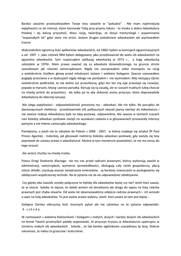Bardzo uważnie przestudiowałem Twoje tezy zawarte w "pobudce" . Nie mam najmniejszej wątpliwości co do intencji, które kierowały Tobą przy pisaniu tekstu - to troska o dobro Adwokatury Polskiej i Jej dalszą przyszłość. Masz rację, twierdząc, że dosyć martyrologii i wspominania "wspaniałych lat" gdyż stare nie wróci. Jestem drugim pokoleniem adwokackim ale wychowałem trzecie. Wykształciłem ogromną ilość aplikantów adwokackich, od 1982r byłem w komisjach egzaminacyjnych a od 1997 r. jako członek NRA byłem delegowany jako przedstawiciel do wielu izb adwokackich na egzaminy adwokackie. Sam rozpocząłem aplikację adwokacką w 1973 r., a togę adwokacką założyłem w 1976r. Mam prawo uważać się za adwokata doświadczonego na gruncie stricte zawodowym jak również samorządowym. Nigdy nie uzurpowałem sobie monopolu na rację a wielokrotnie chyliłem głowę przed młodszymi stażem i wiekiem Kolegami. Zawsze szanowałem poglądy przeciwne a w dyskusjach nigdy nikogo nie poniżyłem i nie wyśmiałem. Mój nieżyjący Ojciec wielokrotnie podkreślał, że nie wolno żyć przeszłością, gdyż ten kto nią żyje przestaje się rozwijać, popada w marazm, letarg i ponosi porażkę. Kieruję się tą zasadą, ale w czasach trudnych lubię chociaż na chwilę wrócić do przeszłości, ale tylko po to aby dokonać oceny przyczyn, które doprowadziły Adwokaturę do obecnej sytuacji. Nie ulega wątpliwości - odpowiedzialność ponosimy my - adwokaci. Ale nie tylko. Na początku lat dwutysięcznych niektórzy przedstawiciele elit politycznych okazali jawną niechęć do Adwokatury i nie zawsze reakcja Adwokatury była na taką postawę odpowiednia. Nie zawsze w tamtych czasach nasi Koledzy adwokaci posłowie stanęli na wysokości zadania a w głosowaniach przeważały interesy partyjne a nie interes samorządu adwokackiego. Pamiętamy, a jeżeli nie to odsyłam do Palestr z 2006 - 2007, w której znajduje się artykuł ŚP Pani Prezes Agackiej - Indeckiej, jak głosowali niektórzy Koledzy adwokaci posłowie, gdy ważyły się losy poprawek do ustawy prawo o adwokaturze. Można w tym momencie powiedzieć, że nie ma sensu do tego wracać. Ale wrócić choćby na chwilę trzeba. Pytasz Drogi Dziekanie dlaczego nie ma nas przed radcami prawnymi, którzy wykonują zawód w administracji, samorządach, wymiarze sprawiedliwości, obsługują cały rynek gospodarczy, płacą niższe składki, uzyskują wyższe świadczenia emerytalne, są bardziej nowocześni w posługiwaniu się zdobyczami współczesnej techniki. Na te pytania nie da sie odpowiedzieć obiektywnie. Czy gdyby oba zawody zostały połączone to byłoby dla adwokatów lepiej czy nie? Jeżeli ktoś uważa, że w istocie byłoby to lepsze, to daleki jestem od doradzania ale droga do wpisu na listę radców prawnych jest chyba otwarta. Od wielu lat obserwowaliśmy odejścia radców prawnych i ich wnioski o wpis na listę adwokatów. To jest wolne prawo wyboru. Jeżeli ktoś uważa że tam jest lepiej... Zadajesz Ziemku olbrzymią ilość słusznych pytań ale nie udzielasz na te pytania odpowiedzi. A s z k o d a. W rozmowach z wieloma Koleżankami i Kolegami z małych, dużych i bardzo dużych izb adwokackich na temat Twoich przemyśleń padały wypowiedzi, że przyczyn kryzysu w Adwokaturze upatrujesz w istnieniu małych izb adwokackich . Szkoda , że tak bardzo ogólnikowo uzasadniasz tę tezę. Dobrze natomiast, że robisz to grzecznie i kulturalnie. Znowu muszę na chwilę wrócić do przeszłości i zapytać Cię wprost. Gdzie był Dziekan Warszawie, gdy Jego Koledzy Adwokaci z Izby ORA w Warszawskiej w środkach masowego przekazu wypowiadali sie pogardliwie na temat małych izb, gdy padały słowa o izbach, które można pomieścić w dwóch autobusach, gdy padały słowa o prowincjonalnej konserwie? Czemu wtedy nie zawołałeś donośnie STOP POBUDKA. Takimi słowami operować nie można. Nie usprawiedliwiajmy wszystkiego słowem demokracja, gdyż demokracja nie pozwala na poniżanie tych Kolegów adwokatów, którzy mają odmienne poglądy i którzy wykonują zawód adwokata w małych izbach. Jeżeli przyszły klient przeczyta zwrot "prowincjonalna konserwa" to jaki będzie jego stosunek do adwokatów z małych izb . A może wówczas o to chodziło? Nie słyszałem Twojego protestu. Pamiętaj, że z małych izb adwokackich wywodzi się wielu wspaniałych Kolegów, którzy znaczą część swojego życia zawodowego poświęciło sprawom samorządu i to bez reszty. Wymienię kilka nazwisk ŚP adw. dr Henryk Szczurek, Dziekan Feliks Sadownik, Dziekan Andrzej Siemiński, Dziekan Leon Kasperski, Dziekan Grzegorz Janisławski, ŚP Dziekan Zbigniew Kaczmarek i wiele innych osób, które przepraszam, że też ich nie wymieniłem. Szacunek i chwała Im za trud i pracę. Osoby te pięknie potrafiły współpracować z przedstawicielami wielkich izb i tej największej - Izby Warszawskiej. I nie ważne było czy adwokat pochodzi z małej czy dużej izby - zawsze ważnym było kto jest jakim człowiekiem, co chce zrobić i faktycznie robi dla samorządu. Tak mnie uczył mój Wielki Patron Mecenas Stanisław Ochocki szef sądownictwa AK – Okręg Wileński. Taką naukę pobrałem od Pana Prezesa Macieja Bednarkiewicza i Pana Prezesa Czesława Jaworskiego, których osobowość, praca i oddanie dla Adwokatury zapisuję złotymi literami w historii adwokatury. Pan Prezes Czesław Jaworski wielokrotnie podkreślał swój związek z małą izbą, gdyż właśnie w izbie olsztyńskiej rozpoczynał aplikacje adwokacką. Jego piękny i ciepły list skierowany do Izby Adwokackiej w Olsztynie z okazji jej 60-lecia został umieszczony w kronice i odczytany na szkoleniach aplikantom adwokackim. Ziemku Drogi. W czasach trudnych zawsze odwoływaliśmy się do mądrości uchwał Krajowego Zjazdu Adwokatury. Przypomnij wyniki głosowań na temat likwidacji małych izb adwokackich i fuzji obu zawodów. A czy pamiętasz jakie by