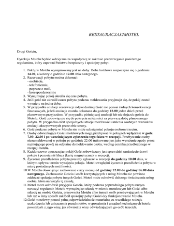 RESTAURACJA32MOTEL Drogi Gościu, Dyrekcja Motelu będzie wdzięczna za współpracę w zakresie przestrzegania poniższego regulaminu, który zapewni Państwu bezpieczny i spokojny pobyt. 1. Pokój w Motelu wynajmowany jest na doby. Doba hotelowa rozpoczyna się o godzinie 14.00, a kończy o godzinie 12.00 dnia następnego. 2. Rezerwacji pobytu można dokonać: - osobiście, - telefonicznie, - poprzez e-mail, - korespondencyjnie 3. Wynajmując pokój określa się czas pobytu. 4. Jeśli gość nie okreslił czasu pobytu podczas meldowania przyjmuje się, że pokój został wynajęty na jedną dobę. 5. W przypadku anulacji rezerwacji indywidualnej Gość nie ponosi żadnych konsekwencji finansowych, jeżeli anulacja została dokonana do godziny 18.00 jeden dzień przed planowanym przyjazdem. W przypadku późniejszej anulacji lub nie dojazdu gościa do Motelu, Gość zobowiązuje się do pokrycia należności za pierwszą dobę planowanego pobytu. W przypadku ofert specjalnych istnieje możliwość ustalenia osobnych warunków anulacji akceptowanych przez obie strony. 6. Gość podczas pobytu w Motelu nie może udostępniać pokoju osobom trzecim. 7. Osoby odwiedzające Gości motelowych mogą przebywać w pokojach wyłącznie w godz. 7.00–22.00 i po wcześniejszym zgłoszeniu tego faktu w recepcji. Przebywanie osoby niezameldowanej w pokoju po godzinie 22:00 traktowane jest jako wyrażenie zgody przez najmującego pokój na odpłatne domeldowanie osoby, według cennika przedłożonego w recepcji hotelu. 8. Każdorazowo opuszczając pokój Gość zobowiązany jest sprawdzić zamknięcie drzwi pokoju i pozostawić klucz (kartę magnetyczną) w recepcji. 9. Życzenie przedłużenia pobytu prosimy zgłaszać w recepcji do godziny 10.00 dnia, w którym upływa termin wynajęcia pokoju. Motel uwzględni życzenie przedłużenia pobytu w miarę posiadanych możliwości. 10.W Motelu obowiązuje zachowanie ciszy nocnej od godziny 22.00 do godziny 06.00 dnia następnego. Zachowanie Gościa i osób korzystających z usług Motelu nie powinno zakłócać spokoju pobytu innych Gości. Motel może odmówić dalszego świadczenia usług osobie, która naruszyła tę zasadę. 11.Motel może odmówić przyjęcia Gościa, który podczas poprzedniego pobytu rażąco naruszył regulamin Motelu wyrządzając szkodę w mieniu motelowym lub Gości albo szkodę na osobie Gościa, pracownika Motelu albo innych osób przebywających w Motelu lub też w inny sposób zakłócił spokojny pobyt Gości czy funkcjonowanie Motelu. 12.Gość motelowy ponosi pełną odpowiedzialność materialną za wszelkiego rodzaju uszkodzenia lub zniszczenia przedmiotów, wyposażenia i urządzeń technicznych hotelu powstałych z jego winy, jak również z winy odwiedzających go osób trzecich. 13.Motel bezzwłocznie reaguje na zgłaszane uwagi i zastrzeżenia dotyczące poziomu usług, funkcjonowania urządzeń oraz czystości i porządku w Motelu przez podjęcie czynności, mających na celu natychmiastowe usunięcie usterek i braków. 14.Odpowiedzialność Motelu za utratę lub uszkodzenie pieniędzy, papierów wartościowych, kosztowności albo przedmiotów mających wartość naukową lub artystyczną jest ograniczona, jeżeli przedmioty te nie zostały oddane za pisemnym potwierdzeniem na przechowanie do depozytu w recepcji. W przypadku utraty lub uszkodzenia przedmiotów, o których mowa powyżej, (nie oddanych za pokwitowaniem na przechowanie do depozytu w recepcji) odszkodowanie nie przekracza sumy ustalonej zgodnie z zapisami art. 846 – 851 Ustawy z dnia 23 kwietnia 1964 roku – Kodeks Cywilny. 15.Przedmioty pozostawione w pokojach przez wyjeżdżających Gości będą wysyłane (na koszt odbiorcy) na wskazany przez Gościa wcześniej adres. W przypadku braku takiej dyspozycji Motel zabezpieczy i przechowa te przedmioty przez okres 2 miesięcy. 16.Motel posiada strzeżony i monitorowany 24 H parking dla samochodów osobowych, ciężarowych oraz autokarów. 17.Motel zobowiązany jest: - zapewnić profesjonalną i uprzejmą obsługę w zakresie wszelkich spraw dotyczących Motelu, - zapewnić sprzątanie pokoju i wykonywanie napraw urządzeń podczas nieobecności Gościa, a w jego obecności tylko wówczas, gdy Gość wyrazi takie życzenie, - zapewnić warunki do spokojnego i bezpiecznego pobytu Gościa, - zachować tajemnicę informacji o Gościu. 18.Na życzenie Gościa Motel świadczy nieodpłatnie następujące usługi: - budzenie o wyznaczonej przez Gościa godzinie, - wezwanie lekarza w nagłych przypadkach, apteczka, - przechowanie bagażu w dniu wyjazdu Gościa, - udzielanie wszelkich, niezbędnych informacji. 19.Ze względu na wymagania ochrony przeciwpożarowej zabrania się: - używania w pokojach grzałek elektrycznych, żelazek elektrycznych i innych podobnych urządzeń nie stanowiących wyposażenia Motelu. 20.W pokojach motelowych obowiązuje całkowity zakaz palenia. 21.Za zagubienie klucza (karty do pokoju) opłata wynosi 15 PLN. Życzymy miłego pobytu w Restauracji32Motel Object 1
