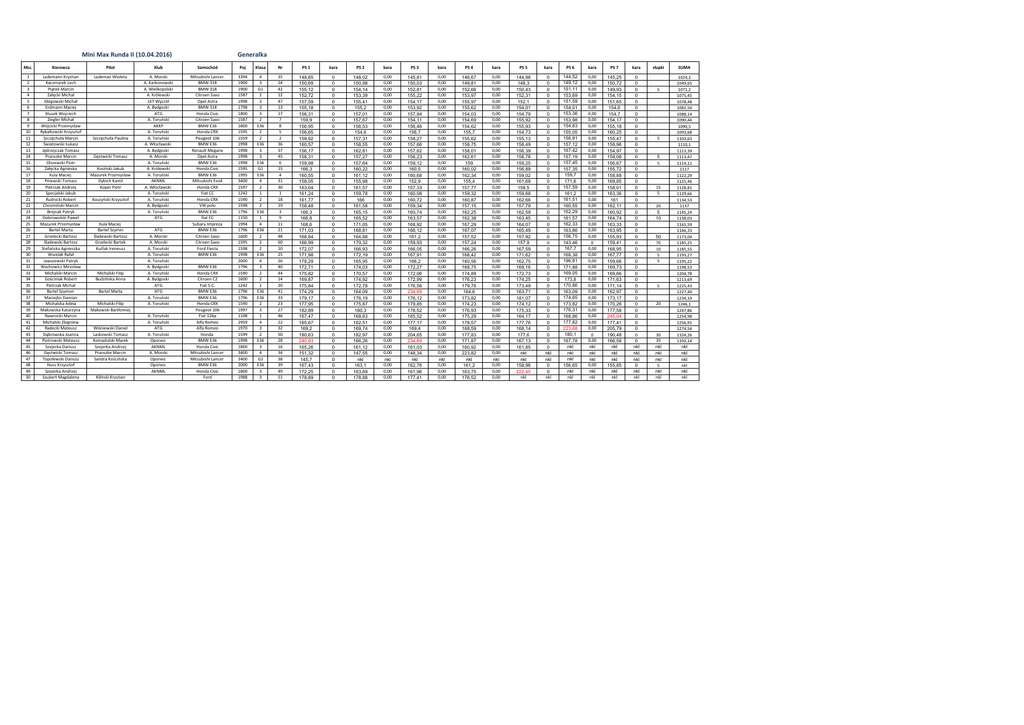 Mini Max Runda II (10.04.2016) Generalka Msc. Kierowca Pilot Klub Samochód Poj Klasa Nr PS 1 kara PS 2 kara PS 3 kara PS 4 kara PS 5 kara PS 6 kara PS 7 kara 1 2 3 4 5 6 7 8 9 10 11 12 13 14 15 16 17 18 19 20 21 22 23 24 25 26 27 28 29 30 31 32 33 34 35 36 37 38 39 40 41 42 43 44 45 46 47 48 49 50 Lademann Krystian Kaczmarek Lech Piątek Marcin Załęcki Michał Głogowski Michał Erdmann Maciej Klusek Wojciech Ziegler Michał Wójcicki Przemysław Rybałtowski Krzysztof Szczęchuła Marcin Światowski Łukasz Jędrzejczak Tomasz Pranszke Marcin Olszewski Piotr Załęcka Agnieska Kula Maciej Pniewski Tomasz Pietrzak Andrzej Specjalski Jakub Rudnicki Robert Chromiński Marcin Brejnak Patryk Dobrowolski Paweł Mazurek Przemysław Bartel Marta Grzelecki Bartosz Sladewski Bartosz Stefańska Agnieszka Wszelak Rafał Jawszewski Patryk Wachowicz Mirosław Michalski Marcin Gościniak Robert Pietrzak Michał Bartel Szymon Maciejko Damian Michalska Adela Makowska Katarzyna Nawrocki Marcin Michalski Zbigniew Radecki Mateusz Dąbrowska Joanna Piotrowski Mateusz Szejerka Dariusz Gęstwicki Tomasz Topolewski Dariusz Huss Krzysztof Szejerka Andrzej Szubert Magdalena Lademan Wioleta A. Morski A. Karkonowski A. Wielkopolski A. Królewski LKT Wyczół A. Bydgoski ATG A. Toruński AKKP A. Toruński A. Toruński A. Włocławski A. Bydgoski A. Morski A. Toruński A. Królewski A. Toruński AKNML A. Włocławski A. Toruński A. Toruński A. Bydgoski A. Toruński ATG Mitsubishi Lancer BMW 318 BMW 318 Citroen Saxo Opel Astra BMW 318 Honda Civic Citroen Saxo BMW E36 Honda CRX Peugeot 106 BMW E36 Renault Megane Opel Astra BMW E36 Honda Civic BMW E36 Mitsubishi Evo4 Honda CRX Fiat CC Honda CRX VW polo BMW E36 fiat CC Subaru Impreza BMW E36 Citroen Saxo Citroen Saxo Ford Fiesta BMW E36 3394 1900 1900 1587 1998 1798 1800 1587 1800 1595 1559 1998 1998 1998 1998 1595 1995 3400 1597 1242 1590 1598 1796 1150 1994 1796 1600 1595 1598 1998 2000 1796 1590 1600 1242 1796 1796 1590 1997 1108 2959 1970 1599 1998 1800 3400 3400 2000 1800 1988 4 3 G1 2 3 3 3 2 E36 2 2 E36 3 3 E36 G1 E36 4 2 1 2 2 E36 1 4 E36 2 2 2 E36 4 3 2 2 1 E36 E36 2 3 1 4 3 2 E36 3 4 G2 E36 3 3 35 24 42 12 47 13 17 7 8 5 2 36 37 45 6 15 4 31 30 1 18 19 3 9 11 21 48 60 10 25 26 40 44 14 20 41 33 23 27 46 22 32 50 28 16 34 38 39 49 51 148,85 150,69 155,12 152,72 157,59 155,18 156,31 159,9 156,95 156,65 159,92 160,57 156,17 158,31 159,98 166,3 160,55 158,05 163,04 161,24 161,77 158,48 166,3 166,8 168,6 171,03 168,84 166,99 172,07 171,98 178,29 172,71 175,82 169,87 175,84 174,29 179,17 177,95 182,89 167,47 185,67 169,2 180,63 240,83 165,26 151,32 145,7 167,43 172,25 178,89 0 0 0 0 0 0 0 0 0 0 0 0 0 0 0 0 0 0 0 0 0 0 0 0 0 0 0 0 0 0 0 0 0 0 0 0 0 0 0 0 0 0 0 0 0 0 0 0 0 0 148,02 150,98 154,14 153,39 155,41 155,2 157,01 157,67 156,53 154,6 157,31 158,55 162,81 157,27 157,64 160,22 161,12 155,98 161,57 159,78 166 161,58 165,15 165,52 171,05 168,81 164,88 170,32 166,93 172,19 165,95 174,03 170,57 174,92 172,78 164,09 176,19 175,87 180,3 168,63 182,51 169,74 182,97 166,26 161,12 147,55 nkl 163,1 163,69 178,88 0,00 0,00 0,00 0,00 0,00 0,00 0,00 0,00 0,00 0,00 0,00 0,00 0,00 0,00 0,00 0,00 0,00 0,00 0,00 0,00 0,00 0,00 0,00 0,00 0,00 0,00 0,00 0,00 0,00 0,00 0,00 0,00 0,00 0,00 0,00 0,00 0,00 0,00 0,00 0,00 0,00 0,00 0,00 0,00 0,00 0,00 nkl 0,00 0,00 0,00 145,81 150,03 152,81 155,22 154,17 153,92 157,94 154,11 156,46 156,7 158,27 157,66 157,62 156,23 159,12 160,5 160,68 152,9 157,33 160,08 160,72 159,34 160,74 163,57 168,92 166,12 161,2 159,93 166,05 167,91 166,2 172,27 172,06 172,99 176,56 234,69 176,12 179,85 178,52 165,52 177,17 169,4 204,65 234,69 161,03 148,34 nkl 162,76 161,96 177,41 0,00 0,00 0,00 0,00 0,00 0,00 0,00 0,00 0,00 0,00 0,00 0,00 0,00 0,00 0,00 0,00 0,00 0,00 0,00 0,00 0,00 0,00 0,00 0,00 0,00 0,00 0,00 0,00 0,00 0,00 0,00 0,00 0,00 0,00 0,00 0,00 0,00 0,00 0,00 0,00 0,00 0,00 0,00 0,00 0,00 0,00 nkl 0,00 0,00 0,00 146,67 149,81 152,66 153,97 155,97 155,62 154,03 154,69 154,62 155,7 155,62 158,75 158,01 162,61 159 160,02 162,34 155,4 157,77 159,32 160,87 157,15 162,25 162,38 167,29 167,07 157,52 157,24 166,26 168,42 160,56 168,75 174,89 176,23 179,76 164,6 173,82 174,23 176,93 175,29 178,57 168,59 177,83 171,87 160,92 223,82 nkl 161,2 163,75 176,52 0,00 0,00 0,00 0,00 0,00 0,00 0,00 0,00 0,00 0,00 0,00 0,00 0,00 0,00 0,00 0,00 0,00 0,00 0,00 0,00 0,00 0,00 0,00 0,00 0,00 0,00 0,00 0,00 0,00 0,00 0,00 0,00 0,00 0,00 0,00 0,00 0,00 0,00 0,00 0,00 0,00 0,00 0,00 0,00 0,00 0,00 nkl 0,00 0,00 0,00 144,98 148,3 150,43 152,31 152,1 154,01 154,79 155,92 155,93 154,73 155,13 158,49 156,39 158,78 159,25 156,89 159,02 161,68 158,5 159,68 162,66 157,79 162,59 163,45 164,07 165,49 157,92 157,9 167,59 171,62 162,75 169,16 172,73 174,25 173,49 163,71 181,07 174,12 175,33 164,17 177,76 168,14 177,6 167,13 161,85 nkl nkl 158,96 222,45 nkl 0 0 0 0 0 0 0 0 0 0 0 0 0 0 0 0 0 0 0 0 0 0 0 0 0 0 0 0 0 0 0 0 0 0 0 0 0 0 0 0 0 0 0 0 0 nkl nkl 0 0 nkl 144,52 149,12 151,11 153,69 151,59 154,01 153,36 153,98 154,83 155,05 156,91 157,12 167,42 157,19 157,45 157,35 159,7 171,6 157,59 161,2 161,51 160,55 162,29 161,57 162,33 163,86 156,75 143,46 167,7 168,38 196,81 171,88 169,05 173,8 170,86 163,09 174,65 173,82 176,31 168,86 177,82 223,68 180,1 167,78 nkl nkl nkl 156,65 nkl nkl 0,00 0,00 0,00 0,00 0,00 0,00 0,00 0,00 0,00 0,00 0,00 0,00 0,00 0,00 0,00 0,00 0,00 0,00 0,00 0,00 0,00 0,00 0,00 0,00 0,00 0,00 0,00 0 0,00 0,00 0,00 0,00 0,00 0,00 0,00 0,00 0,00 0,00 0,00 0,00 0,00 0,00 0 0,00 nkl nkl nkl 0,00 nkl nkl 145,25 150,72 149,93 154,15 151,65 154,6 154,7 154,17 155,18 160,25 155,47 158,96 154,97 158,08 156,67 155,72 158,88 169,85 158,01 163,36 161 162,11 160,92 164,74 163,33 163,95 155,93 159,41 168,95 167,77 159,66 169,73 169,66 171,63 171,14 162,97 173,17 170,26 177,58 245,04 177,41 205,79 190,48 166,58 nkl nkl nkl 155,85 nkl nkl 0 0 0 0 0 0 0 0 0 0 0 0 0 0 0 0 0 0 0 0 0 0 0 0 0 0 0 0 0 0 0 0 0 0 0 0 0 0 0 0 0 0 0 0 nkl nkl nkl 0 nkl nkl Szczęchuła Paulina Gęstwicki T