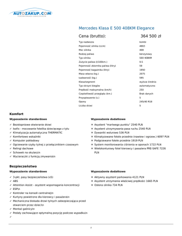 Mercedes Klasa E 500 408KM Elegance Cena (brutto): 364 500 zł Typ nadwozia kombi Pojemność silnika (ccm) 4663 Moc silnika 408 Rodzaj paliwa benzynowy Typ silnika 500 408KM Zużycie paliwa (l/100km.) 9.5 Pojemność zbiornika paliwa (litry) 59 Pojemność bagażnika (litry) 1950 Masa własna (kg.) 2075 Ładowność (kg.) 595 Klasa/segment wyższa średnia Typ skrzyni biegów automatyczna Prędkość maksymalna (km/h) 250 Częstotliwość przeglądu (km.) Brak danych Przyspieszenie (s.) 5 Opony 245/40 R18 Liczba drzwi 5 Komfort Wyposażenie standardowe Wyposażenie dodatkowe ✓ Bezstopniowe otwieranie drzwi ✕ Asystent "martwego punktu" 2540 PLN ✓ Isofix - mocowanie fotelika dziecięcego z tyłu ✕ Asystent utrzymywania pasa ruchu 2540 PLN ✓ Klimatyzacja automatyczna THERMATIC ✕ Dywaniki welurowe 536 PLN ✓ Komfortowe wskaźniki ✕ Klimatyzowane fotele przednie (nawiew i ogrzew.) 6097 PLN ✓ Komputer pokładowy ✕ Podgrzewane fotele przednie 1919 PLN ✓ Ogrzewanie szyby tylnej z przełącznikiem czasowym ✕ System monitorowania ciśnienia w oponach 1722 PLN ✓ Relingi dachowe ✕ Wielokonturowy fotel kierowcy i pasażera PRE-SAFE 7226 ✓ Schowek na okulary\n PLN ✓ Wycieraczki z funkcją zmywania\n Bezpieczeństwo Wyposażenie standardowe Wyposażenie dodatkowe ✓ 3-pkt. pasy bezpieczeństwa (x5) ✕ Aktywny asystent parkowania 4121 PLN ✓ ABS ✕ Asystent utrzymania właściwej prędkości 1665 PLN ✓ Attention Assist - asystent wspomagania koncentracji ✕ Osłona silnika 734 PLN ✓ ESP\n ✓ Kontroler na konsoli centralnej\n ✓ Kurtyny powietrzne dla kierowcy i pasażera\n ✓ Mechaniczna blokada drzwi tylnych zabezpieczająca przed otwarciem przez dzieci\n ✓ Montaż gaśnicy\n ✓ Pedały zachowujące optymalną pozycję podczas wypadku\n ✓ 1 PRE-SAFE\n 2 ✓ System wspomagający gwałtowne hamowanie (BAS)\n ✓ Trójkąt ostrzegawczy\n ✓ Tylne światła przeciwmgłowe\n ✓ Układ antypoślizgowy (ASR)\n ✓ Wzmocnienia boczne\n ✓ Zabezpieczenie wnętrza pojazdu\n Dodatki Wyposażenie standardowe Wyposażenie dodatkowe ✓ 4-lamelowa osłona chłodnicy w kolorze srebrnym ✕ Aktywny asystent utrzymania pasa ruchu 2540 PLN ✓ 4-ramienne, wielofunkcyjne koło kierownicy ✕ Becker Map Pilot 4912 PLN ✓ 5 zagłówków indywidualnie regulowanych ✕ Becker Map Pilot - przygotowanie 1919 PLN ✓ ADAPTIVE BRAKE z funkcją HOLD ✕ COMAND Online 14961 PLN ✓ AIRMATIC ✕ COMAND Online ze zmieniarką DVD 16654 PLN ✓ Alarm antywłamaniowy (EDW) ✕ Dach szklany 6351 PLN ✓ Apteczka ✕ EASY-PACK - system do mocowania bagażu 1665 PLN ✓ Asystent świateł przednich ✕ Górna część deski rozdzielczej obszyta skórą ARTICO 3387 PLN ✓ Audio 20 CD ✕ Hak holowniczy z funkcją stabilizacji ESP 5024 PLN ✓ Automatyczna skrzynia biegów (7) ✕ ILS - Dynamiczne reflektory w technologii LED 8186 PLN ✓ Bezpośredni wtrysk paliwa ✕ InCar Hotspot - router Wi-Fi 2823 PLN ✓ Centralny zamek z blokadą od wewnątrz ✕ Kamera 360° 3952 PLN ✓ DIRECT CONTROL - podwozie ✕ Kamera cofania 2258 PLN ✓ DIRECT SELECT Elektroniczna regulacja ✕ KEYLESS-GO 5024 PLN ✓ display with TFT technology ✕ Kierownica w drewnie i skórze 3331 PLN ✓ Dzwignia zmiany begów DIRECT SELECT ✕ Ogrzewanie postojowe 7743 PLN ✓ EASY-PACK Rear sill protector ✕ Opony zimowe (zamiast letnich) 1101 PLN ✓ Elektryczne sterowanie szyb (x4) ✕ Panoramiczny dach szklany 9992 PLN ✓ Fully electrically adjustable front seats ✕ Pilot radioodtwarzacza lub systemu COMAND 677 PLN ✓ Hamulec postojowy ✕ Podgrzewane dysze spryskiwaczy szyby przedniej 960 PLN ✓ Immobilizer ✕ podsufitka designo DINAMICA w kolorze beżu makadamii ✓ Koło dojazdowe (minispare) ✕ podsufitka designo DINAMICA w kolorze szarości alpaki 9033 ✓ Lusterka zewnętrzne podgrzewane i elek. regulowane ✕ Podświetlane listwy progowe w przednich drzwiach 3218 PLN ✓ Map pockets ✕ Podwójny uchwyt na kubek 367 PLN ✓ Mechaniczna regulacja kierownicy w pionie ✕ Pogrzewane fotele tylne 1919 PLN ✓ Mocowanie bagażu - 6 uchwytów ✕ Popielniczka 254 PLN ✓ Mocowanie ładunku w przestrzeni bagażowej ✕ Poprzeczki do mocowania bagażników dachowych 960 PLN ✓ Obrotomierz ✕ Przyciemniane tylne szyby 2202 PLN ✓ Oświetlenie dolnej przestrzeni wnętrza ✕ Przygotowanie do montażu telefonu komórkowego 2202 PLN ✓ Oświetlenie przy wysiadaniu i św. odblaskowe ✕ Radio Audio 20 ze zmieniarką 1694 PLN ✓ Oświetlenie wnętrza Ambiente z regul. natężenia ✕ SPLITVIEW 5645 PLN ✓ Ozdobna listwa przyokienna, czarny, z połyskiem ✕ Sportowa kierownica z elementami dekoracyjnymi 3331 PLN ✓ Pakiet zabezpieczenia pojazdu ✕ System automatycznego regulowania świateł drogowych 565 9033 PLN PLN PLN ✓ Poduszka powietrzna chroniąca kolana ✕ System dźwiękowy Harman/Kardon Logic7 4742 PLN ✓ 3 Poduszka powietrzna kierowcy i pasażera ✕ 4 System multimedialny z tyłu pojazdu 11009 PLN 5 ✓ Podłokietnik ze schowkiem ✕ System multimedialny z tyłu pojazdu z ekranem 4742 PLN ✓ Power steering ✕ System nagłaśniający Bang & Olufsen BeoSound AMG ✓ Przyciemniane światła tylne i 3. światło stopu ✕ System rozpoznawania fotelika dziecięcego (AKSE) 282 PLN ✓ Reflektory bazujące na technologii LED ✕ Wielofunkcyjne podgrzewane koło kierownicy 1468 PLN ✓ Regulacja położenia reflektorów ✕ Worek na narty 1073 PLN ✓ Schowek w podłokietniku ✕ Zdalne otwieranie drzwi garażowych 1270 PLN ✓ Schowki pod przednimi fotelami ✕ Zintegrowane foteliki dziecięce (tylna kanapa) 1553 PLN ✓ Sidebag ✕ Złącze multimedialne 1242 PLN 23429 PLN ✓ Składane oparcie tylnej kanapy\n ✓ Stalowe listwy progowe\n ✓ Sterowana elektrycznie roleta szyby tylnej\n ✓ Sun visors\n ✓ Światła do czytania w lusterku\n ✓ Sygnał ostrzeg. przy zaciągniętym ham. postojowym\n ✓ System aktywnego serwisowania pojazdu - Assyst\n ✓ System ostrzegający o spadku ciśnien