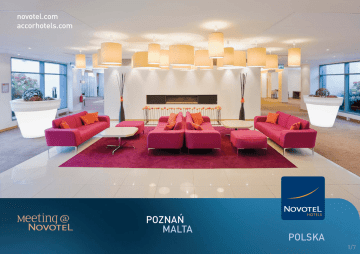 novotel.com accorhotels.com POZNAŃ MALTA POLSKA 1/7 PROFESJONALNE SPOTKANIA W HOTELU NOVOTEL POZNAŃ MALTA NOVOTEL POZNAŃ MALTA położony jest w pobliżu centrum miasta, w pięknym parku nad jeziorem Malta, w sąsiedztwie Aquaparku Termy Maltańskie, wśród miejskich terenów spacerowych. Dzięki otoczeniu zieleni i nowoczesnemu, komfortowemu wyposażeniu hotelu połączycie Państwo pracę z prawdziwym wypoczynkiem. KOMFORT SZYTY NA MIARĘ Przestronny i komfortowy pokój hotelu Novotel Poznań Malta został zaprojektowany tak, aby zgodnie z Państwa potrzebami i niezależnie od celu Państwa pobytu, połączyć możliwość relaksu (wygodna kanapa, minibar, TV satelitarna z bezpłatnym Canal+) z pracą (bezpłatne łącze WiFi, duże wygodne biurko). 2/7 Wyposażenie sal konferencyjnych w hotelu NOVOTEL POZNAŃ MALTA Novotel PoznaŃ Malta dysponuje 4 salami konferencyjnymi mogącymi pomieścić do 250 osób, w których istnieje możliwość zorganizowania konferencji, bankietów, spotkań handlowych. • W szystkie sale są klimatyzowane, wyposażone w nowoczesny sprzęt audiowizualny oraz mają dostęp światła dziennego. • W cenę sal wliczone jest wyposażenie: ekran elektryczny, flipchart, projektor multimedialny, telewizor, DVD, nagłośnienie, mikrofony bezprzewodowe. • G oście konferencyjni mogą także bezpłatnie korzystać z bezprzewodowego Internetu WiFi we wszystkich salach. Malta Olimpia Warta Posnania O+W+P 50 m2 70 m2 70 m2 70 m2 200 m2 Światło naturalne tak tak tak tak tak Klimatyzacja tak tak tak tak tak Połączenie WiFi tak tak tak tak tak Internet przewodowy tak tak tak tak tak Gniazda zasilające tak tak tak tak tak Wymiary Sale konferencyjne w hotelu NOVOTEL POZNAŃ MALTA Liczba osób światło naturalne wymiary w m² • N a potrzeby kameralnych spotkań do dyspozycji są 2 pokoje konferencyjne. Układ teatralny Malta tak 50 40 20 20 Olimpia tak 70 70 40 30 32 50 Warta tak 70 70 40 30 32 50 Posnania tak 70 70 40 30 32 50 O+W+P tak 200 250 120 100 100 150 Nazwa sali Układ szkolny Układ w kształcie litery U Układ konferencyjny Przyjęcie na stojąco 30 3/7 PLAN POWIERZCHNI KONFERENCYJNEJ 4/7 RESTAURACJA Z WIDOKIEM NA OGRÓD Z apr as z amy do nas zej restaur acji na dania kuchni międzynarodowej i polskiej, z dodatkowym akcentem na potraw y regionalne. Wiosną i latem otwieramy taras w ogrodzie nad basenem, gdzie wśród zieleni można delektować się daniami serwowanymi przez naszego szefa kuchni. Istnieje możliwość wykorzystania tarasu do organizacji spotkań (np. przy grillu). Na filiżankę aromatycznej kawy czy jeden z pysznych deserów, jak Crème brûlée bądź czekoladowy Brownie, zaprasza Cafe Bar. 5/7 CZAS NA UCIECZKĘ • Strefa Relaksu Uczestnicy organizowanych przez Państwa spotkań i konferencji mogą skorzystać ze studia fitness, wypożyczyć rowery na przejażdżkę po okolicy, a w okresie letnim skorzystać z odkrytego basenu w ogrodzie hotelowym. • Zwiedzanie lub zajęcia poza hotelem Poznań, tętniąca życiem metropolia, oferuje przyjezdnym mnóstwo atrakcji – zabytki, muzea, galerie, teatry, puby i wiele innych... Możemy pomóc Państwu w organizacji imprez poza hotelem: zwiedzanie miasta, gra w kręgle, bilety do kina czy teatru. 6/7 - na stronie novotel.com/meetings możecie Państwo samodzielnie zorganizować spotkanie i dokonać rezerwacji on-line - kontakt do Działu Konferencji iBankietówwhotelu: tel.:+48616543103 tel.:+48616543191 tel.:+48616543192 NOVOTEL POZNAŃ MALTA ul. Termalna 5 61-028Poznań,Poland tel.:+48616543100 fax:+48616543195 e-mail:[email protected] Ponad 400 hoteli na świecie Rezerwacja: novotel.com accorhotels.com 7/7