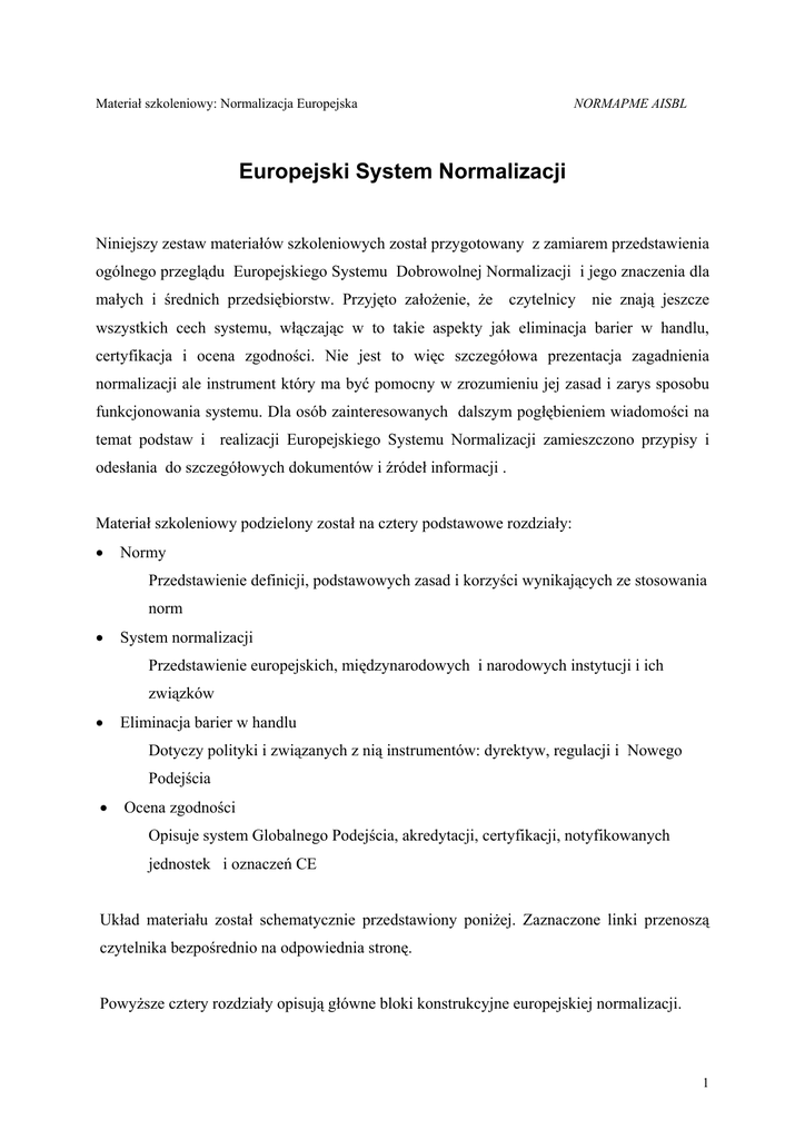 Materiał szkoleniowy: Normalizacja Europejska NORMAPME AISBL Europejski System Normalizacji Niniejszy zestaw materiałów szkoleniowych został przygotowany z zamiarem przedstawienia ogólnego przeglądu Europejskiego Systemu Dobrowolnej Normalizacji i jego znaczenia dla małych i średnich przedsiębiorstw. Przyjęto założenie, że czytelnicy nie znają jeszcze wszystkich cech systemu, włączając w to takie aspekty jak eliminacja barier w handlu, certyfikacja i ocena zgodności. Nie jest to więc szczegółowa prezentacja zagadnienia normalizacji ale instrument który ma być pomocny w zrozumieniu jej zasad i zarys sposobu funkcjonowania systemu. Dla osób zainteresowanych dalszym pogłębieniem wiadomości na temat podstaw i realizacji Europejskiego Systemu Normalizacji zamieszczono przypisy i odesłania do szczegółowych dokumentów i źródeł informacji . Materiał szkoleniowy podzielony został na cztery podstawowe rozdziały: • Normy Przedstawienie definicji, podstawowych zasad i korzyści wynikających ze stosowania norm • System normalizacji Przedstawienie europejskich, międzynarodowych i narodowych instytucji i ich związków • Eliminacja barier w handlu Dotyczy polityki i związanych z nią instrumentów: dyrektyw, regulacji i Nowego Podejścia • Ocena zgodności Opisuje system Globalnego Podejścia, akredytacji, certyfikacji, notyfikowanych jednostek i oznaczeń CE Układ materiału został schematycznie przedstawiony poniżej. Zaznaczone linki przenoszą czytelnika bezpośrednio na odpowiednia stronę. Powyższe cztery rozdziały opisują główne bloki konstrukcyjne europejskiej normalizacji. 1 System normalizacji jest siecią instytucji tworzących normy oraz reguł określających ich wzajemne stosunki. Rozdział o eliminacji barier w handlu przedstawia dyrektywy i rozporządzenia Unii Europejskiej stanowiące inny podstawowy element normalizacji europejskiej. Ich funkcją jest zagwarantowanie elementarnego bezpieczeństwa i respektowania interesu publicznego w odniesieniu do produktów i usług, a także swobodnego przepływu produktów i usług wewnątrz Unii Europejskiej. Nowe Podejście jest zreformowanym systemem przyjmowania dyrektyw określających tylko najbardziej zasadnicze z punktu widzenia interesu publicznego wymagania w odniesieniu do produktów i usług. Są one dopuszczane do swobodnego obrotu na terenie Unii Europejskiej jeśli spełniają te wymogi. Dyrektywy Nowego Podejścia odnoszą się do norm określających szczegółowe wymagania techniczne. Rozdział o ocenie zgodności opisuje elementy systemu certyfikacji zgodności, ustanowionego w ramach Globalnego Podejścia celem zagwarantowania respektowania wymogów zasadniczych z punktu widzenia bezpieczeństwa i interesu publicznego. Po uzyskaniu certyfikatu zgodności towary i usługi mogą swobodnie przekraczać granice narodowe. System zawiera elementy akredytacji, certyfikacji, notyfikacji i oznaczenia CE. 2 NORMALIZACJA NORMY SYSTEM NORMALIZACJI ELIMINACJA BARIER W HANDLU OCENA ZGODNOŚCI Definicja Europejski system normalizacji Eliminacja barier w handlu Zgodność Typy norm Europejskie instytucje normalizacji Polityka normalizacji i certyfikacji UE Akredytacja i certyfikacja Zasady System CEN Nowe Podejście Akredytacja Korzyści Regulaminy wewnętrzne Podstawowe zasady Podejście modułowe Specyfikacje: normy regulacje Porozumienia międzynarodowe Zarys ogólny Oznaczenie CE Charakter dobrowolny / obowiązkowy Program roboczy Dyrektywy nowego podejścia jednostka notyfikowana 3 1.1 Co to jest norma ? dokument przyjęty w drodze konsensu zaaprobowany przez uznaną instytucję ustanawiający, dla powszechnego i wielokrotnego stosowania zasady, wytyczne lub charakterystyki działań lub ich rezultatów zmierzające do osiągnięcia optymalnego w danym kontekście stopnia uporządkowania oparte na ujednoliconych wynikach badań, technologii i doświadczenia mające na celu wspieranie optymalizacji korzyści dla wspólnoty Jest to definicja “normy” zawarta w EN 45020 1993 “Ogólne terminy i ich definicje odnoszące się do normalizacji i pokrewnych działań.” (ISO/IEC Guide 2:1991)” Konsens definiowany jest przez EN 45020 jako “ogólne porozumienie, charakteryzujące brakiem trwałej opozycji w stosunku do istotnych kwestii ze strony jakiejkolwiek ważnej części zaangażowanych interesów, a także procesem polegającym na dążeniu do uwzględnienia poglądów wszystkich zainteresowanych stron , oraz uzgodnienia wszelkich spornych kwestii “ ( Uwaga: konsens nie musi zawsze oznaczać jednomyślności.) (1.7 w EN 45020) Definicja w Dyrektywie 83/189 brzmi: “specyfikacja techniczna, zaaprobowana przez uznaną instytucję normalizacyjną, przeznaczona do wielokrotnego lub stałego stosowania, której przestrzeganie nie ma charakteru obowiązkowego.” Definicja “normy” w Kodeksie Dobrej Praktyki w zakresie Normalizacji, Światowej Organizacji Handlu brzmi jak następuje: “Dokument zaaprobowany przez uznaną instytucję normalizacyjną, który określa dla powszechnego i wielokrotnego stosowania reguły, wytyczne lub charakterystyki dla produktów albo związanych z nimi procesów i metod produkcji, których przestrzeganie nie ma charakteru obowiązkowego. Może on również obejmować lub wyłącznie zajmować się wymaganiami w zakresie terminologii, symboli, pakowania, oznaczania lub metkowania , odnoszącymi się do produktu, procesu lub metody produkcji.” 4 1.2 Typy norm normy podstawowe normy terminologiczne normy testowania normy produktów normy procesów normy usług normy interfejsu normy danych do dostarczenia NORMA PODSTAWOWA: Norma o szerokim zastosowaniu lub zawierająca ogólne przepisy dla jednego, określonego obszaru (5.1) NORMA TERMINOLOGICZNA: Norma która dotyczy terminów którym zwykle towarzyszą definicje, a czasami także przypisy wyjaśniające, ilustracje, przykłady itd.(5.2) NORMA TESTOWANIA: Norma która dotyczy metod testowania, c