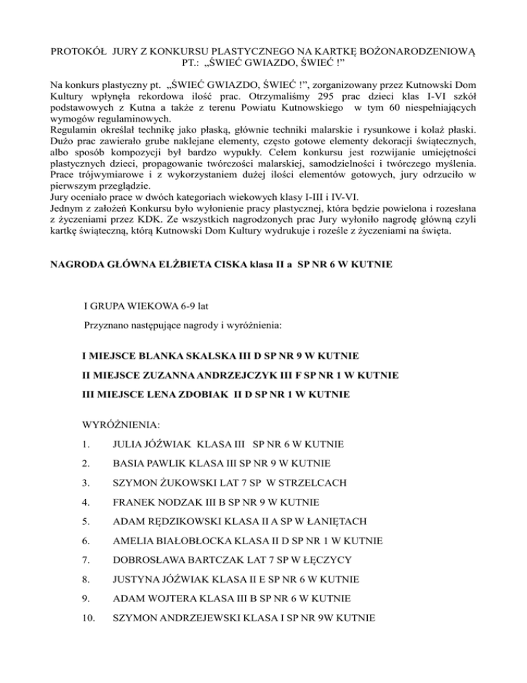 PROTOKÓŁ JURY Z KONKURSU PLASTYCZNEGO NA KARTKĘ BOŻONARODZENIOWĄ PT.: „ŚWIEĆ GWIAZDO, ŚWIEĆ !” Na konkurs plastyczny pt. „ŚWIEĆ GWIAZDO, ŚWIEĆ !”, zorganizowany przez Kutnowski Dom Kultury wpłynęła rekordowa ilość prac. Otrzymaliśmy 295 prac dzieci klas I-VI szkół podstawowych z Kutna a także z terenu Powiatu Kutnowskiego w tym 60 niespełniających wymogów regulaminowych. Regulamin określał technikę jako płaską, głównie techniki malarskie i rysunkowe i kolaż płaski. Dużo prac zawierało grube naklejane elementy, często gotowe elementy dekoracji świątecznych, albo sposób kompozycji był bardzo wypukły. Celem konkursu jest rozwijanie umiejętności plastycznych dzieci, propagowanie twórczości malarskiej, samodzielności i twórczego myślenia. Prace trójwymiarowe i z wykorzystaniem dużej ilości elementów gotowych, jury odrzuciło w pierwszym przeglądzie. Jury oceniało prace w dwóch kategoriach wiekowych klasy I-III i IV-VI. Jednym z założeń Konkursu było wyłonienie pracy plastycznej, która będzie powielona i rozesłana z życzeniami przez KDK. Ze wszystkich nagrodzonych prac Jury wyłoniło nagrodę główną czyli kartkę świąteczną, którą Kutnowski Dom Kultury wydrukuje i roześle z życzeniami na święta. NAGRODA GŁÓWNA ELŻBIETA CISKA klasa II a SP NR 6 W KUTNIE I GRUPA WIEKOWA 6-9 lat Przyznano następujące nagrody i wyróżnienia: I MIEJSCE BLANKA SKALSKA III D SP NR 9 W KUTNIE II MIEJSCE ZUZANNA ANDRZEJCZYK III F SP NR 1 W KUTNIE III MIEJSCE LENA ZDOBIAK II D SP NR 1 W KUTNIE WYRÓŻNIENIA: 1. JULIA JÓŹWIAK KLASA III SP NR 6 W KUTNIE 2. BASIA PAWLIK KLASA III SP NR 9 W KUTNIE 3. SZYMON ŻUKOWSKI LAT 7 SP W STRZELCACH 4. FRANEK NODZAK III B SP NR 9 W KUTNIE 5. ADAM RĘDZIKOWSKI KLASA II A SP W ŁANIĘTACH 6. AMELIA BIAŁOBŁOCKA KLASA II D SP NR 1 W KUTNIE 7. DOBROSŁAWA BARTCZAK LAT 7 SP W ŁĘCZYCY 8. JUSTYNA JÓŹWIAK KLASA II E SP NR 6 W KUTNIE 9. ADAM WOJTERA KLASA III B SP NR 6 W KUTNIE 10. SZYMON ANDRZEJEWSKI KLASA I SP NR 9W KUTNIE II GRUPA WIEKOWA 10 - 13 lat Przyznano następujące nagrody i wyróżnienia: I MIEJSCE LIDIA GAJEWSKA KLASA VI C SP NR 1 W KUTNIE II MIEJSCE MARIA GÓRA KLASA IV SP NR 3 W ŁĘCZYCY II MIEJSCE JOANNA CHODOROWSKA KLASA VI B SP NR 4 W KUTNIE III MIEJSCE ZUZANNA FYK KLASA VI B SP NR 1 W KUTNIE WYRÓŻNIENIA: 1. WIKTORIA ROSIAK KLASA V A SP NR 4 W KUTNIE 2. ANIA KRYSIŃSKA KLASA V B SP NR 1 W KUTNIE 3. KLAUDIA KOWALSKA KLASA V E SP NR 1 W KUTNIE 4. NATALIA DĘBSKA KLASA VI SP NR 6 W KUTNIE 5. MATEUSZ KAŹMIERCZAK KLASA IV SP NR W 6 KUTNIE 6. KRYSTIAN KOPAŃSKI KLASA VI A SP NR 1 W KUTNIE 7. PATRYK KAMIŃSKI KLASA VI SP NR 5 W KUTNIE 8. MAGDALENA MILARSKA KLASA IV A SP NR 4 W KUTNIE 9. MALWINA ORGANIŚCIAK LAT 11 SP W IMIELNIE Dzieci otrzymają dyplomy i zestawy nagród ufundowane przez Kutnowski Dom Kultury. Uroczyste wręczenie nagród laureatom nastąpi 15 grudnia 2016 o godzinie 17.00 w bocznym foyer na I piętrze, w Kutnowskim Domu Kultury. Podpisy Jury: Agnieszka Dąbrowska-Walczak instruktor plastyki KDK ............................................................. Marta Fijałkowska - grafik KDK …........................................................... Karolina Łabęcka - instruktor plastyki KDK ................................................................. Kutno, 6 grudnia 2016 r