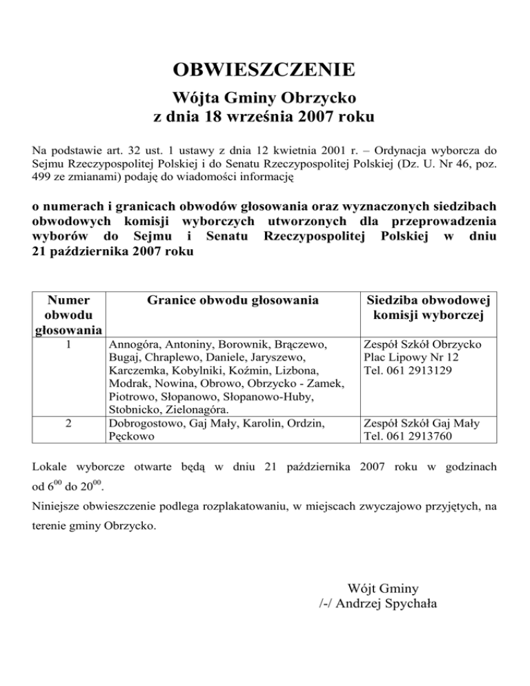 OBWIESZCZENIE Wójta Gminy Obrzycko z dnia 18 września 2007 roku Na podstawie art. 32 ust. 1 ustawy z dnia 12 kwietnia 2001 r. – Ordynacja wyborcza do Sejmu Rzeczypospolitej Polskiej i do Senatu Rzeczypospolitej Polskiej (Dz. U. Nr 46, poz. 499 ze zmianami) podaję do wiadomości informację o numerach i granicach obwodów głosowania oraz wyznaczonych siedzibach obwodowych komisji wyborczych utworzonych dla przeprowadzenia wyborów do Sejmu i Senatu Rzeczypospolitej Polskiej w dniu 21 października 2007 roku Numer obwodu głosowania 1 2 Granice obwodu głosowania Siedziba obwodowej komisji wyborczej Annogóra, Antoniny, Borownik, Brączewo, Bugaj, Chraplewo, Daniele, Jaryszewo, Karczemka, Kobylniki, Koźmin, Lizbona, Modrak, Nowina, Obrowo, Obrzycko - Zamek, Piotrowo, Słopanowo, Słopanowo-Huby, Stobnicko, Zielonagóra. Dobrogostowo, Gaj Mały, Karolin, Ordzin, Pęckowo Zespół Szkół Obrzycko Plac Lipowy Nr 12 Tel. 061 2913129 Zespół Szkół Gaj Mały Tel. 061 2913760 Lokale wyborcze otwarte będą w dniu 21 października 2007 roku w godzinach od 600 do 2000. Niniejsze obwieszczenie podlega rozplakatowaniu, w miejscach zwyczajowo przyjętych, na terenie gminy Obrzycko. Wójt Gminy /-/ Andrzej Spychała