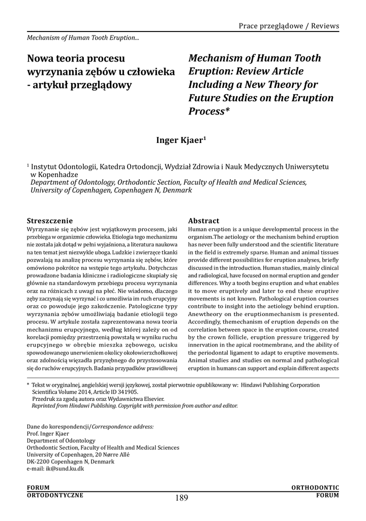 Prace przeglądowe / Reviews Mechanism of Human Tooth Eruption... Mechanism of Human Tooth Eruption: Review Article Including a New Theory for Future Studies on the Eruption Process* Nowa teoria procesu wyrzynania zębów u człowieka - artykuł przeglądowy Inger Kjaer1 1 Instytut Odontologii, Katedra Ortodoncji, Wydział Zdrowia i Nauk Medycznych Uniwersytetu w Kopenhadze Department of Odontology, Orthodontic Section, Faculty of Health and Medical Sciences, University of Copenhagen, Copenhagen N, Denmark Streszczenie Wyrzynanie się zębów jest wyjątkowym procesem, jaki przebiega w organizmie człowieka. Etiologia tego mechanizmu nie została jak dotąd w pełni wyjaśniona, a literatura naukowa na ten temat jest niezwykle uboga. Ludzkie i zwierzęce tkanki pozwalają na analizę procesu wyrzynania się zębów, które omówiono pokrótce na wstępie tego artykułu. Dotychczas prowadzone badania kliniczne i radiologiczne skupiały się głównie na standardowym przebiegu procesu wyrzynania oraz na różnicach z uwagi na płeć. Nie wiadomo, dlaczego zęby zaczynają się wyrzynać i co umożliwia im ruch erupcyjny oraz co powoduje jego zakończenie. Patologiczne typy wyrzynania zębów umożliwiają badanie etiologii tego procesu. W artykule została zaprezentowana nowa teoria mechanizmu erupcyjnego, według której zależy on od korelacji pomiędzy przestrzenią powstałą w wyniku ruchu erupcyjnego w obrębie mieszka zębowego, ucisku spowodowanego unerwieniem okolicy okołowierzchołkowej oraz zdolnością więzadła przyzębnego do przystosowania się do ruchów erupcyjnych. Badania przypadków prawidłowej Abstract Human eruption is a unique developmental process in the organism.The aetiology or the mechanism behind eruption has never been fully understood and the scientific literature in the field is extremely sparse. Human and animal tissues provide different possibilities for eruption analyses, briefly discussed in the introduction. Human studies, mainly clinical and radiological, have focused on normal eruption and gender differences. Why a tooth begins eruption and what enables it to move eruptively and later to end these eruptive movements is not known. Pathological eruption courses contribute to insight into the aetiology behind eruption. Anewtheory on the eruptionmechanism is presented. Accordingly, themechanism of eruption depends on the correlation between space in the eruption course, created by the crown follicle, eruption pressure triggered by innervation in the apical rootmembrane, and the ability of the periodontal ligament to adapt to eruptive movements. Animal studies and studies on normal and pathological eruption in humans can support and explain different aspects * Tekst w oryginalnej, angielskiej wersji językowej, został pierwotnie opublikowany w: Hindawi Publishing Corporation Scientifica Volume 2014, Article ID 341905. Przedruk za zgodą autora oraz Wydawnictwa Elsevier. Reprinted from Hindawi Publishing. Copyright with permission from author and editor. Dane do korespondencji/correspondence address: Prof. Inger Kjaer Department of Odontology Orthodontic Section, Faculty of Health and Medical Sciences University of Copenhagen, 20 Nørre Allé DK-2200 Copenhagen N, Denmark e-mail: [email protected] ForumOrthodontic Ortodontyczneforum 189 Badania kliniczne / Clinical research I. Kjaer i patologicznej erupcji zębów u ludzi i zwierząt pomagają wyjaśnić różne aspekty prezentowanej teorii. Mechanizm wyrzynania się zębów wciąż wymaga dalszych badań, dlatego autorka sugeruje, aby dalsze obserwacje tego procesu brały pod uwagę jej teorię erupcyjną. Uważa bowiem, że zrozumienie etiologii procesu erupcyjnego jest niezbędnym wymogiem w leczeniu nieprawidłowych procesów wyrzynania się zębów. Wprowadzenie Badania nad wyrzynaniem się zębów są prowadzone zarówno na tkankach zwierzęcych, jak i ludzkich. W przypadku zwierząt jest możliwe przeprowadzenie przekrojowych badań histologicznych i immunohistochemicznych nad procesem erupcji z wykorzystaniem samych zębów oraz sąsiadującej błony ozębnej i tkanki kostnej, co nie jest możliwe w przypadku tkanek ludzkich. Proces wyrzynania, zarówno prawidłowy jak i patologiczny, był badany w toku rozległych analiz materiału ludzkiego. Badania kliniczne i radiologiczne prowadzono zarówno w przypadku tkanek zwierzęcych, jak i ludzkich. W publikacjach analizujących proces erupcji stwierdza się zazwyczaj, że jej mechanizmy wciąż nie zostały w pełni rozpoznane. Eksperymentalne badania na zwierzętach Eksperymentalne badania nad materiałem pochodzenia zwierzęcego wskazują, że mieszek zębowy odgrywa ważną rolę w procesie erupcji, formując ścieżkę ruchu korony przez leżącą nad nią tkankę (1–3). Badanie eksperymentalne Marksa i Cahilla (1), poświęcone skutkom chirurgicznego usunięcia poszczególnych części mieszka, wykazało, że usunięcie zarówno części korzeniowej jak i koronowej mieszka zębowego zapobiega wyrzynaniu. Autorzy cytowanego opracowania zauważyli również, że droga wyrzynania powstająca w wyniku resorpcji kości po usunięciu mieszka zębowego ulega zatrzymaniu. Wobec tego wywnioskowali, że resorpcja oraz formowanie tkanki kostnej wyrostka zębodołowego zachodzące w okolicy wyrzynającego się zęba są regulowane elementami przylegającymi do usuniętego mieszka zębowego (1). W innym badaniu eksperymentalnym (2, Wise et al.) wstrzykiwano szczurom rozpuszczalną formę deksametazonu w celu przeanalizowania jego wpływu na proces wyrzynania się zębów. Jak wykazali autorzy badania, iniekcje z deksametazonu przyspieszyły proces erupcji w przypadku siekaczy, lecz pozostały bez wpływu na wyrzynanie się trzonowców. Zęby sieczne u szczurów wyrzynają się stale, podczas gdy trzonowce – podobnie jak w przypadku zębów ludzkich – są poddane erupcji w stopniu ograniczonym. Dlatego autorzy eksperymentu doszli do wniosku, że wszelki